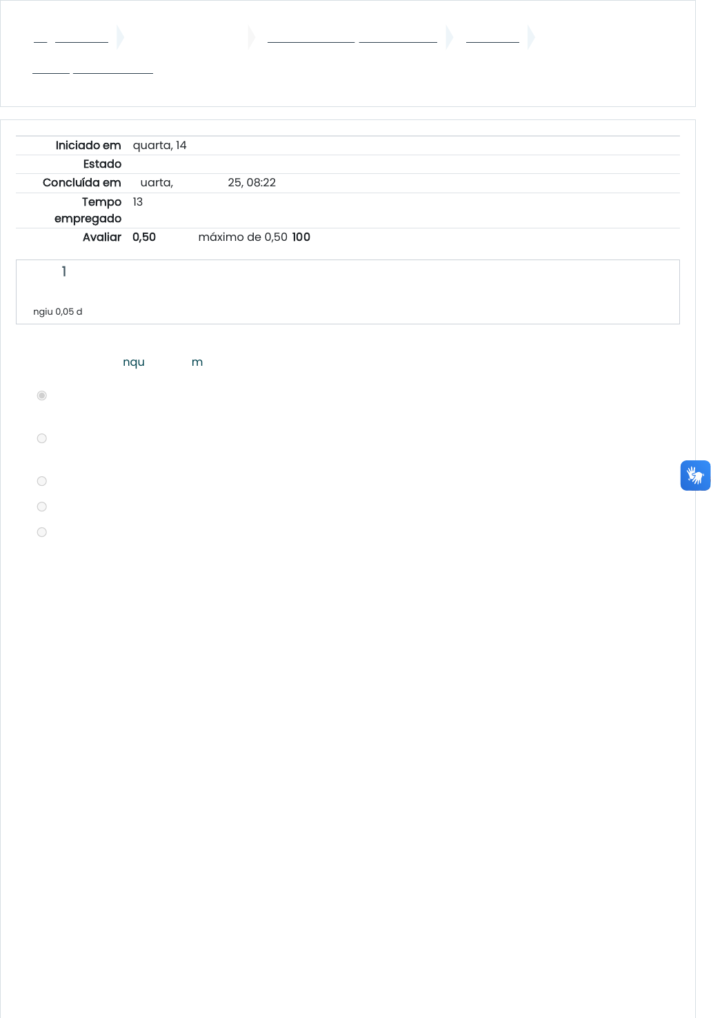 Página inicial Minhas disciplinas 2025/2 - Avaliação Nutricional UNIDADE I Avaliação - Unidade I Iniciado em quarta, 14 mai 2025, 08:08 Estado Finalizada Concluída em quarta, 14 mai 2025, 08:22 Tempo empregado 13 minutos 57 segundos Avaliar 0,50 de um máximo de 0,50(100%) Questão 1 Completo Atingiu 0,05 de 0,05 Em relação aos inquéritos alimentares, assinale a alternativa correta: a. Uma das vantagens do questionário de frequência alimentar é que consiste em um instrumento que pode ser auto administrado. b. O recordatório de 24 horas não é um método considerado fácil nem rápido de ser administrado, por depender da memória do entrevistado. c. Não existe nenhum inquérito alimentar de caráter qualitativo. d. A história alimentar não fornece uma boa descrição da ingestão usual. e. No registro alimentar, o indivíduo anota todos os alimentos e bebidas que consumiu em determinado período. Devido à sua alta precisão quantitativa, é considerado o padrão ouro dentre todos os tipos de inquéritos alimentares. A resposta correta é: Uma das vantagens do questionário de frequência alimentar é que consiste em um instrumento que pode ser auto administrado. https://ambienteonline.uninga.br/ https://ambienteonline.uninga.br/course/view.php?id=34259 https://ambienteonline.uninga.br/course/view.php?id=34259§ion=3 https://ambienteonline.uninga.br/mod/quiz/view.php?id=953432 Questão 2 Completo Atingiu 0,05 de 0,05 Questão 3 Completo Atingiu 0,05 de 0,05 Com relação aos instrumentos utilizados na avaliação do consumo alimentar das pessoas, julgue os itens a seguir: I - O questionário de frequência alimentar é um método retrospectivo de avaliação da ingestão de alimentos em determinado período. II - O recordatório de 24 horas é um método de avaliação de consumo alimentar que permite inferir acerca do grau de adequação do consumo de macronutrientes. III - A importância da avaliação do consumo alimentar em crianças reside no fato de que deficiências quantitativas e/ou qualitativas do consumo acarretam, no curto prazo, atrasos pôndero-estaturais. Estão certos apenas os itens: a. I e II. b. II e III. c. I, II e III. d. Nenhuma das alternativas. e. I e III. A resposta correta é: I e II. Em uma visita domiciliar, você encontra uma família cujo chefe é um idoso, Sr. S.P, 70 anos, cadeirante (amputação dos membros inferiores), diabético, hipertenso, aparentemente magro. Ele reside com a esposa, uma filha e dois netos. Considerando a história familiar, você decide avaliar o consumo alimentar deste casal. Considerando o baixo nível de escolaridade de ambos, você opta pela aplicação de um recordatório de 24 horas, mesmo conhecendo as vantagens e desvantagens do método de avaliação dietética. Constituem vantagens desse método a alternativa: a. Recordatórios seriados podem estimar a ingestão habitual b. A ingestão relatada pode ser atípica. c. Depende da memória do entrevistado. d. Um único recordatório não estima a dieta habitual. e. Pode não considerar a variabilidade do consumo de alimentos, portanto o recordatório 24 horas não reflete o consumo do indivíduo. A resposta correta é: Recordatórios seriados podem estimar a ingestão habitual Questão 4 Completo Atingiu 0,05 de 0,05 Os métodos de investigação do consumo alimentar são as ferramentas que permitem avaliar a ingestão alimentar de nutrientes para manutenção da saúde e prevenção de doenças. Nesse contexto, assinale a alternativa correta: a. História alimentar avalia o consumo habitual por meio de uma extensa entrevista, gerando informações sobre hábitos alimentares atuais e passados, número de refeições, apetite, preferências alimentares, R 24 horas com mais detalhes, frequência do consumo de alimentos, informações adicionais sobre uso de fumo e prática de exercícios físicos. Oferece a descrição da dieta usual, podendo ser utilizado em estudos longitudinais. É o mais rápido, prático e completo. b. Recordatório 24 horas define e identifica todos os alimentos e bebidas ingeridas no período anterior a entrevista, que pode ser às 24 horas precedentes ou mais. Método útil quando se deseja conhecer a ingestão média de energia e nutrientes. É conduzido por meio de entrevista pessoal por uma pessoa treinada. É necessário que o sujeito responda detalhadamente sobre o tamanho e volume da porção consumida. É de rápida aplicação e avalia a dieta atual e estima valores absolutos ou relativos da ingestão de energia. c. Registro alimentar recolhe a informação sobre a ingestão atual. O registro pode ser estimado ou por peso. A vantagem desse método é possibilitar maior adesão por ambos os sexos, favorecer o registro do tamanho das porções e computar as sobras. d. Os métodos prospectivos registram a informação do passado e os métodos retrospectivos colhem a informação do presente imediato ou de longo prazo. e. Questionário de frequência alimentar obtém informação qualitativa, semiquantitativa ou quantitativa ou quantitativa sobre o padrão alimentar e a ingestão de alimentos, com objetivo de conhecer o consumo habitual, contemplando o registro da frequência de consumo em unidades de tempo. É um método de alto custo e requer muita especialização do entrevistador. A resposta correta é: Recordatório 24 horas define e identifica todos os alimentos e bebidas ingeridas no período anterior a entrevista, que pode ser às 24 horas precedentes ou mais. Método útil quando se deseja conhecer a ingestão média de energia e nutrientes. É conduzido por meio de entrevista pessoal por uma pessoa treinada. É necessário que o sujeito responda detalhadamente sobre o tamanho e volume da porção consumida. É de rápida aplicação e avalia a dieta atual e estima valores absolutos ou relativos da ingestão de energia. Questão 5 Completo Atingiu 0,05 de 0,05 Questão 6 Completo Atingiu 0,05 de 0,05 A base de toda intervenç