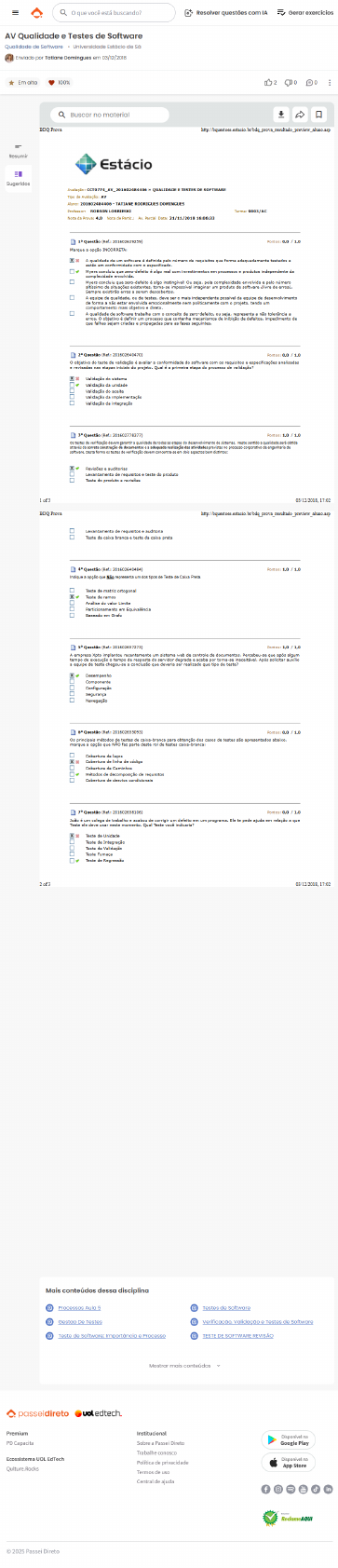 voce esta AV Qualidade e Testes de Software de Software Universidade Estácio Enviado por Tatiane Domingues em 03/12/2018 * 100% Do Buscar no material BDQ Prova http: /bquestoes estacio resultado _preview aluno.asp = Estácio Sugeridos CCT0774 AV 201602484406 QUALIDADE TESTES DE SOFTWARE Avalação 201602484406 TATIANE RODRIGUES DOMINGUES ROBSON LORBIESKI Turma 9003/AC Nota 4.0 Nota Parcial Data 21/11/2018 16:06:33 Pontos D (Ref.: 201602639259) Marque opção INCORRETA A qualidade software definida pelo requisitos que forma adequadamente testados estão Myers concluiu que zero real com investimentos produtos independent da Myers que imaginar produte software algo seja. envolvida pelo numero erros deve mais equipe desenvolvimento tendo de forma estar nen politicament projeto objetivo A qualida qualidade de software trabalha com conceito defini que inibição de que falhas criadas sejam propagadas D Questão (Ref. 201602640470) Pontos objetivo do teste d validação avaliar conformidade software com requisitos especificações analisadas etapa iniciais projeto. Qual primeira etapa processo validação? Validação sistema Validação unidade Validação aceite Validação implementação Validação integração D Questão (Ref. istemas atividades engenharia de software Desta forma verificação distintos . auditorias Levantamento produto Teste produto revisões 03/12/2018 17:02 1 of 3 BDQ Prova http /bquestoes estacio resultado preview aluno.asp Levantamento requisitos auditoria Teste caixa branca caixa preta Questão Pontos represent um Teste matriz ortogonal ramos Limite Particio Equivalência Baseado Grafo D Questão (Ref. 201602657273 tempo tempo resposta Xptc implantou sistema de controle document documentos. Percebeu-se solicitar após algum teste que deveria ser realizado teste? Desempenho Configuração Segurança Navegação D (Ref. Pontos Os tester para obtenção de são apresentados opção faz parte deste testes caixa lacos linha Cobertu requisitos Cobertu desvios condicionais D Questão (Ref. 201602658106) João trabalho corrigir um em um programa Ele pede ajuda Teste Qual Teste Unidade Teste Integração Teste Teste Teste Fumaça Teste Regressão 03/12/2018 17:02 2 of 3 Mais dessa disciplina Processos Aula 5 Gestao Testes Testes de Software Teste de Software Processo mais conteúdos passeidireto Premium Institucional PD Capacita Sobre Passei Direto Google Play Trabalhe
