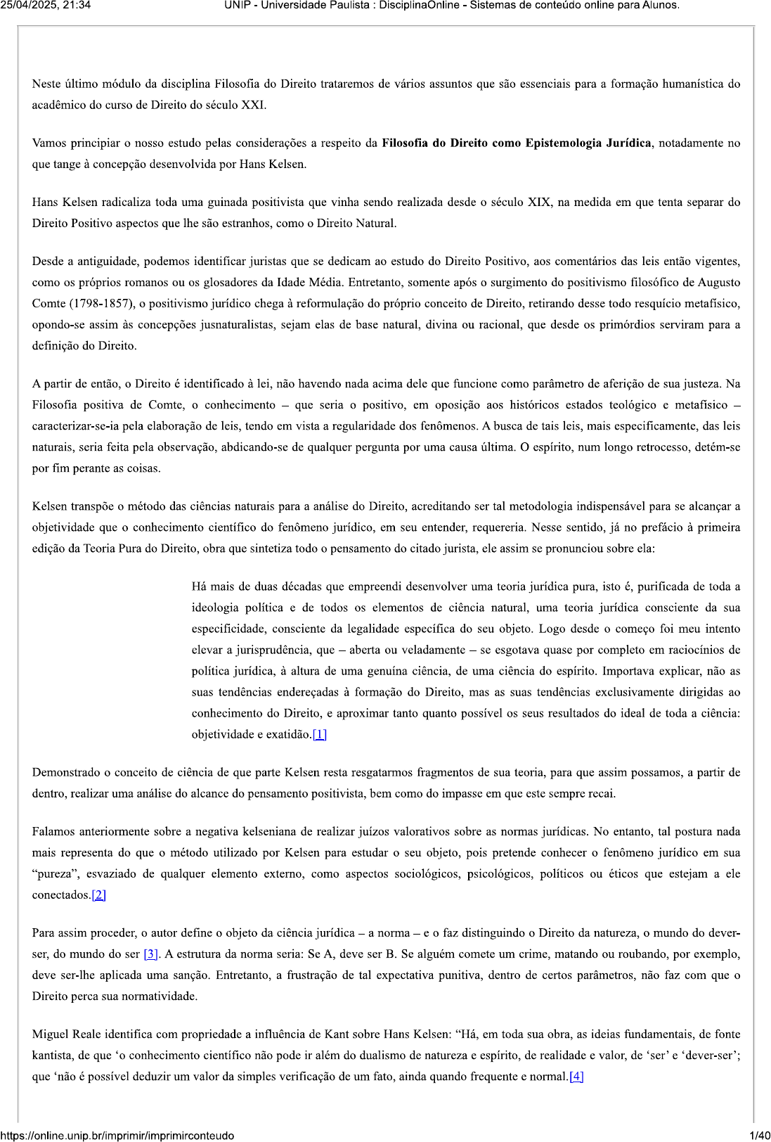 25/04/2025, 21:34 UNIP Universidade Paulista : DisciplinaOnline Sistemas de conteúdo online para Alunos. Neste último módulo da disciplina Filosofia do Direito trataremos de vários assuntos que são essenciais para a formação humanística do acadêmico do curso de Direito do século XXI. Vamos principiar o nosso estudo pelas considerações a respeito da Filosofia do Direito como Epistemologia Jurídica, notadamente no que tange à concepção desenvolvida por Hans Kelsen. Hans Kelsen radicaliza toda uma guinada positivista que vinha sendo realizada desde o século XIX, na medida em que tenta separar do Direito Positivo aspectos que lhe são estranhos, como o Direito Natural. Desde a antiguidade, podemos identificar juristas que se dedicam ao estudo do Direito Positivo, aos comentários das leis então vigentes, como os próprios romanos ou os glosadores da Idade Média. Entretanto, somente após o surgimento do positivismo filosófico de Augusto Comte (1798-1857), o positivismo jurídico chega à reformulação do próprio conceito de Direito, retirando desse todo resquício metafísico, opondo-se assim às concepções jusnaturalistas, sejam elas de base natural, divina ou racional, que desde os primórdios serviram para a definição do Direito. A partir de então, o Direito é identificado à lei, não havendo nada acima dele que funcione como parâmetro de aferição de sua justeza. Na Filosofia positiva de Comte, o conhecimento - que seria o positivo, em oposição aos históricos estados teológico e metafísico - pela elaboração de leis, tendo em vista a regularidade dos fenômenos. A busca de tais leis, mais especificamente, das leis naturais, seria feita pela observação, abdicando-se de qualquer pergunta por uma causa última. espírito, num longo retrocesso, detém-se por fim perante as coisas. Kelsen transpõe o método das ciências naturais para a análise do Direito, acreditando ser tal metodologia indispensável para se alcançar a objetividade que o conhecimento científico do fenômeno jurídico, em seu entender, requereria. Nesse sentido, já no prefácio à primeira edição da Teoria Pura do Direito, obra que sintetiza todo o pensamento do citado jurista, ele assim se pronunciou sobre ela: Há mais de duas décadas que empreendi desenvolver uma teoria jurídica pura, isto é, purificada de toda a ideologia política e de todos os elementos de ciência natural, uma teoria jurídica consciente da sua especificidade, consciente da legalidade específica do seu objeto. Logo desde o começo foi meu intento elevar a jurisprudência, que - aberta ou veladamente - se esgotava quase por completo em raciocínios de política jurídica, à altura de uma genuína ciência, de uma ciência do espírito. Importava explicar, não as suas tendências endereçadas à formação do Direito, mas as suas tendências exclusivamente dirigidas ao conhecimento do Direito, e aproximar tanto quanto possível os seus resultados do ideal de toda a ciência: objetividade e Demonstrado o conceito de ciência de que parte Kelsen resta resgatarmos fragmentos de sua teoria, para que assim possamos, a partir de dentro, realizar uma análise do alcance do pensamento positivista, bem como do impasse em que este sempre recai. Falamos anteriormente sobre a negativa kelseniana de realizar juízos valorativos sobre as normas jurídicas. No entanto, tal postura nada mais representa do que o método utilizado por Kelsen para estudar o seu objeto, pois pretende conhecer o fenômeno jurídico em sua "pureza", esvaziado de qualquer elemento externo, como aspectos sociológicos, psicológicos, políticos ou éticos que estejam a ele conectados.[2 Para assim proceder, o autor define o objeto da ciência jurídica - a norma - e o faz distinguindo o Direito da natureza, o mundo do dever- ser, do mundo do ser [3]. A estrutura da norma seria: Se A, deve ser B. Se alguém comete um crime, matando ou roubando, por exemplo, deve ser-lhe aplicada uma sanção. Entretanto, a frustração de tal expectativa punitiva, dentro de certos parâmetros, não faz com que o Direito perca sua normatividade. Miguel Reale identifica com propriedade a influência de Kant sobre Hans Kelsen: "Há, em toda sua obra, as ideias fundamentais, de fonte kantista, de que 'o conhecimento científico não pode ir além do dualismo de natureza e espírito, de realidade e valor, de 'ser' e 'dever-ser'; que 'não é possível deduzir um valor da simples verificação de um fato, ainda quando frequente e normal. [4] https://online.unip.br/imprimir/imprimirconteudo 1/4025/04/2025, 21:34 UNIP Universidade Paulista : DisciplinaOnline Sistemas de conteúdo online para Alunos. Apesar de Kelsen afirmar que a validade, a existência de uma norma independe de sua eficácia, pois admitir o contrário seria reduzir o Direito, o dever-ser, ao ser, o próprio autor admite que um mínimo de eficácia é essencial para a própria validade das normas jurídicas, o que representa uma ruptura de seu pressuposto epistemológico, na medida em que a "pureza" do Direito é relativizada pela introdução dessa dimensão Kelsen considera a norma jurídica como um esquema de interpretação do mundo, pois, partindo da distinção entre os dois mundos, ser e dever-ser, afirma que o que interessa ao jurista não são os fatos, mas a significação jurídica a eles atribuída. Por exemplo, a morte de uma pessoa, um fato natural, pode ter relevância jurídica quando, por exemplo, o falecido deixa bens, devendo então ser aberta sua sucessão, legítima ou testamentária. Entendemos então por que milhões de mortes de combatentes inimigos em uma guerra podem criar heróis e gerar condecorações, enquanto matar uma única pessoa pode privar o autor de sua liberdade para exigir de alguém qualquer soma em dinheiro. Esse exemplo ilustra o sistema escalonado de normas tal como desenvolvido por Kelsen, pois este considera que a validade de uma norma, ou seja, seu sentido