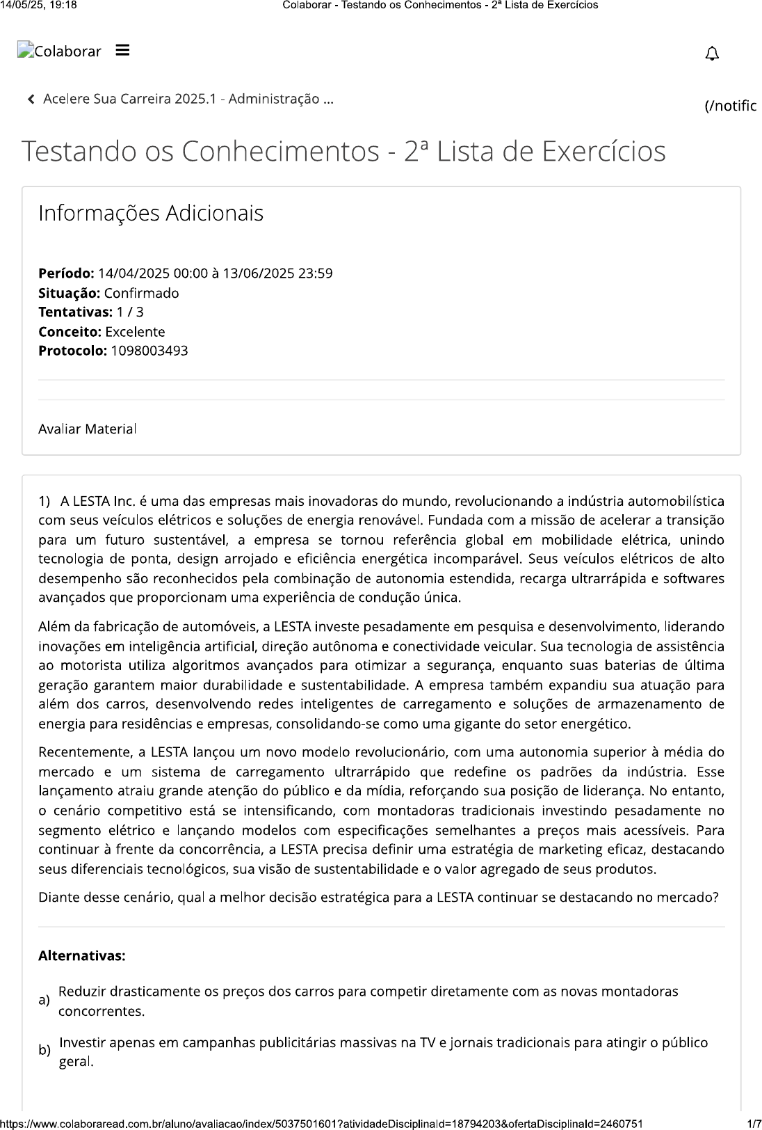 14/05/25, 19:18 Colaborar Testando os Conhecimentos - Lista de Exercícios Colaborar14/05/25, 19:18 Colaborar Testando os Conhecimentos - Lista de Exercícios Ampliar sua rede de carregamento e oferecer vantagens exclusivas para clientes c) Alternativa assinalada LESTA. d) Focar apenas no mercado de luxo, deixando de lado os modelos mais acessíveis. e) Diminuir os investimentos em inovação para reduzir custos operacionais e aumentar a margem de lucro. 2) A BabyTech, uma startup do setor de fraldas, está revolucionando o mercado ao desenvolver produtos com tecnologia de monitoramento de umidade e indicadores de saúde para bebês. A empresa utiliza sensores inteligentes embutidos nas fraldas, conectados a um aplicativo que alerta os pais sobre a necessidade de troca e possíveis sinais de irritação na pele do bebê. Com a crescente concorrência e o avanço das grandes marcas tradicionais, a BabyTech precisa adotar estratégias inovadoras para manter seu crescimento e ampliar sua participação de mercado. Com base nos princípios da gestão organizacional, onde processo decisório deve ser flexível e adaptável às circunstâncias, qual afirmativa melhor reflete a efetividade dessas abordagens. A BabyTech pode fortalecer sua vantagem competitiva ao firmar parcerias com hospitais e pediatras, utilizando sua tecnologia para oferecer soluções personalizadas e recomendações médicas baseadas nos dados coletados. Para ampliar seu alcance, a empresa deve investir em uma estratégia omnichannel, garantindo que as fraldas tecnológicas sejam vendidas tanto em lojas físicas quanto online, com integração de experiência para o consumidor. III - Reduzir significativamente os investimentos em inovação e tecnologia pode ser uma estratégia viável para a BabyTech, pois permite oferecer preços mais competitivos e se igualar às grandes marcas tradicionais. Considerando o contexto apresentado, é correto o que se afirma em: Alternativas: a) apenas. b) apenas. c) apenas. Alternativa assinalada d) e III apenas. e) I, II, III e IV. 3) A empresa "Luz e Fogo S.A." é uma indústria que fabrica e vende fósforos e velas. Recentemente, a empresa decidiu investir em um sistema de gestão da informação e análise de dados para melhorar a eficiência operacional e aumentar as vendas. O sistema foi implementado para coletar dados de produção, vendas, estoque e feedback dos clientes. Com base nesses dados, a empresa espera tomar decisões mais informadas sobre produção, marketing e logística Com base no contexto apresentado, avalie as seguintes asserções e a relação proposta entre elas. 2/714/05/25, 19:18 Colaborar Testando os Conhecimentos - Lista de Exercícios A implementação de um sistema de gestão da informação na "Luz e Fogo S.A." pode ajudar a empresa a identificar gargalos na produção. PORQUE II sistema de gestão da informação permite a coleta e análise de dados em tempo real, facilitando a identificação de problemas operacionais. A respeito dessas asserções, assinale a alternativa correta: Alternativas: a) As asserções e são proposições verdadeiras, mas a não justifica a I. b) As asserções e são proposições verdadeiras e a justifica a I. Alternativa assinalada c) A asserção é uma proposição verdadeira e a II, falsa. d) A asserção é uma proposição falsa e a II, verdadeira. e) As asserções e são proposições falsas. 4) O restaurante Sabor & Saúde atua no setor de alimentação, oferecendo refeições e marmitas saudáveis para trabalhadores e famílias que buscam praticidade sem abrir mão da qualidade. Com o crescimento da demanda por delivery, a empresa percebeu a necessidade de otimizar sua produção e melhorar sua gestão estratégica. Diante desse cenário, o proprietário decidiu aplicar conceitos das Teorias da Administração para aprimorar seus processos. Inspirado na Administração Científica de Taylor, ele implementou um sistema organizado por padrões na produção das marmitas, reduzindo desperdícios e aumentando a produtividade. Além disso, adotou princípios da Teoria Clássica de Fayol, organizando melhor os setores da empresa e estruturando as funções dos colaboradores. Com a transformação digital e o crescimento do mercado de aplicativos de entrega, o Sabor & Saúde busca agora aprimorar sua presença online, adotando novas tecnologias para fidelizar clientes e garantir vantagem competitiva no setor. Considerando a importância da aplicação das Teorias da Administração no desenvolvimento organizacional, estratégico, mercadológico e tecnológico do restaurante Sabor & Saúde, assinale a alternativa correta. Alternativas: A Administração Científica propõe a padronização dos processos produtivos, a) buscando maior eficiência, o que pode contribuir para a redução de desperdícios e Alternativa assinalada aumento da produtividade no restaurante. A Teoria Clássica de Fayol enfatiza a flexibilidade total nas funções dos colaboradores, sem necessidade b) de hierarquia ou divisão clara de responsabilidades dentro da organização. A adoção de tecnologias no setor de alimentação reduz a necessidade de aplicar princípios c) administrativos, pois a automação elimina a importância da gestão estratégica. d) O crescimento do delivery e a presença digital não influenciam a competitividade do restaurante, já que a qualidade dos alimentos é o único fator determinante para o sucesso do negócio. A Administração Científica e a Teoria Clássica não podem ser aplicadas em pequenos negócios como o e) restaurante, pois foram desenvolvidas exclusivamente para grandes indústrias. 3/714/05/25, 19:18 Colaborar Testando os Conhecimentos - Lista de Exercícios 5) A empresa EcoPrint, especializada na produção de papéis e embalagens sustentáveis, decidiu expandir seus negócios para o mercado digital. Com o aumento da preocupação ambiental dos consumidores, a demanda por alternativas ecológicas cre
