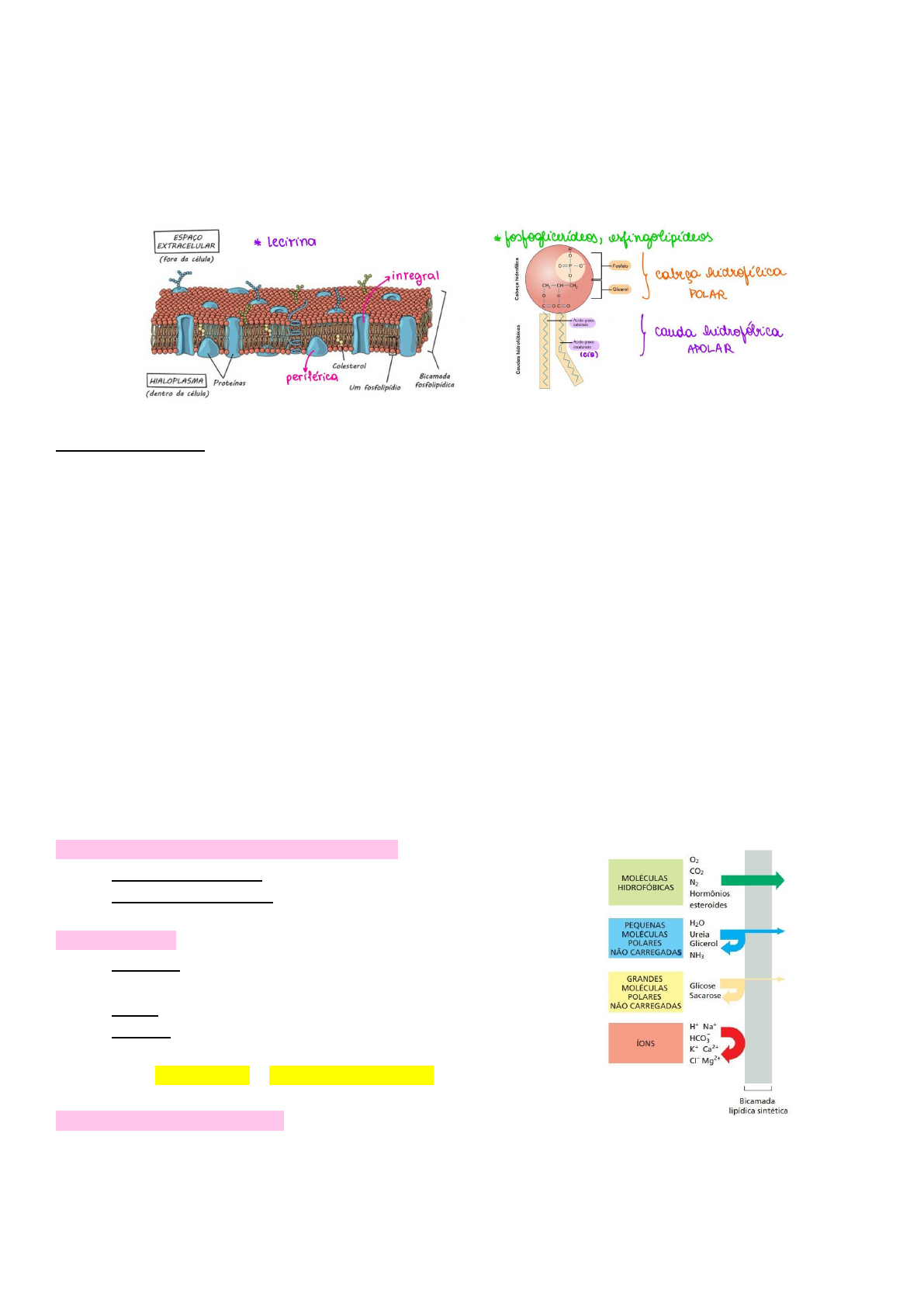 MEMBRANA CELULAR ANIMAL ➔ Estrutura que delimita a célula, arcabouço que contém todo o material celular ➔ Semipermeável (tamanho da molécula/carga elétrica/polaridade) e seletiva (controle ativo/especificidade) MOSAICO FLUIDO: deslocamento lateral das moléculas presentes na membrana, permite que a célula mude sua forma e se adapte às condições ● Proteínas integrais: atravessam totalmente a MP, possuem regiões hidrofóbicas e hidrofílicas ➢ Transmembranas ou monotópicas - Transporte passivo para substâncias hidrossolúveis (íons, glicose, ureia, …) - Transporte ativo ● Proteínas periféricas: associadas à superfície interna ou externa da MP - Ancoragem, transdução de sinais, atividade enzimática ● Carboidratos de membrana - Localizados no lado exterior - Maioria com carga negativa (carboxilatos e fosfatos), conferem carga negativa às PTN - Pontos de ligação entre diferentes céls, adesão (ex: caderina) e reconhecimento celular - Receptores hormonais, podendo emitir segundos mensageiros p/ cascata de reações - Podem funcionar como marcadores imunológicos de membrana Passagem de substâncias pela membrana ➢ Subst. lipossolúveis: através da bicamada lipídica ➢ Subst. hidrossolúveis: através das PNT da membrana Canais iônicos ➢ Passivos: permanecem permeáveis à passagem de íons indefinidamente, difusão nas duas direções. ➢ Ativos: voltagem-dependentes ➢ Inativos: com partícula inativadora que fecha o canal indepentemente da voltagem OBS: TODO canal inativo é voltagem-dependente Seletividade do canal iônico 1) Cargas do canal e do íon OPOSTAS 2) Camada de solvatação e diâmetro efetivo do íon 3) Compatibilidade entre a camada de solvatação e o ponto de contato do canal Canal de K+ Canal de Na+ Bomba de Na+/K+ ATPase: mantém o gradiente de íons ➢ Move os íons CONTRA O GRADIENTE DE CONCENTRAÇÃO com gasto de ATP ● Expulsa 3 íons de Na⁺ para o meio externo e traz 2 íons K⁺ para o citoplasma ➢ Controla o influxo de água ● Na⁺ atrai as moléculas de água para o meio externo OBS: a bomba independe da voltagem, irá atuar caso haja disponibilidade de ATP Potencial de equilíbrio de difusão passiva: não há movimento líquido do íon ➔ Exemplo: Na⁺ (principal íon extracelular) 1) Na⁺ entra passivamente na célula por canais de difusão 2) Com a entrada dos íons positivos, o meio extracelular fica cada vez mais negativo, gerando uma força elétrica no sentido contrário da difusão 3) Quanto mais Na+ entra, mais o meio externo fica negativo, até que FORÇA DE ATRAÇÃO = FORÇA DO GRADIENTE (com direções opostas) 4) Concentrações finais de íons Na⁺ intra e extracelulares não são iguais devido ao equilíbrio das forças, impedindo que mais íons Na⁺ entrem na célula OBS: sem gasto energético para que o ponto de equilíbrio seja alcançado E ⁺= -80 mV (proporção 1:20 - 5mM no EXTERIOR e 100 mM no INTERIOR) ➔ A partir de -81 mV (mais negativo): entrada de K⁺ ➔ A partir de -79 mV (mais positivo): saída de K⁺ Eᴺᵃ⁺= 62 mV (proporção 10:1 - 150 mM no EXTERIOR e 15 mM no INTERIOR) ➔ A partir de 61 mV (mais negativo): entrada de Na⁺ ➔ A partir de 63 mV (mais positivo): saída de Na⁺ OBS: caso o potencial de membrana seja MAIS POSITIVO que o potencial de equilíbrio de um íon, o gradiente químico favorece a SAÍDA do íon. Quanto maior a diferença, maior o grad Potencial de membrana ❖ Todas as membranas celulares têm um potencial de membrana que é utilizado para: ➔ condução de impulsos elétricos (ex: neurônios) ➔ gerar impulsos elétricos (ex: céls no nodo sinusal) ➔ tornar-se excitável ao estímulo elétrico (ex: céls musculares) ● Constante e estável em uma cél em repouso ● O potencial de memb é dado pela diferença de voltagem entre o meio interior e meio o exterior (Vmemb = Vint - Vext) ➔ Se o valor for NEGATIVO, o meio interno está mais negativo que o exterior ❖ Potencial de repouso típico: -65mV, mantido quando a cél não está gerando impulso Potencial de Ação ➢ Impulso elétrico (variação de voltagem), limitado no tempo, que é conduzido através da membrana de um neurônio para a transmissão de sinais. ● Fases: repouso, despolarização (lenta e rápida), repolarização e hiperpolarização I. Repouso ● Constante e estável até que um PA proveniente de outra parte da membrana celular chegue até ele. ● Mantido por dois fatores: potencial de equilíbrio de difusão passiva dos íons e bomba de sódio e potássio ATPase II. Despolarização ● Primeira fase efetiva do PA, fase de crescimento ● Fator que desencadeia: entrada de grande quantidade de íons Na⁺ para o interior da cél ❖ Despolarização lenta: - Quando um PA se aproxima de um local da membrana em repouso, o excesso de Na⁺ presente na região já afetada PA passa para o segmento seguinte do axônio por difusão a favor do gradiente de concentração e do gradiente elétrico. - A elevação da concentração do Na⁺ no segmento seguinte causa um lento aumento do potencial (mais positivo). - Isso ocorre até que se alcance o Limiar para o disparo do Potencial de Ação, onde os canais de sódio voltagem-dependentes se abrem, provocando uma entrada maciça de íons Na⁺ no meio intracelular. ❖ Despolarização rápida - Fase em que todos os canais voltagem-dependente de sódio estão abertos sem a ação da partícula inativadora, a entrada de sódio é rápida e intensa. - Em um determinado ponto, normalmente com a DDP significativamente positiva, o sódio para de entrar na célula devido ao acúmulo de cargas positivas no seu interior, cessando a ascensão da onda elétrica do potencial de ação. III. Repolarização ● Fator que desencadeia: inativação dos canais de Na⁺ e saída de íons K⁺ pelos canais ● Os canais voltagem-dependentes de K⁺ começam se abrir pouquíssimo tempo após os de Na⁺, mas de maneira lenta e gra