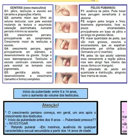 GENITAIS (sexo masculino) PELOS PUBIANOS: G1: testiculos escroto em ausência de Pode tamanho e proporções leve penugem semelhante à do G2: aumento maior que 04ml do abdome volume com pele escrotal P2: surgem pelos longos e mudando de textura e assumindo levemente lisos ou coloração Aumento pouco peniano ou ausente. principalmente em base de e G3: crescimento 30 longo de grandes principalmente em P3: maior quantidade de que Crescimento maior de testiculos e são mais escuros e que se espalham G4: crescimento agora difusamente por sinfise principalmente em e (formando um U invertido) desenvolvimento da glande. Surge P4: pelos tipo cobrindo Testiculos e mais densamente região escroto continuam com mas sem atingir face interna das pele escrotal se tornando mais coxas um triangulo) P5 pilosidade do adulto em G5: com quantidade e atingindo desenvolvimento e crescimento face de coxas. (tamanho e forma) Inicio da puberdade: entre 9 a 14 anos, com aumento do volume dos Atenção! crescimento peniano começa, em geral, um ano após crescimento dos da puberdade antes dos 9 anos Puberdade precoce?? INVESTIGAR não Retardo puberal meninos, ausência de qualquer caracteristica sexual secundária a partir dos 14 anos de