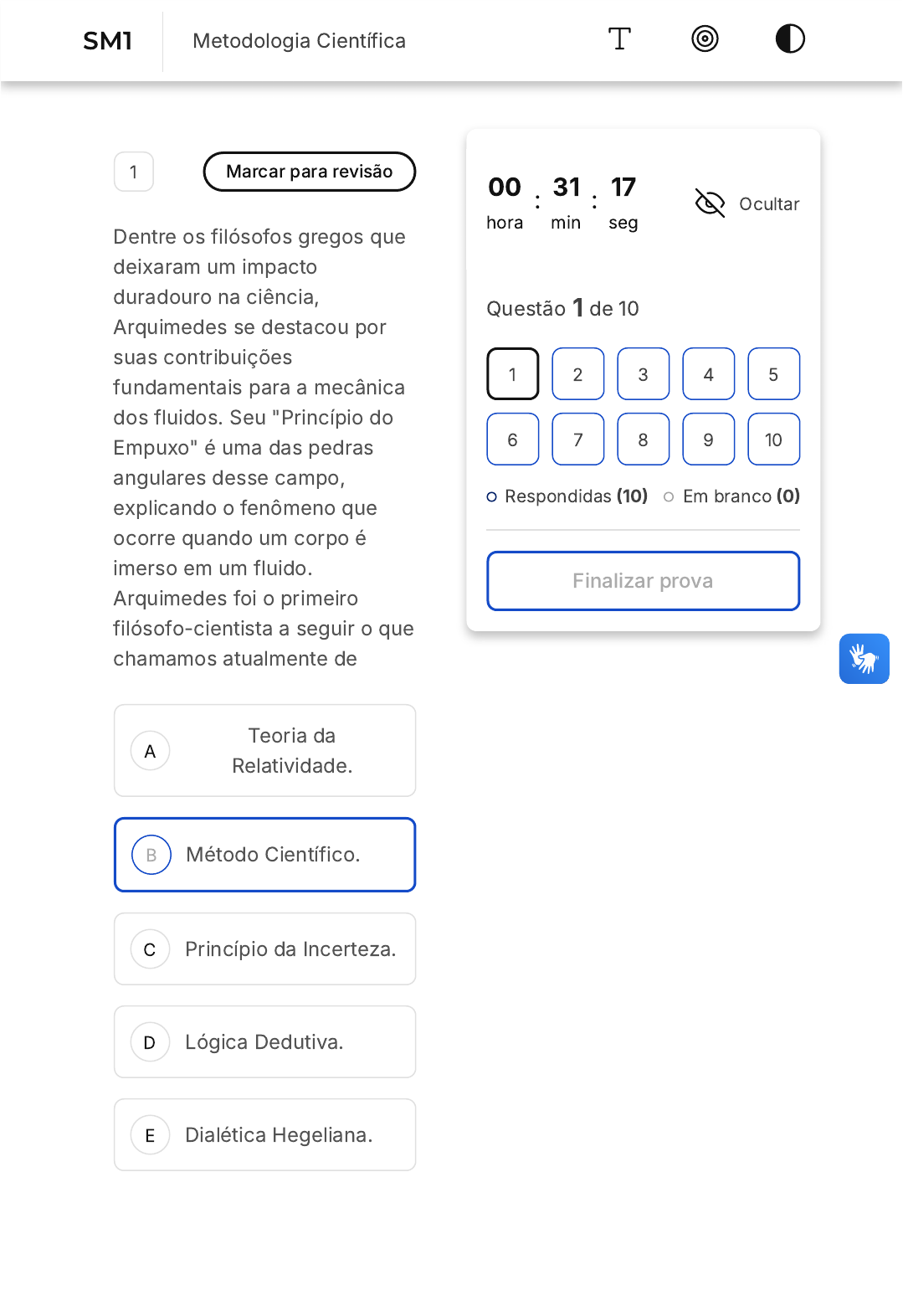 A B C D E 1 Marcar para revisão Dentre os filósofos gregos que deixaram um impacto duradouro na ciência, Arquimedes se destacou por suas contribuições fundamentais para a mecânica dos fluidos. Seu "Princípio do Empuxo" é uma das pedras angulares desse campo, explicando o fenômeno que ocorre quando um corpo é imerso em um fluido. Arquimedes foi o primeiro filósofo-cientista a seguir o que chamamos atualmente de Teoria da Relatividade. Método Científico. Princípio da Incerteza. Lógica Dedutiva. Dialética Hegeliana. 00 hora : 31 min : 17 seg Ocultar Questão 1 de 10 Respondidas (10) Em branco (0) Finalizar prova 1 2 3 4 5 6 7 8 9 10 SM1 Metodologia Científica A B C 2 Marcar para revisão O que são Erros de Medida? Erros de medida são diferenças entre o desvio de uma medida e o valor verdadeiro, ou convencionado, de uma grandeza. Classifica a acurácia da medição. Sequência lógica de operações, descritas genericamente, usadas na execução das medições. Erros de Medida são impropriedades na tomada de dados de uma amostragem. D E Erros de medida são diferenças entre o valor medido e o valor verdadeiro, ou convencionado, de uma grandeza. Quanto mais acurada uma medida, menor seu erro. Quanto menor o erro de medida, menor a distância entre o valor medido e o valor de referência ou convencionado da grandeza medida. Erros de Medida são grandezas específicas submetidas à medição. 3 Marcar para revisão Na Grécia Antiga, berço de grande parte do pensamento ocidental, os filósofos desempenharam um papel fundamental ao promover a racionalidade e o pensamento livre. Entre esses pensadores, um se destacou não apenas por suas contribuições para a compreensão do mundo natural, mas também por sua abordagem pioneira e racional em meio a um contexto dominado por mitos e crenças. A B C D E Marque a alternativa que indica esse filósofo. Sócrates. Platão. Aristóteles. Pitágoras. Tales de Mileto. 4 Marcar para revisão No início da Idade Moderna, René Descartes emergiu como um dos pensadores mais influentes ao propor um método de raciocínio sistemático e rigoroso. Seu livro "Discurso do Método" descreve uma abordagem que se tornaria conhecida como o método cartesiano. Analise as afirmativas abaixo sobre o método de raciocínio cartesiano proposto por René Descartes. I. O método cartesiano sugere que duvidar de tudo é essencial para alcançar verdades que servirão como bases sólidas para a construção do conhecimento. A B C D E II. Descartes propõe que a dedução lógica é o meio pelo qual verdades inquestionáveis(axiomas) são estabelecidas. III. Descartes argumenta que a observação empírica é o único caminho para deduzir verdades já conhecidas a partir desses axiomas. Assinale a alternativa que apresenta a(s) afirmativa(s) correta(s). Apenas a afirmativa I está correta. Apenas as afirmativas I e II estão corretas. Apenas as afirmativas II e III estão corretas. Apenas a afirmativa III está correta. As afirmativas I, II e III estão corretas. 5 Marcar para revisão Dentre os tipos de pesquisa, encontra-se a pesquisa qualitativa. Como esta pode ser definida? A B C A pesquisa qualitativa é um método de pesquisa que se baseia apenas em observações e descrições. A pesquisa qualitativa é um método de pesquisa que se baseia exclusivamente em dados numéricos e estatísticas. A pesquisa qualitativa é um método de pesquisa que utiliza técnicas estatísticas complexas para analisar dados. D E A pesquisa qualitativa é um método de pesquisa que busca compreender o significado das experiências e perspectivas dos participantes, por meio de dados descritivos e não numéricos. A pesquisa qualitativa é um método de pesquisa que busca generalizar as conclusões a partir de uma amostra representativa da população. 6 Marcar para revisão As grandezas físicas podem ser expressas em diferentes unidades. Qual a relevância das Unidades Físicas básicas do SI serem definidas em termos de constantes fundamentais da natureza? A B É uma evolução nas definições, convenções e processos de medida em Física. Unidades Físicas básicas, definidas em termos de constantes da natureza, nos permitem medir em termos de padrões confiáveis. No entanto, tendo em vista a constante correção das medidas e valores destas constantes Físicas fundamentais com a evolução tecnológica, precisaremos renovar as definições e convenções das Unidades Físicas de base com frequência. O SI nos apresenta padrões de referência opcionais para a metrologia nos países membro do Bureau Internacional de Pesos e Medidas (BIPM). As Unidades Físicas de base podem ser definidas em termos de materiais, protocolo tradicional, ou em termos das constantes Físicas da Natureza. C D O programa de implementação de definições das Unidades Físicas de base em termos de constantes fundamentais da Natureza ainda não foi concluído nem seus testes finalizados. Do ponto de vista prático, as unidades físicas de base continuam definidas em termos de corpos materiais, como o metro padrão, o quilograma padrão etc. E É uma evolução nas definições, convenções e processos de medida em Física. Unidades Físicas básicas, definidas em termos de constantes da Natureza, nos permitem medir em termos de padrões confiáveis, imutáveis, ainda que consigamos aprimorar ainda mais suas incertezas de medida. Agora, as unidades básicas SI não serão alteradas por quaisquer condições, pois dependem de constantes fundamentais da Natureza. 7 Marcar para revisão A produção acadêmica demanda escolhas metodológicas coerentes com os objetivos da investigação científica. Em contextos em que o pesquisador deseja compreender profundamente comportamentos, valores ou relações sociais a partir de sua vivência com os sujeitos do estudo, torna-se essencial A B C optar por um tipo de abordagem e técnica que privilegie o envolvimento direto com a realidade observada. Q