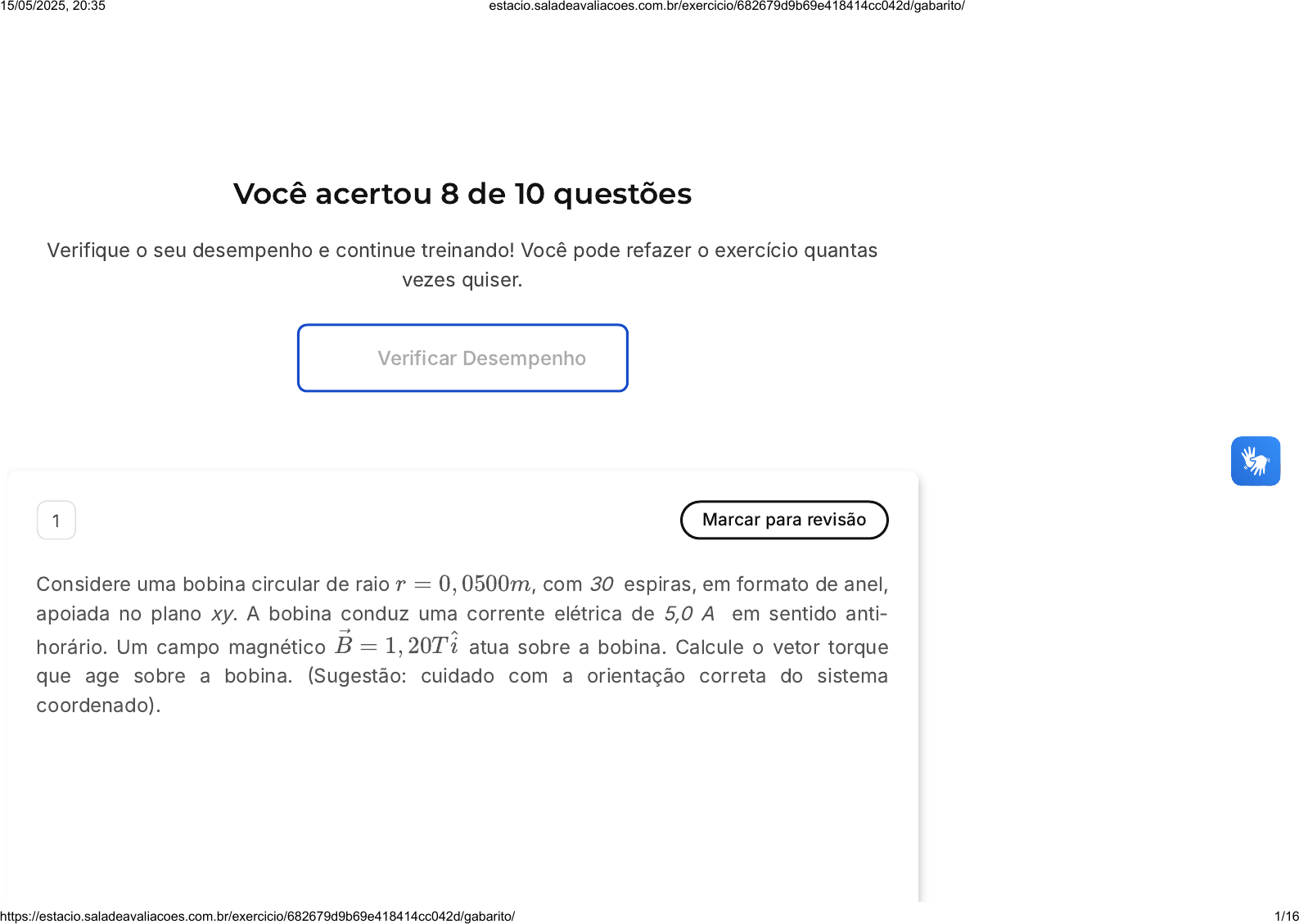 Você acertou 8 de 10 questões Verifique o seu desempenho e continue treinando! Você pode refazer o exercício quantas vezes quiser. Verificar Desempenho 1 Marcar para revisão Considere uma bobina circular de raio , com 30 espiras, em formato de anel, apoiada no plano xy. A bobina conduz uma corrente elétrica de 5,0 A em sentido anti- horário. Um campo magnético atua sobre a bobina. Calcule o vetor torque que age sobre a bobina. (Sugestão: cuidado com a orientação correta do sistema coordenado). r = 0, 0500m →B = 1, 20T î 15/05/2025, 20:35 estacio.saladeavaliacoes.com.br/exercicio/682679d9b69e418414cc042d/gabarito/ https://estacio.saladeavaliacoes.com.br/exercicio/682679d9b69e418414cc042d/gabarito/ 1/16 A B C D E →τ = (1, 18N . m)k̂ →τ = (1, 41N . m)ĵ →τ = −(1, 41N . m)ĵ →τ = −(1, 18N . m)k̂ →τ = (1, 18N . m) Resposta incorreta Opa! A alternativa correta é a letra B. Confira o gabarito comentado! Gabarito Comentado O vetor torque que age sobre a bobina pode ser calculado pela fórmula , onde é o número de espiras, é a corrente, é a área da bobina e é o campo magnético. Como a bobina está no plano xy e a corrente flui no sentido anti-horário, o vetor área aponta na direção positiva do eixo y. Portanto, o vetor torque também aponta na direção positiva do eixo y, resultando em . →τ = NIA →B N I A →B →A →τ →τ = (1, 41N . m)ĵ 15/05/2025, 20:35 estacio.saladeavaliacoes.com.br/exercicio/682679d9b69e418414cc042d/gabarito/ https://estacio.saladeavaliacoes.com.br/exercicio/682679d9b69e418414cc042d/gabarito/ 2/16 A B C D E 2 Marcar para revisão As diferentes categorias de materiais magnéticos permitem aplicações em diversos campos da ciência e tecnologia. Qual dos seguintes materiais, que abaixo da temperatura crítica, é considerado antiferromagnético? Ferro Cobre Manganês Ouro Zinco Resposta correta Parabéns, você selecionou a alternativa correta. Confira o gabarito comentado! Gabarito Comentado 15/05/2025, 20:35 estacio.saladeavaliacoes.com.br/exercicio/682679d9b69e418414cc042d/gabarito/ https://estacio.saladeavaliacoes.com.br/exercicio/682679d9b69e418414cc042d/gabarito/ 3/16 O manganês é um exemplo de material antiferromagnético, o que significa que seus momentos magnéticos individuais se alinham em direções opostas, resultando em uma magnetização líquida nula. 3 Marcar para revisão Um próton move-se na horizontal, livre de qualquer tipo de força, à velocidade da luz, quando entra em um campo magnético orientado de baixo para cima, e então começa a realizar uma curva, de baixo para cima. Durante a sua curva, o próton alcança um ponto em que passa a experimentar também um campo elétrico orientado de cima para baixo, e por conta disto, volta a se mover em linha reta, da esquerda para a direita, como ilustra a figura abaixo, onde a trajetória do próton é a linha azul: 15/05/2025, 20:35 estacio.saladeavaliacoes.com.br/exercicio/682679d9b69e418414cc042d/gabarito/ https://estacio.saladeavaliacoes.com.br/exercicio/682679d9b69e418414cc042d/gabarito/ 4/16 Na terceira etapa do trajeto, onde o próton retorna a se mover em linha reta, atua sobre ele: 15/05/2025, 20:35 estacio.saladeavaliacoes.com.br/exercicio/682679d9b69e418414cc042d/gabarito/ https://estacio.saladeavaliacoes.com.br/exercicio/682679d9b69e418414cc042d/gabarito/ 5/16 A B C D E a força de Lorentz a força magnética somente a força elétrica somente a força gravitacional somente a força centrípeta somente Resposta correta Parabéns, você selecionou a alternativa correta. Confira o gabarito comentado! Gabarito Comentado No momento em que o próton retorna a andar em linha reta, que é a terceira etapa do seu trajeto, atuam sobre ele as forças Elétrica e Magnética, e a composição de ambas as forças, formam a força de Lorentz. 15/05/2025, 20:35 estacio.saladeavaliacoes.com.br/exercicio/682679d9b69e418414cc042d/gabarito/ https://estacio.saladeavaliacoes.com.br/exercicio/682679d9b69e418414cc042d/gabarito/ 6/16 A B C D E 4 Marcar para revisão Quando uma partícula carregada e com velocidade não nula é submetida a um campo magnético uniforme perpendicular ao seu movimento inicial, passa a descrever a trajetória de um movimento circular uniforme. Considere uma partícula puntual com carga elétrica q=1,6×10 C e massa m=9,11 × 10 kg. Acionamos um campo magnético uniforme e a partícula passou a apresentar uma velocidade angular ω=1,54×10 s . Sabendo que a relação entre as velocidades tangencial e angular é v=ω R, onde R é o raio da trajetória circular, calcule a intensidade desse campo magnético. -19 -31 10 -1 | →B| = 87, 7T | →B| = 8, 77T | →B| = 0, 877T | →B| = 0, 0877T | →B| = 0, 00877T 15/05/2025, 20:35 estacio.saladeavaliacoes.com.br/exercicio/682679d9b69e418414cc042d/gabarito/ https://estacio.saladeavaliacoes.com.br/exercicio/682679d9b69e418414cc042d/gabarito/ 7/16 Resposta correta Parabéns, você selecionou a alternativa correta. Confira o gabarito comentado! Gabarito Comentado A questão envolve a aplicação da fórmula da força magnética que atua sobre uma partícula carregada em movimento, que é dada por F = qvB, onde F é a força, q é a carga da partícula, v é a velocidade da partícula e B é a intensidade do campo magnético. Como a partícula está em movimento circular, a força magnética é igual à força centrípeta, ou seja, F = mv²/R, onde m é a massa da partícula e R é o raio da trajetória. Substituindo a expressão da velocidade v = ωR na fórmula da força centrípeta, temos F = mω²R². Igualando as duas expressões para a força, temos qvB = mω²R². Simplificando, encontramos B = mω²R/qv. Substituindo os valores dados na questão, encontramos que a intensidade do campo magnético é 0,0877T, que corresponde à alternativa D. 5 Marcar para revisão Os solenoides são amplamente utilizados em várias aplicações, incluindo a indústria automotiva. Eles desempenham um p