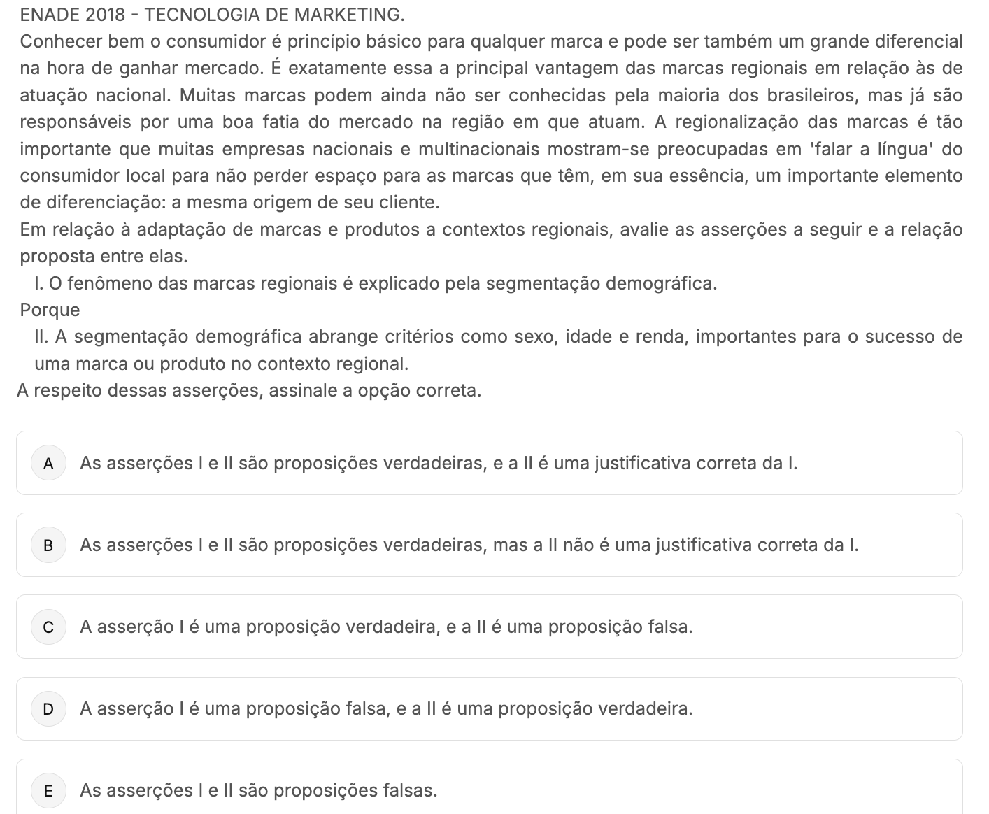 ENADE 2018 - TECNOLOGIA DE Conhecer bem o consumidor é princípio básico para qualquer marca e pode ser também um grande diferencial na hora de ganhar mercado. É exatamente essa a principal vantagem das marcas regionais em relação às de atuação nacional. Muitas marcas podem ainda não ser conhecidas pela maioria dos brasileiros, mas já são responsáveis por uma boa fatia do mercado na região em que atuam. A regionalização das marcas é tão importante que muitas empresas nacionais e multinacionais mostram-se preocupadas em 'falar a do consumidor local para não espaço para as marcas que têm, em sua essência, um importante elemento de diferenciação: a mesma origem de seu cliente. Em relação à adaptação de marcas e produtos a contextos regionais, avalie as asserções a seguir e a relação proposta entre elas. I. fenômeno das marcas regionais é explicado pela segmentação demográfica. Porque II. A segmentação demográfica abrange critérios como sexo, idade e renda, importantes para o sucesso de uma marca ou produto no contexto regional. A respeito dessas asserções, assinale a opção correta. A As asserções e são proposições verdadeiras, e a é uma justificativa correta da I. B As asserções e são proposições verdadeiras, mas a não é uma justificativa correta da I. C A asserção é uma proposição verdadeira, e a é uma proposição falsa. D A asserção é uma proposição falsa, e a é uma proposição verdadeira. E As asserções e são proposições falsas.