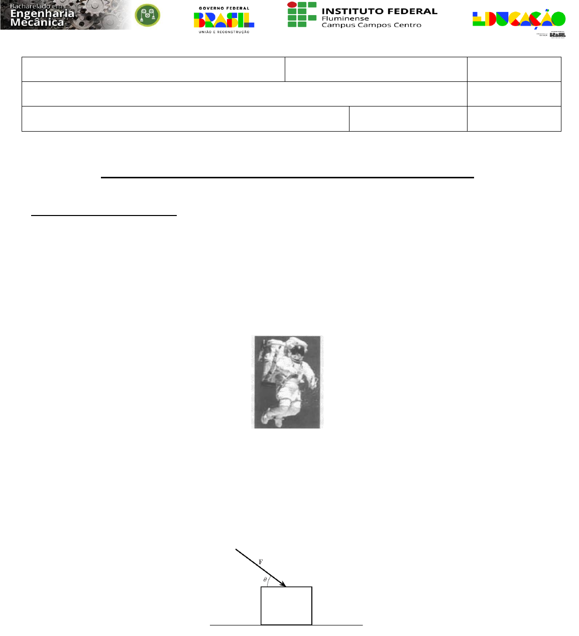 Lista Avaliativa de Mecânica II – Dinâmica P2 Data de entrega: 16/05/2025 FORÇAS E MOVIMENTO RETILÍNEO 1. Um astronauta se encontra extraviado fora de sua nave espacial. Afortunadamente ele possui uma unidade de propulsão que proporciona uma força constante F durante 3 s. Sabendo que durante esse tempo ele se move 2,25 m e que sua massa é m = 68 Kg, determine o módulo de F. 2. A partir de certo instante, passa a atuar sobre um bloco de massa m, que está inicialmente em repouso sobre uma superfície lisa horizontal, uma força constante F que corresponde a quatro vezes a massa do bloco (F = 4m), que forma com a horizontal um ângulo θ = 40º, como ilustra a figura. Determine o módulo da aceleração do bloco. 3. Um jogador de basquete de 110 Kg se segura no aro da cesta depois de uma enterrada espetacular. Antes de deixar-se cair ele se mantém suspenso em repouso, com o aro abaixo uma distância de 15 cm. Supondo que o aro se comporta como uma mola elástica, calcule sua constante elástica k. Disciplina: Mecânica II - Dinâmica Professor: João Carlos Período: Nome: Valor: 4,0 Curso: Bacharelado em Engenharia Mecânica Data: / /2024 Nota: 4. Durante uma corrida de trenós uma força de 150 N é aplicada formando um ângulo θ = 25º com a horizontal. Sabendo que a massa total do sistema é 80 Kg e o atrito entre o trenó e o chão é desprezível, determine (a) a aceleração do trenó e (b) a força normal exercida pela superfície sobre o trenó. 5. Um bloco se encontra em repouso sobre uma superfície inclinada, como ilustrado na figura. Sabendo que se aumentarmos gradativamente a inclinação com a horizontal, haverá um ângulo crítico θc, acima do qual o bloco entrará em movimento. Aplicando a Segunda Lei de Newton, mostre que é relativamente simples provar que μe = tanθc. 6. Um avião acelera em uma pista para levantar voo quando um passageiro, estudante de engenharia, decide determinar sua aceleração usando um ioiô. O estudante verifica que a corda do ioiô forma um ângulo de 22º com a vertical, como mostrado na figura. Determine a aceleração do avião. 7. Dois aventureiros, Paul e Steve, atados por uma corda caem pela borda de um desfiladeiro inclinado. Antes de cair, um deles crava sua ferramenta para deter o movimento e desliza sem atrito pela superfície inclinada. Supondo que não existe atrito entre a corda e a beirada do desfiladeiro escreva, em função das massas dos aventureiros e do ângulo de inclinação, (a) a aceleração de cada pessoa e (b) a tensão existente na corda. 8. Para que valor(es) do ângulo θ a aceleração do bloco de 35 Kg será 9 m/s2 para a direita? 9. Um motor para propulsão no espaço profundo é projetado para produzir um empuxo de 2,5 N por longos períodos. Se o motor deve mover uma espaçonave de 70 t para uma missão interplanetária, calcule o tempo t necessário para um aumento de velocidade de 40000 Km/h para 65000 Km/h. Admita que a espaçonave esteja se movendo em uma região remota do espaço, onde o empuxo do seu motor é a única força atuando sobre a espaçonave na direção do seu movimento. 10. Os dois blocos ilustrados na figura partem do repouso. Considerando que o plano horizontal e a roldana são isentos de atrito e a massa da roldana é desprezível, determine a aceleração de cada bloco e a tensão em cada corda. 11. Um bloco B de 53,4 N parte do repouso e escorrega sobre uma cunha A de 133 N. A cunha por sua vez é suportada por um plano horizontal. Desprezando os atritos, determine (a) a aceleração da cunha e (b) a aceleração do bloco relativa à cunha. FORÇAS DE ATRITO E MOVIMENTO RETILÍNEO 12. Um bloco de 80 Kg repousa sobre um plano horizontal. Determine a intensidade da força R capaz de comunicar ao bloco uma aceleração de 2,5 m/s2 para a direita. O coeficiente de atrito entre o bloco e o plano é μ = 0,25. 13. Sobre a capa superior de um livro que se encontra sobre uma superfície está uma moeda, como mostra a figura. Pouco a pouco se levanta a capa do livro até que a moeda começa a deslizar. O ângulo θmáx é o ângulo que forma a capa com a horizontal no momento em que a moeda começa a se mover. Calcule o coeficiente de atrito estático μe entre a capa do livro e a moeda em função de θmáx. 14. Duas crianças são arrastadas em um trenó sobre um terreno coberto de neve, através de uma corda que forma um ângulo de 40º com a horizontal, como indicado na figura. A massa das crianças é de 45 Kg e do trenó, 5 Kg. Os coeficientes de atrito estático e cinético são μe = 0,2 e μc = 0,15, respectivamente. Determine (a) a força de atrito exercida pelo solo sobre o trenó, (b) a aceleração das crianças sabendo que a tensão na corda vale 100 N. 15. Os blocos de massas m1 = 7 Kg e m2 = 5 Kg encontram-se em repouso, como mostrado na figura. Nesta situação, determine (a) o coeficiente de atrito estático entre o bloco m1 e a superfície. Se com um ligeiro toque os blocos se movem com certa aceleração a, determine (b) essa aceleração, sabendo que o coeficiente de atrito cinético entre o bloco a superfície é μc = 0,54. FORÇAS E MOVIMENTO CURVILÍNEO 16. Um carro se movimenta ao longo de uma pista circular, cuja superfície está inclinada de θ em relação ao plano horizontal. Ele descreve um MCU cujo raio de curvatura vale R, como indicado na figura. Suponha que exista atrito entre os pneus e a pista, sendo μe o coeficiente de atrito estático correspondente, determine qual deve ser o módulo da velocidade do carro para que a força de atrito sobre os pneus seja nula. 17. Um pêndulo de comprimento igual a 2 m descreve um arco de circunferência num plano vertical. Se a tensão na corda é 2,5 vezes o peso do pêndulo para a posição mostrada na figura, determine a velocidade e a aceleração do pêndulo nesta posição. 18. Um balde com água é posto a girar seguindo uma circunferência vertical de raio r, como mostrado na figura. Se a velocidade 