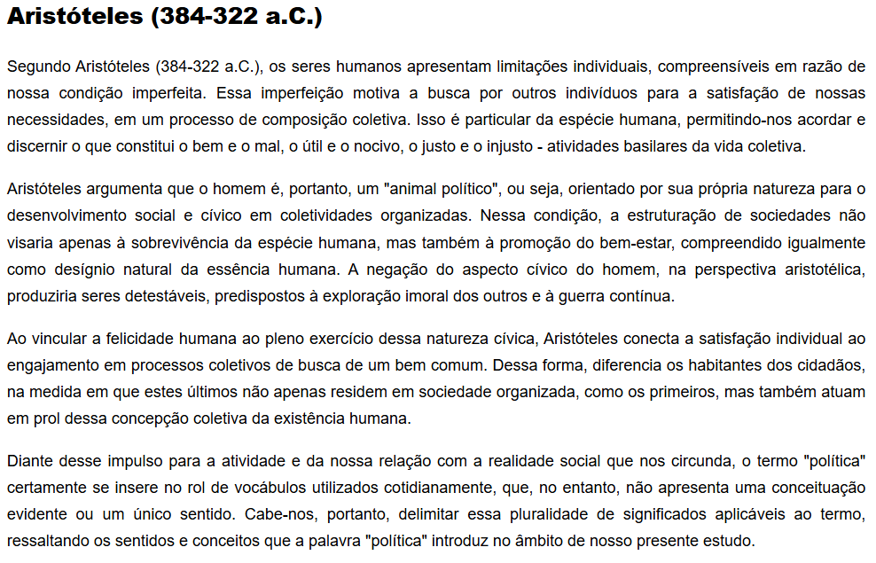 Aristóteles (384-322 a.C.) Segundo Aristóteles (384-322 a.C.), os seres humanos apresentam limitações individuais, compreensíveis em razão de nossa condição imperfeita. Essa imperfeição motiva a busca por outros indivíduos para a satisfação de nossas necessidades, em um processo de composição coletiva. Isso é particular da espécie humana, permitindo-nos acordar e discernir o que constitui o bem e o mal, o útil e o nocivo, o justo e o injusto - atividades basilares da vida coletiva. Aristóteles argumenta que o homem é, portanto, um "animal político", ou seja, orientado por sua própria natureza para desenvolvimento social e em coletividades organizadas. Nessa condição, a estruturação de sociedades não visaria apenas à sobrevivência da espécie humana, mas também à promoção do bem-estar, compreendido igualmente como natural da essência humana. A negação do aspecto do homem, na perspectiva aristotélica, produziria seres detestáveis, predispostos à exploração imoral dos outros e à guerra Ao vincular a felicidade humana ao pleno exercício dessa natureza Aristóteles conecta a satisfação individual ao engajamento em processos coletivos de busca de um bem comum. Dessa forma, diferencia os habitantes dos cidadãos, na medida em que estes últimos não apenas residem em sociedade organizada, como os primeiros, mas também atuam em prol dessa concepção coletiva da existência humana. Diante desse impulso para a atividade e da nossa relação com a realidade social que nos circunda, o termo "política" certamente se insere no rol de vocábulos utilizados cotidianamente, que, no entanto, não apresenta uma conceituação evidente ou um único sentido. Cabe-nos, portanto, delimitar essa pluralidade de significados aplicáveis ao termo, ressaltando os sentidos e conceitos que a palavra "política" introduz no âmbito de nosso presente estudo.