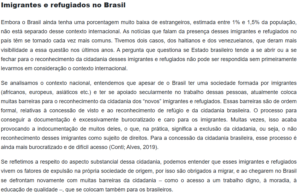 Imigrantes e refugiados no Brasil Embora Brasil ainda tenha uma porcentagem muito baixa de estrangeiros, estimada entre 1% e 1,5% da população, não está separado desse contexto internacional. As notícias que falam da presença desses imigrantes e refugiados no país têm se tornado cada vez mais comuns. Tivemos dois casos, dos haitianos e dos venezuelanos, que deram mais visibilidade a essa questão nos últimos anos. A pergunta que questiona se Estado brasileiro tende a se abrir ou a se fechar para o reconhecimento da cidadania desses imigrantes e refugiados não pode ser respondida sem primeiramente levarmos em consideração o contexto internacional. Se analisamos contexto nacional, entendemos que apesar de o Brasil ter uma sociedade formada por imigrantes (africanos, europeus, asiáticos etc.) e ter se apoiado secularmente no trabalho dessas pessoas, atualmente coloca muitas barreiras para reconhecimento da cidadania dos "novos" imigrantes e refugiados. Essas barreiras são de ordem formal, relativas à concessão de visto e ao reconhecimento de refúgio e da cidadania brasileira. processo para conseguir a documentação é excessivamente burocratizado e caro para os imigrantes. Muitas vezes, isso acaba provocando a indocumentação de muitos deles, o que, na prática, significa a exclusão da cidadania, ou seja, o não reconhecimento desses imigrantes como sujeito de direitos. Para a concessão da cidadania brasileira, esse processo é ainda mais burocratizado e de difícil acesso (Conti; Alves, 2019). Se refletimos a respeito do aspecto substancial dessa cidadania, podemos entender que esses imigrantes e refugiados vivem os fatores de expulsão na própria sociedade de origem, por isso são obrigados a migrar, e ao chegarem no Brasil se defrontam novamente com muitas barreiras da cidadania - como acesso a um trabalho digno, à moradia, à educação de qualidade que se colocam também para os brasileiros.
