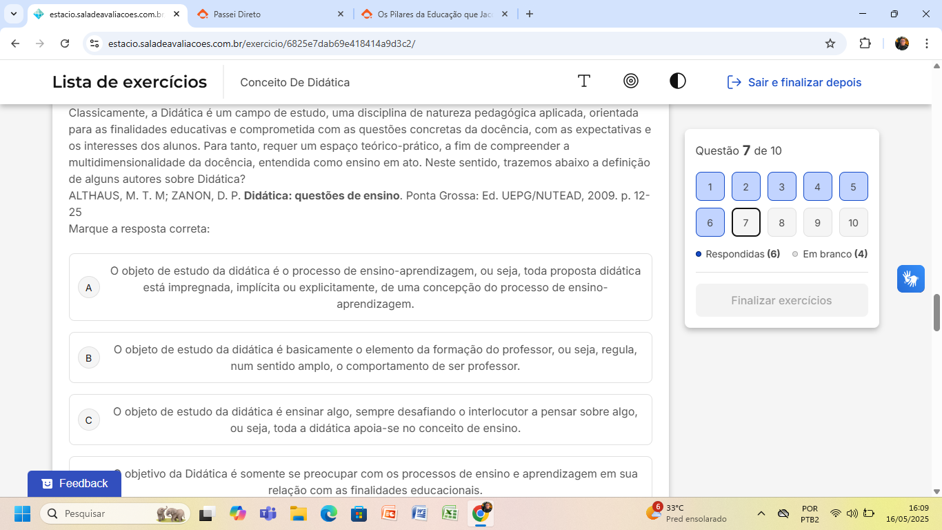estacio.saladeavaliacoes.com.br Passei Direto Os Pilares da Educação que Jac + Lista de exercícios Conceito De Didática T Sair e finalizar depois Classicamente, a Didática é um campo de estudo, uma disciplina de natureza pedagógica aplicada, orientada para as finalidades educativas e comprometida com as questões concretas da docência, com as expectativas e os interesses dos alunos. Para tanto, requer um espaço a fim de compreender a Questão 7 de 10 multidimensionalidade da docência, entendida como ensino em ato. Neste sentido, trazemos abaixo a definição de alguns autores sobre Didática? 1 2 3 4 5 ALTHAUS, M. T. M; ZANON, D. P. Didática: questões de ensino. Ponta Grossa: Ed. UEPG/NUTEAD, 2009. p. 12- 25 6 7 8 9 10 Marque a resposta correta: Respondidas (6) Em branco (4) objeto de estudo da didática é o processo de ensino-aprendizagem, ou seja, toda proposta didática A está impregnada, implícita ou explicitamente, de uma concepção do processo de ensino- aprendizagem. Finalizar exercícios objeto de estudo da didática é basicamente o elemento da formação do professor, ou seja, regula, B num sentido amplo, comportamento de ser professor. o objeto de estudo da didática é ensinar algo, sempre desafiando interlocutor a pensar sobre algo, C ou seja, toda a didática apoia-se no conceito de ensino. objetivo da Didática é somente se preocupar com os processos de ensino e aprendizagem em sua Feedback relação com as finalidades educacionais. 33°C POR 16:09 Q Pesquisar C Pred ensolarado PTB2 16/05/2025