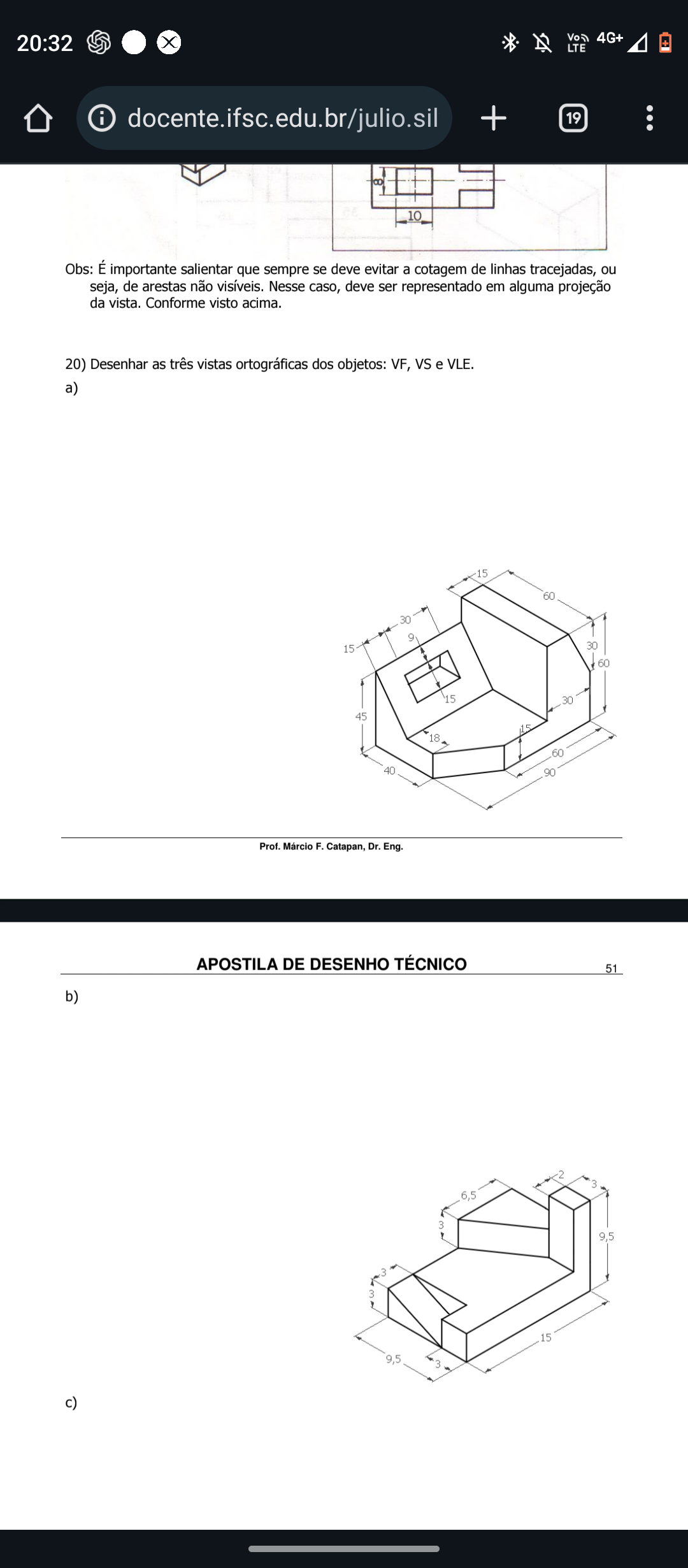 20:32 4G+ LTE + i docente.ifsc.edu.br/julio.si + 19 10 Obs: É importante salientar que sempre se deve evitar a cotagem de linhas tracejadas, ou seja, de arestas não visíveis. Nesse caso, deve ser representado em alguma projeção da vista. Conforme visto acima. 20) Desenhar as três vistas ortográficas dos objetos: VF, e VLE. a) 15 60 30 9 15 30 60 15 30 45 18 60 40 90 Prof. Márcio F. Catapan, Dr. Eng. APOSTILA DE DESENHO TÉCNICO 51 b) 2 3 6,5 3 15 9,5 3 c)
