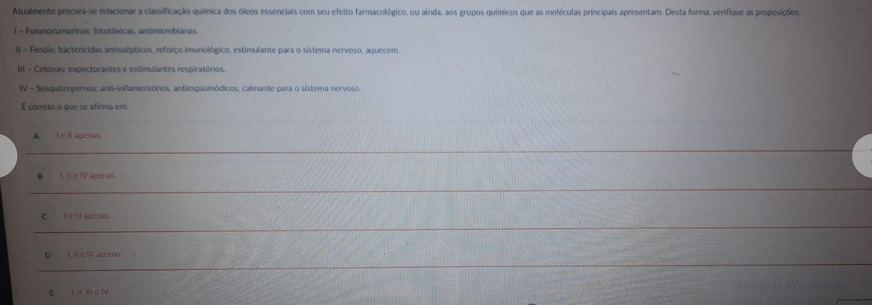Atualmente procura-se relacionar a classificação dos óleos essenciais com seu efeito ou ainda, aos grupos quimicos que as apresentam. Desta verifique as - - bactericidas reforço estimulante para sistema III - expectorantes e estimulantes IV - Sesquiterpernos: calmante para sistema E correto que se afirma em: A IV III D apenas E