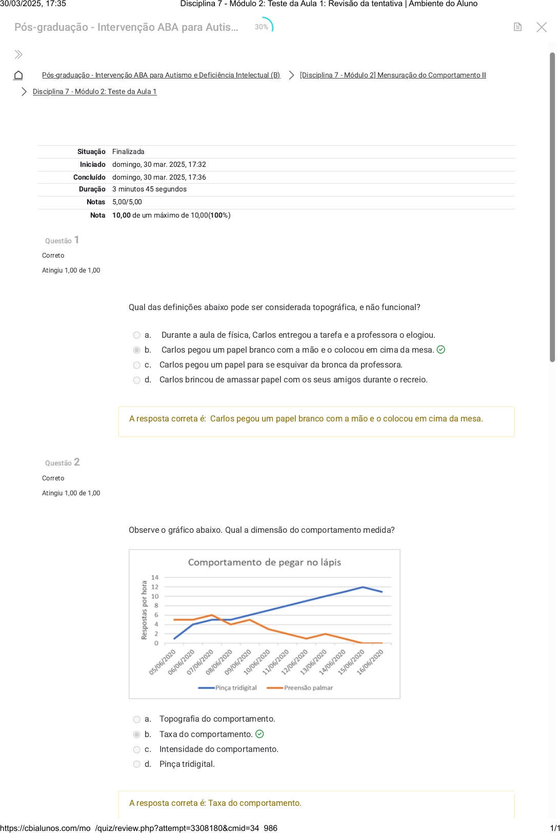 Pós-graduação - Intervenção ABA para Autismo e Deficiência Intelectual (B) [Disciplina 7 - Módulo 2] Mensuração do Comportamento II Disciplina 7 - Módulo 2: Teste da Aula 1 Questão 1 Correto Atingiu 1,00 de 1,00 Questão 2 Correto Atingiu 1,00 de 1,00 Qual das definições abaixo pode ser considerada topográfica, e não funcional? a. Durante a aula de física, Carlos entregou a tarefa e a professora o elogiou. b. Carlos pegou um papel branco com a mão e o colocou em cima da mesa. c. Carlos pegou um papel para se esquivar da bronca da professora. d. Carlos brincou de amassar papel com os seus amigos durante o recreio. A resposta correta é: Carlos pegou um papel branco com a mão e o colocou em cima da mesa. Observe o gráfico abaixo. Qual a dimensão do comportamento medida? a. Topografia do comportamento. b. Taxa do comportamento. c. Intensidade do comportamento. d. Pinça tridigital. A resposta correta é: Taxa do comportamento. Situação Finalizada Iniciado domingo, 30 mar. 2025, 17:32 Concluído domingo, 30 mar. 2025, 17:36 Duração 3 minutos 45 segundos Notas 5,00/5,00 Nota 10,00 de um máximo de 10,00(100%) Pós-graduação - Intervenção ABA para Autis… 30% 30/03/2025, 17:35 Disciplina 7 - Módulo 2: Teste da Aula 1: Revisão da tentativa | Ambiente do Aluno https://cbialunos.com/mod/quiz/review.php?attempt=3308180&cmid=340986 1/1 https://cbialunos.com/course/view.php?id=488 https://cbialunos.com/course/section.php?id=15249 https://cbialunos.com/mod/quiz/view.php?id=340986 https://cbialunos.com/my/courses.php https://cbialunos.com/course/view.php?id=488 https://cbialunos.com/course/view.php?id=488&mb2sct=22