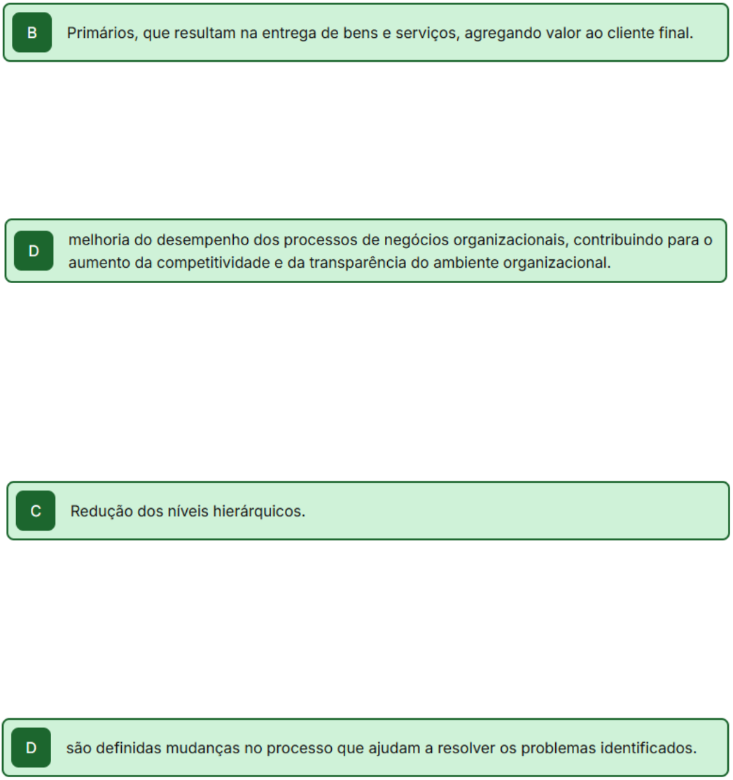 Exercícios - Fundamentos da Gestão de Processos - Exercícios Questão 1 - Processo pode ser conceituado como um conjunto de meios articulados de forma organizada para alcançar os resultados pretendidos e, nesse contexto, uma das classificações possíveis é a categorização dos processos, como: Os processos primários dizem respeito às principais atividades realizadas pela organização. Eles entregam valor diretamente ao cliente. Geralmente extrapolam a fronteira das organizações, tendo contato direto com o cliente e uma visão completa da cadeia de valor. Questão 2 - A implementação do BPM (Business Process Management) lida com o desafio de: O BPM busca o aprimoramento de um processo de negócios de ponta a ponta, analisando a situação atual, modelando como ele funciona em diferentes cenários, executando melhorias, monitorando o processo aprimorado e otimizando continuamente se possível com automação. Ele busca a melhoria dos processos de negócios organizacionais produzindo resultados positivos que agreguem valor à organização e a seus clientes. Questão 3 - Qual das etapas abaixo não corresponde ao ciclo de vida do BPM? O ciclo BPM engloba o planejamento e a análise de processos, a modelagem, a execução, o monitoramento e a otimização. As seis etapas do ciclo de vida são: planejamento e estratégia; análise de processos de negócio; desenho e modelagem; implementação de processos; monitoramento e controle; refinamento dos processos. Questão 4 - Na etapa de refinamento dos processos: O objetivo da fase de refinamento do processo é identificar mudanças no processo as quais ajudariam a resolver os problemas identificados na fase de monitoramento e permitir que a organização atinja seus objetivos de desempenho. Para esse fim, várias opções de alteração são analisadas e comparadas em termos das medidas de desempenho escolhidas. Questão 5 - A notação BPMN é rica em elementos de representação, tornando possível modelar processos mais complexos. Para representar um ponto de decisão, utiliza-se: Os pontos de decisão (gateways) são os elementos de BPMN utilizados para controlar iterações do fluxo, criando caminhos alternativos ou paralelos no mapeamento do processo ou unificando fluxos para continuação de uma mesma sequência de atividades. O ponto de decisão é representado visualmente por um losango. Questão 6 - Sobre o BPMN, é correto afirmar: O BPMN (Business Process Model and Notation) é uma notação gráfica que tem por objetivo prover uma notação de símbolos para mapear, de maneira padrão, todos os processos de negócio de uma organização. Essa notação foi criada e aprimorada pela Business Process Management Initiative, a qual posteriormente se uniu à Object Management Group (OMG), uma associação internacional aberta e sem fins lucrativos, fundada em 1989.