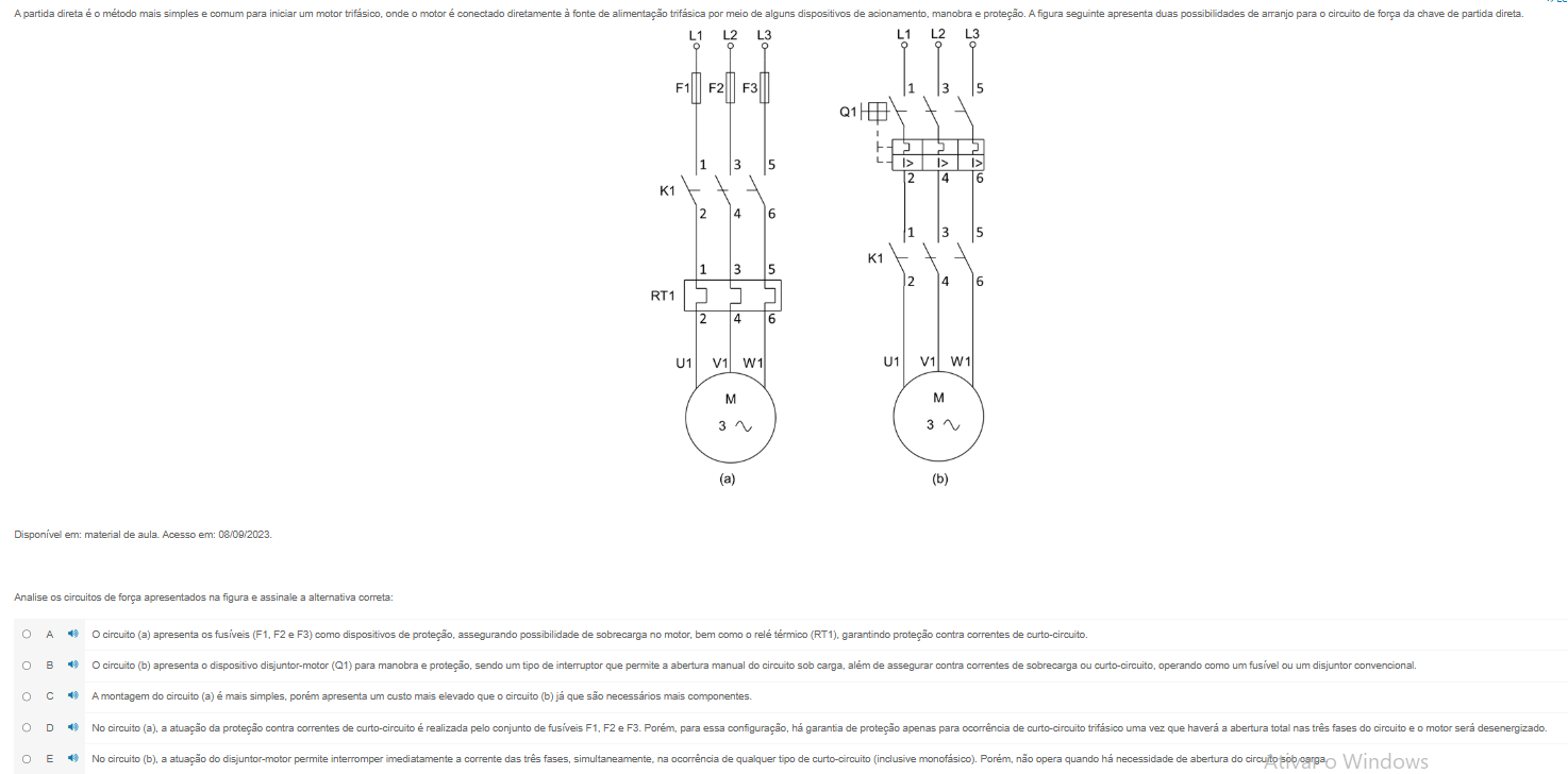 A partida direta é método mais simples e comum para iniciar um motor onde motor é conectado diretamente à fonte de alimentação trifásica L1 por meio L2 de L3 alguns dispositivos de L1 manobra L2 L3 e A figura seguinte apresenta duas possibilidades de arranjo para circuito de força da chave de partida F2 F3 Q1 1> 1> 1> 1 3 5 2 4 6 K1 2 4 6 3 K1 1 3 5 2 4 6 RT1 2 4 6 U1 V1 W1 U1 V1 W1 M M 3 3 (a) (b) Disponível material de aula. Acesso em: 08/09/2023 Analise os circuitos de apresentados na figura e assinale a alternativa correta: F2 F3) como dispositivos de assegurando possibilidade de sobrecarga no motor bem como relé térmico (RT1) garantindo proteção contra correntes de A circuito circuito (a) (b) apresenta apresenta dispositivo disjuntor-motor (Q1) para manobra e sendo um tipo de interruptor que permite a abertura manual do circuito sob além de contra correntes de sobrecarga ou operando como um ou um disjuntor Amontagem do circuito (a) é mais porém apresenta um custo mais elevado que circuito (b) que são necessários mais componentes. desenergizado. da contra correntes de curto-circuito realizada pelo conjunto de F1 F2 F3 para essa há garantia de proteção apenas para ocorrência de curto-circuito trifásico uma vez que a abertura total sob nas três fases Windows do circuito e motor será No circuito (a) a atuação proteção permite interromper imediatamente a corrente das três na ocorrência de qualquer tipo de curto-circuito (inclusive Porém não opera quando há necessidade de abertura do circuito No circuito (b) a atuação do disjuntor-motor