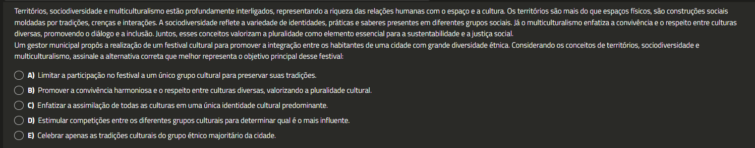 Territórios, sociodiversidade e multiculturalismo estão profundamente interligados, representando a riqueza das relações humanas com espaço e a cultura. Os territórios são mais do que espaços físicos, são construções sociais moldadas por tradições, crenças e interações. A sociodiversidade reflete a variedade de identidades, práticas e saberes presentes em diferentes grupos sociais. Já multiculturalismo enfatiza a convivência e respeito entre culturas diversas, promovendo diálogo e a inclusão. Juntos, esses conceitos valorizam a pluralidade como elemento essencial para a sustentabilidade e a justiça social. Um gestor municipal propôs a realização de um festival cultural para promover a integração entre habitantes de uma cidade com grande diversidade étnica. Considerando conceitos de territórios, sociodiversidade e multiculturalismo, assinale a alternativa correta que melhor representa objetivo principal desse festival: A) Limitar a participação no festival a um único grupo cultural para preservar suas tradições. B) Promover a convivência harmoniosa e respeito entre culturas diversas, valorizando a pluralidade cultural. C) Enfatizar a assimilação de todas as culturas em uma única identidade cultural predominante. D) Estimular competições entre os diferentes grupos culturais para determinar qual é mais influente. E) Celebrar apenas as tradições culturais do grupo étnico majoritário da cidade.