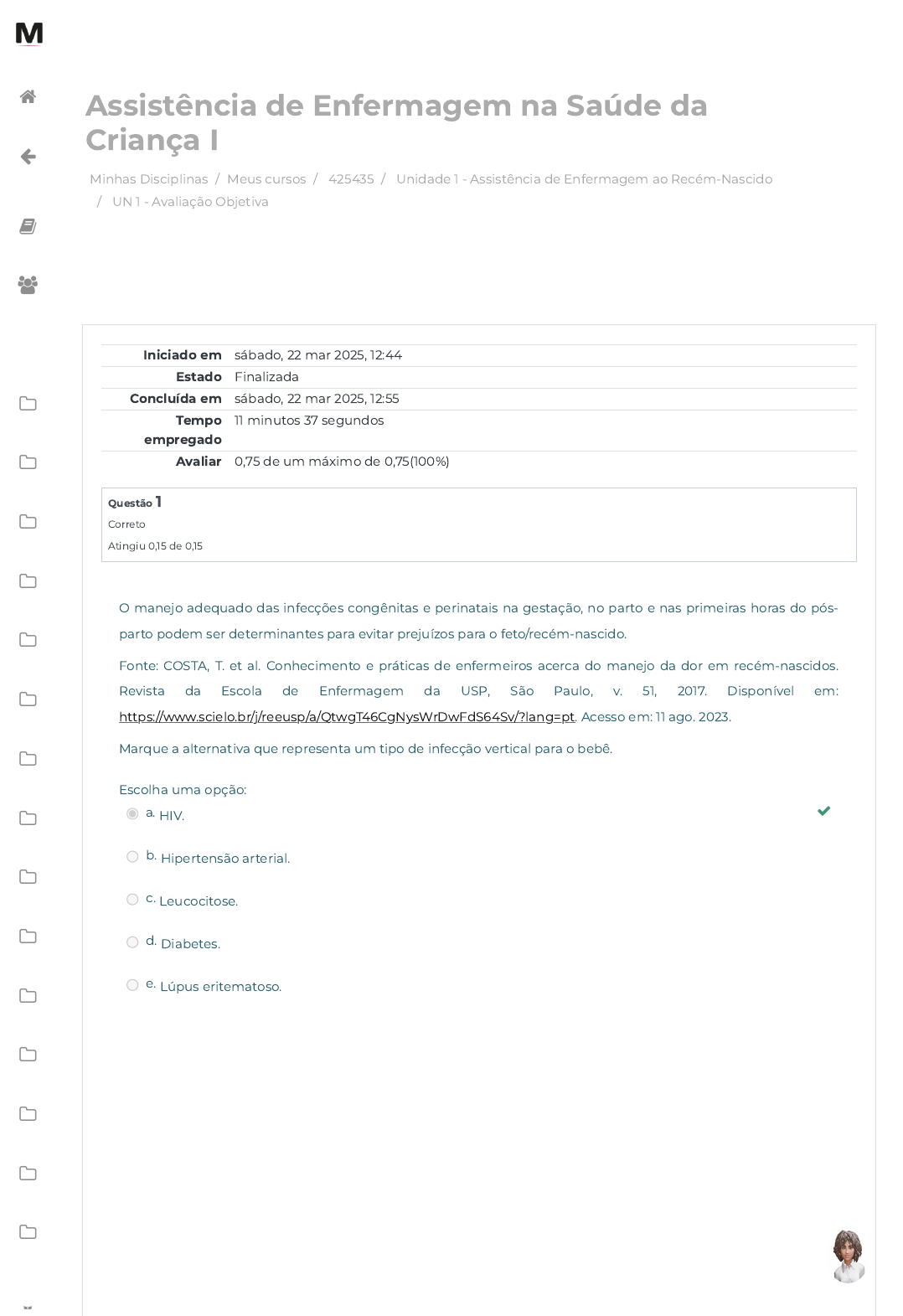 Minhas Disciplinas / Meus cursos / 425435 / Unidade 1 - Assistência de Enfermagem ao Recém-Nascido / UN 1 - Avaliação Objetiva Assistência de Enfermagem na Saúde da Criança I Iniciado em sábado, 22 mar 2025, 12:44 Estado Finalizada Concluída em sábado, 22 mar 2025, 12:55 Tempo empregado 11 minutos 37 segundos Avaliar 0,75 de um máximo de 0,75(100%) Questão 1 Correto Atingiu 0,15 de 0,15 O manejo adequado das infecções congênitas e perinatais na gestação, no parto e nas primeiras horas do pós- parto podem ser determinantes para evitar prejuízos para o feto/recém-nascido. Fonte: COSTA, T. et al. Conhecimento e práticas de enfermeiros acerca do manejo da dor em recém-nascidos. Revista da Escola de Enfermagem da USP, São Paulo, v. 51, 2017. Disponível em: https://www.scielo.br/j/reeusp/a/QtwgT46CgNysWrDwFdS64Sv/?lang=pt. Acesso em: 11 ago. 2023. Marque a alternativa que representa um tipo de infecção vertical para o bebê. Escolha uma opção: a. HIV. b. Hipertensão arterial. c. Leucocitose. d. Diabetes. e. Lúpus eritematoso. https://avap.multivix.edu.br/my/ https://avap.multivix.edu.br/course/view.php?id=33440 https://avap.multivix.edu.br/course/view.php?id=33440§ion=2 https://avap.multivix.edu.br/mod/quiz/view.php?id=1884988 https://www.scielo.br/j/reeusp/a/QtwgT46CgNysWrDwFdS64Sv/?lang=pt https://avap.multivix.edu.br/my/ https://avap.multivix.edu.br/course/view.php?id=33440 https://avap.multivix.edu.br/user/index.php?id=33440 https://avap.multivix.edu.br/course/view.php?id=33440§ion=1 https://avap.multivix.edu.br/course/view.php?id=33440§ion=2 https://avap.multivix.edu.br/course/view.php?id=33440§ion=3 https://avap.multivix.edu.br/course/view.php?id=33440§ion=4 https://avap.multivix.edu.br/course/view.php?id=33440§ion=5 https://avap.multivix.edu.br/course/view.php?id=33440§ion=6 https://avap.multivix.edu.br/course/view.php?id=33440§ion=7 https://avap.multivix.edu.br/course/view.php?id=33440§ion=8 https://avap.multivix.edu.br/course/view.php?id=33440§ion=9 https://avap.multivix.edu.br/course/view.php?id=33440§ion=10 https://avap.multivix.edu.br/course/view.php?id=33440§ion=11 https://avap.multivix.edu.br/course/view.php?id=33440§ion=12 https://avap.multivix.edu.br/course/view.php?id=33440§ion=13 https://avap.multivix.edu.br/course/view.php?id=33440§ion=14 https://avap.multivix.edu.br/course/view.php?id=33440§ion=15 https://avap.multivix.edu.br/hooks/portal/ https://avap.multivix.edu.br/ https://avap.multivix.edu.br/ https://avap.multivix.edu.br/ https://avap.multivix.edu.br/ https://avap.multivix.edu.br/ Questão 2 Correto Atingiu 0,15 de 0,15 Questão 3 Correto Atingiu 0,15 de 0,15 A sepse neonatal é uma infecção sindrômica e sistêmica caracterizada pela presença de patógenos como bactérias, vírus ou fungos, especialmente em fluido estéril, como sangue ou líquor. Fonte: LEONE, C. R.; COSTA, M. T. Z.; KAHHALE, S. Mortalidade Perinatal e Neonatal. In: MARCONDES, E. et al. Pediatria Geral e Neonatal. 9. ed. São Paulo: Sarvier, 2003. p. 252-255. Disponível em: https://www.scielo.br/j/rbti/a/kT6S5WNYRNYHWDcWq9R7jqb/?format=html&lang=pt. Acesso em: 21 ago. 2023. Nesse sentido, é considerada sepse neonatal precoce quando: Escolha uma opção: a. manifesta-se durante a infância. b. inicia-se após as 72 horas. c. manifesta-se até 72 horas após o nascimento. d. manifesta-se após a alta hospitalar. e. manifesta-se de 48 horas a 96 horas após o parto. A adaptação do recém-nascido (RN) à vida extrauterina envolve um processo de modificação dos sistemas fisiológicos corporais que ocorre após o nascimento, conferindo ao recém-nascido uma autonomia que antes era obtida pelo ambiente uterino. Os sistemas cardiorrespiratório e digestório são exemplos de sistemas que sofrem transformações na adaptação do RN à vida extrauterina. Fonte: NASCIMENTO, R. Enfermagem na UTI Neonatal. 6. ed. Rio de Janeiro: Guanabara Koogan, 2017. Sobre o sistema respiratório do recém-nascido, classifique as afirmativas como falsas (F) ou verdadeiras (V): ( ) Tem seu início de formação já na primeira semana gestacional, sendo concluído na trigésima semana. ( ) Tem seu início de formação na sétima semana de gestação, sendo concluído já na oitava semana. ( ) Tem seu início de formação na quarta semana de gestação e permanece em desenvolvimento estrutural durante todo o período gestacional, sendo concluído no nascimento, quando ocorre o movimento de inspiração e expiração. Marque a opção correta: Escolha uma opção: a. F – F – F b. F – V – F c. F – F – V d. V – F – F e. V – V – V https://www.scielo.br/j/rbti/a/kT6S5WNYRNYHWDcWq9R7jqb/?format=html&lang=pt https://avap.multivix.edu.br/my/ https://avap.multivix.edu.br/course/view.php?id=33440 https://avap.multivix.edu.br/user/index.php?id=33440 https://avap.multivix.edu.br/course/view.php?id=33440§ion=1 https://avap.multivix.edu.br/course/view.php?id=33440§ion=2 https://avap.multivix.edu.br/course/view.php?id=33440§ion=3 https://avap.multivix.edu.br/course/view.php?id=33440§ion=4 https://avap.multivix.edu.br/course/view.php?id=33440§ion=5 https://avap.multivix.edu.br/course/view.php?id=33440§ion=6 https://avap.multivix.edu.br/course/view.php?id=33440§ion=7 https://avap.multivix.edu.br/course/view.php?id=33440§ion=8 https://avap.multivix.edu.br/course/view.php?id=33440§ion=9 https://avap.multivix.edu.br/course/view.php?id=33440§ion=10 https://avap.multivix.edu.br/course/view.php?id=33440§ion=11 https://avap.multivix.edu.br/course/view.php?id=33440§ion=12 https://avap.multivix.edu.br/course/view.php?id=33440§ion=13 https://avap.multivix.edu.br/course/view.php?id=33440§ion=14 https://avap.multivix.edu.br/course/view.php?id=33440§ion=15 https://avap.multivix.edu.br/hooks/portal/ https://avap.multivix.edu.br/ https://avap.multivix.edu.br/ https://avap.multivix.edu.br/ https://avap.multivix.edu.br/ https://avap.multivix.edu.br/ Questão 4 Correto Ati