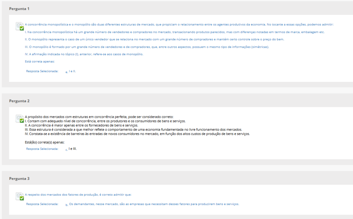 Pergunta 1 A concorrência monopolística e monopólio são duas diferentes estruturas de mercado, que propiciam relacionamento entre os agentes produtivos da No tocante a essas podemos Na concorrência monopolística há um grande número de vendedores e compradores no mercado, transacionando produtos parecidos, mas com diferenças notadas em termos de marca, embalagem etc. II. monopólio representa caso de um único vendedor que se relaciona no mercado com um grande número de compradores e mantém certo controle sobre preço do bem. III. é formado por um grande número de vendedores e de que, entre outros aspectos, possuem mesmo tipo de informações (simétricas). IV. A afirmação indicada no tópico anterior, refere-se aos casos de Está correta apenas: Resposta Selecionada: e. le II. Pergunta 2 A propósito dos mercados com estruturas em concorrência perfeita, pode ser considerado correto: I. Contam com adequado nível de concorrência, entre os produtores e os consumidores de bens e serviços. II. A concorrência é maior apenas entre os fornecedores de bens e serviços. III. Essa estrutura é considerada a que melhor reflete comportamento de uma economia fundamentada no livre funcionamento dos mercados. IV. Constata-se a existência de barreiras às entradas de novos consumidores no mercado, em função dos altos custos de produção de bens e serviços. Está(ão) correta(s) apenas: Resposta Selecionada: III. Pergunta 3 A respeito dos mercados dos fatores de é correto admitir que: Resposta Selecionada: b. Os nesse são as empresas que necessitam desses fatores para produzirem bens e serviços.Pergunta 4 Entre os diferentes tipos de mercados destacam-se: Os em que são disponibilizadas as ofertas de crédito aos agentes II. Os de operações de maior prazo, como é caso dos mercados de capitais. III. Os de operações de menor como é o caso dos IV. Os de câmbio que tratam de operações relacionadas com as necessidades de transações com bens e serviços destinados ou recebidos do correta(s) apenas: Resposta Selecionada: d. III IV. Pergunta 5 Escolha a assertiva que exprime os movimentos verificados com relação às curvas de demanda e de oferta de bens e I. Uma diminuição dos preços dos bens complementares pode fazer com que aumente a demanda pelos bens ou serviços em II. Uma diminuição dos preços dos bens substitutos ocasiona uma redução da oferta pelos bens ou serviços em análise/estudo. III. As mudanças em outros fatores, que não próprio preço do bem ou serviço, fazem com que ocorra um deslocamento, para cima ou para baixo, conforme o caso, de toda a curva de demanda. IV. Esse deslocamento da curva de demanda somente não é verificado quando a análise for feita com base na renda disponível do consumidor. Está(ão) correta(s) apenas: Resposta Selecionada: b. III. Pergunta 6 Escolha entre as alternativas a seguir a que expressa corretamente significado da demanda por bens e serviços: Relacionamento entre os preços e as quantidades efetivamente comercializadas/negociadas de bens e serviços em determinado momento na II. Relação inversa entre os preços praticados nos mercados e os bens e os serviços que os consumidores realmente adquiriram em certa época. III. Demanda não é ato de mas desejo de obtenção de bens e serviços em função, por exemplo, dos seus preços. IV. Apenas o preço influencia a demanda e a oferta de bens e serviços no mercado.Pergunta 7 em 0 pontos das medições da elasticidade da demanda da oferta de bens e serviços importante para subsidiar as decsões dos agentes Nesse a demanda pode ser Resposta a. quando as quantidades demandadas maior do que os dos respectivos c Pergunta 8 0 em 0 pontos de e de oferta determine ponto onde se a de uma economia que no de relação podemos A mede quantidade que pelos consumidores no mercado em função des variações dos preços dos respectivos bens = serviços. indicado na assertiva imediatamente refere-se à demanda dos agentes A demanda mede quantidade que é oferecida pelos agentes dadas as variações preços dos respectivos bens ou IV. As c os preços estabelecidos no cruzamento entre oferta c demanda os pontos em que se comercialização de bens correta(s) Resposta Selecionada a III. Pergunta 9 0 em 0 pontos Os resultados da medição da demanda por um produto X revela que as quantidades procuradas pelos consumidores costumam aumentar menos que em confronto com as mudanças dos preços do bem Essa situação revela um Resposta Demanda inelásticaPergunta 10 0 em pontos Um comerciante precisa estar atento às expectativas da demanda do bem ou serviço que disponibiliza ao mercado: Resposta Selecionada: A preocupação indicada na assertiva (a) é se e quando seu produto apresentar demanda inelástica em relação ao preço.