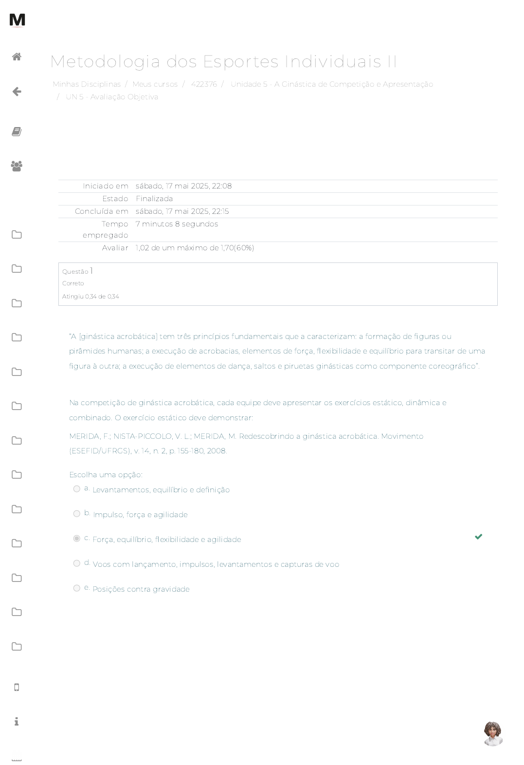 17/05/2025 22:15 UN 5 - Avaliação Objetiva: Revisão da tentativa https://avap.multivix.edu.br/mod/quiz/review.php?attempt=8191468&cmid=1879336 1/4 Minhas Disciplinas / Meus cursos / 422376 / Unidade 5 - A Ginástica de Competição e Apresentação / UN 5 - Avaliação Objetiva Metodologia dos Esportes Individuais II Iniciado em sábado, 17 mai 2025, 22:08 Estado Finalizada Concluída em sábado, 17 mai 2025, 22:15 Tempo empregado 7 minutos 8 segundos Avaliar 1,02 de um máximo de 1,70(60%) Questão 1 Correto Atingiu 0,34 de 0,34 “A [ginástica acrobática] tem três princípios fundamentais que a caracterizam: a formação de �guras ou pirâmides humanas; a execução de acrobacias, elementos de força, �exibilidade e equilíbrio para transitar de uma �gura à outra; a execução de elementos de dança, saltos e piruetas ginásticas como componente coreográ�co”. Na competição de ginástica acrobática, cada equipe deve apresentar os exercícios estático, dinâmica e combinado. O exercício estático deve demonstrar: MERIDA, F.; NISTA-PICCOLO, V. L.; MERIDA, M. Redescobrindo a ginástica acrobática. Movimento (ESEFID/UFRGS), v. 14, n. 2, p. 155-180, 2008. Escolha uma opção: a. Levantamentos, equilíbrio e de�nição b. Impulso, força e agilidade c. Força, equilíbrio, �exibilidade e agilidade d. Voos com lançamento, impulsos, levantamentos e capturas de voo e. Posições contra gravidade https://avap.multivix.edu.br/my/ https://avap.multivix.edu.br/course/view.php?id=33183 https://avap.multivix.edu.br/course/view.php?id=33183§ion=6 https://avap.multivix.edu.br/mod/quiz/view.php?id=1879336 https://avap.multivix.edu.br/my/ https://avap.multivix.edu.br/course/view.php?id=33183 https://avap.multivix.edu.br/user/index.php?id=33183 https://avap.multivix.edu.br/course/view.php?id=33183§ion=1 https://avap.multivix.edu.br/course/view.php?id=33183§ion=2 https://avap.multivix.edu.br/course/view.php?id=33183§ion=3 https://avap.multivix.edu.br/course/view.php?id=33183§ion=4 https://avap.multivix.edu.br/course/view.php?id=33183§ion=5 https://avap.multivix.edu.br/course/view.php?id=33183§ion=6 https://avap.multivix.edu.br/course/view.php?id=33183§ion=7 https://avap.multivix.edu.br/course/view.php?id=33183§ion=8 https://avap.multivix.edu.br/course/view.php?id=33183§ion=9 https://avap.multivix.edu.br/course/view.php?id=33183§ion=10 https://avap.multivix.edu.br/course/view.php?id=33183§ion=11 https://avap.multivix.edu.br/course/view.php?id=33183§ion=12 https://avap.multivix.edu.br/course/view.php?id=33183§ion=13 https://avap.multivix.edu.br/hooks/portal/ https://avap.multivix.edu.br/mod/page/view.php?id=1252%2F%22%20target%3D%22_blank https://avap.multivix.edu.br/calendar/view.php/ https://avap.multivix.edu.br/ 17/05/2025 22:15 UN 5 - Avaliação Objetiva: Revisão da tentativa https://avap.multivix.edu.br/mod/quiz/review.php?attempt=8191468&cmid=1879336 2/4 Questão 2 Incorreto Atingiu 0,00 de 0,34 Questão 3 Incorreto Atingiu 0,00 de 0,34 “Os árbitros [da ginástica rítmica] avaliam as ginastas através de anotações feitas a partir da observação dos exercícios (séries ou composições). Para isso, eles devem conhecer inúmeros símbolos, valores de penalidades e critérios de julgamento, para que possam tomar suas decisões rapidamente e de forma correta”. A arbitragem da ginástica rítmica é formada por 10 árbitros divididos em dois painéis para avaliar diferentes aspectos do exercício. Cada painel determina uma parte da nota do exercício, que são: DEBIEN, P. B.; NOCE, F.; DEBIEN, J. B. P.;COSTA, V. T. D. O estresse na arbitragem de ginástica rítmica: uma revisão sistemática. Revista da Educação Física/UEM, v. 25, n. 3, p. 489-500, 2014. Escolha uma opção: a. Di�culdade e execução b. Aparelho e coreogra�a c. Técnica e artística d. A e B e. Penalidades e composição “A Ginástica Rítmica (GR) é uma modalidade esportiva que relaciona de forma �uente o corpo, a música e o aparelho. Possui um lado artístico e outro desportivo, nos quais a expressão e os elementos corporais formam uma unidade entre [o] atleta e o aparelho, exigindo a execução perfeita em sincronia e harmonia com a música”. De acordo com o código de pontuação, as manipulações de cada aparelho da ginástica rítmica são divididas entre dois grupos de elementos. Esses grupos são: MARQUES, C. M.; SILVA, S. E. F.; MATTES, V. V.; PALUDO, A. C. Ansiedade pré-competitiva e desempenho em jovens atletas de ginástica rítmica: um estudo de caso. Caderno de Educação Física e Esporte, v. 18, n. 3, p. 1-4, 2020. Escolha uma opção: a. Básico e especial b. Mandatório e eletivo c. Fundamental e não fundamental d. Di�culdade e movimento e. Fixo e criação https://avap.multivix.edu.br/my/ https://avap.multivix.edu.br/course/view.php?id=33183 https://avap.multivix.edu.br/user/index.php?id=33183 https://avap.multivix.edu.br/course/view.php?id=33183§ion=1 https://avap.multivix.edu.br/course/view.php?id=33183§ion=2 https://avap.multivix.edu.br/course/view.php?id=33183§ion=3 https://avap.multivix.edu.br/course/view.php?id=33183§ion=4 https://avap.multivix.edu.br/course/view.php?id=33183§ion=5 https://avap.multivix.edu.br/course/view.php?id=33183§ion=6 https://avap.multivix.edu.br/course/view.php?id=33183§ion=7 https://avap.multivix.edu.br/course/view.php?id=33183§ion=8 https://avap.multivix.edu.br/course/view.php?id=33183§ion=9 https://avap.multivix.edu.br/course/view.php?id=33183§ion=10 https://avap.multivix.edu.br/course/view.php?id=33183§ion=11 https://avap.multivix.edu.br/course/view.php?id=33183§ion=12 https://avap.multivix.edu.br/course/view.php?id=33183§ion=13 https://avap.multivix.edu.br/hooks/portal/ https://avap.multivix.edu.br/mod/page/view.php?id=1252%2F%22%20target%3D%22_blank https://avap.multivix.edu.br/calendar/view.php/ 17/05/2025 22:15 UN 5 - Avaliação Objetiva: Revisão da tentativa https://avap.multivix.edu.br/mod/qui