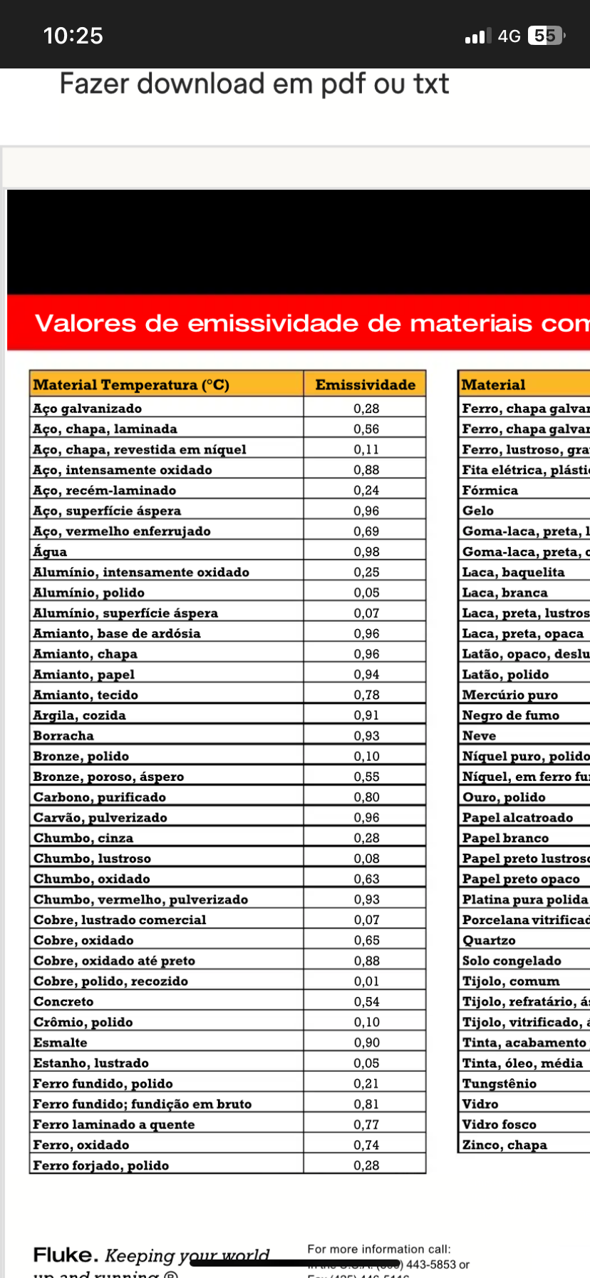 10:25 4G 55 Fazer download em pdf txt Valores de emissividade de materiais con Material Temperatura Emissividade Material Aço galvanizado 0,28 Ferro, chapa galvar Aço, chapa, laminada 0,56 Ferro, chapa galvar Aço, chapa, revestida em níquel 0,11 Ferro, lustroso, Aço, intensamente oxidado 0,88 Fita elétrica, plásti Aço, recém-laminado 0,24 Aço, superfície áspera 0,96 Gelo Aço, vermelho enferrujado 0,69 Goma-laca, preta, 1 Água 0,98 Goma-laca, preta, d Alumínio, intensamente oxidado 0,25 Laca, baquelita Alumínio, polido 0,05 Laca, branca Alumínio, superfície áspera 0,07 Laca, preta, lustros Amianto, base de ardósia 0,96 Laca, preta, opaca Amianto, chapa 0,96 Latão, opaco, deslu Amianto, papel 0,94 Latão, polido Amianto, tecido 0,78 Mercúrio puro Argila, cozida 0,91 Negro de fumo Borracha 0,93 Neve Bronze, polido 0,10 Níquel puro, polido Bronze, poroso, áspero 0,55 Níquel, em ferro Carbono, purificado 0,80 Ouro, polido Carvão, pulverizado 0,96 Papel alcatroado Chumbo, cinza 0,28 Papel branco Chumbo, lustroso 0,08 Papel preto lustroso Chumbo, oxidado 0,63 Papel preto opaco Chumbo, vermelho, pulverizado 0,93 Platina pura polida Cobre, lustrado comercial 0,07 Porcelana vitrificad Cobre, oxidado 0,65 Quartzo Cobre, oxidado até preto 0,88 Solo congelado Cobre, polido, recozido 0,01 Tijolo, comum Concreto 0,54 Tijolo, refratário, Crômio, polido 0,10 Tijolo, vitrificado, Esmalte 0,90 Tinta, acabamento Estanho, lustrado 0,05 Tinta, óleo, média Ferro fundido, polido 0,21 Tungstênio Ferro fundido; fundição em bruto 0,81 Vidro Ferro laminado a quente 0,77 Vidro fosco Ferro, oxidado 0,74 Zinco, chapa Ferro forjado, polido 0,28 For more information call: Fluke. Keeping your world 443-5853 or