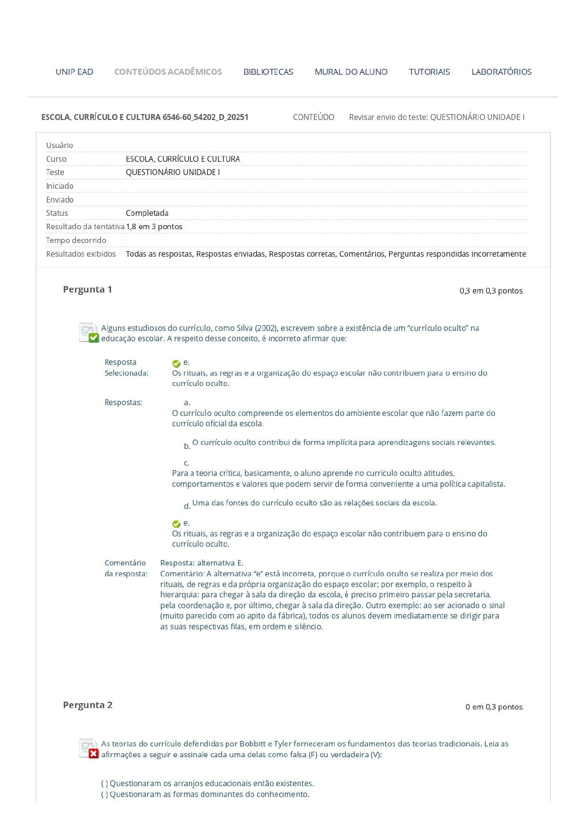 UNIP EAD CONTEÚDOS ACADÊMICOS BIBLIOTECAS MURAL DO ALUNO TUTORIAIS LABORATÓRIOS ESCOLA, CURRÍCULO E CULTURA CONTEÚDO Revisar envio do teste: QUESTIONÁRIO UNIDADE Usuário Curso ESCOLA, CURRÍCULO E CULTURA Teste QUESTIONÁRIO UNIDADE Iniciado Enviado Status Completada Resultado da tentativa 1,8 em 3 pontos Tempo decorrido Resultados exibidos Todas as respostas, Respostas enviadas, Respostas corretas, Comentários, Perguntas respondidas incorretamente Pergunta 1 0,3 em 0,3 pontos Alguns estudiosos do como Silva (2002), escrevem sobre a existência de um "currículo oculto" na educação escolar. A respeito desse conceito, é incorreto afirmar que: Resposta e. Selecionada: Os rituais, as regras e a organização do espaço escolar não contribuem para o ensino do currículo oculto. Respostas: a. o currículo oculto compreende os elementos do ambiente escolar que não fazem parte do currículo oficial da escola. b. currículo oculto contribui de forma implícita para aprendizagens sociais relevantes. C. Para a teoria crítica, basicamente, o aluno aprende no currículo oculto atitudes, comportamentos e valores que podem servir de forma conveniente a uma política capitalista. d. Uma das fontes do currículo oculto são as relações sociais da escola. e. Os rituais, as regras e a organização do espaço escolar não contribuem para o ensino do currículo oculto. Comentário Resposta: alternativa E. da resposta: Comentário: A alternativa "e" está incorreta, porque o currículo oculto se realiza por meio dos rituais, de regras e da própria organização do espaço escolar; por exemplo, o respeito à hierarquia: para chegar à sala da direção da escola, é preciso primeiro passar pela secretaria, pela coordenação e, por último, chegar à sala da direção. Outro exemplo: ao ser acionado o sinal (muito parecido com ao apito da fábrica), todos os alunos devem imediatamente se dirigir para as suas respectivas filas, em ordem e silêncio. Pergunta 2 0 em 0,3 pontos As teorias do currículo defendidas por Bobbitt e Tyler forneceram os fundamentos das teorias tradicionais. Leia as afirmações a seguir e assinale cada uma delas como falsa (F) ou verdadeira (V): Questionaram os arranjos educacionais então existentes. Questionaram as formas dominantes do conhecimento.Concentraram-se na elaboração técnica do currículo. Procuraram compreender a função do currículo. Estabeleceram relações entre a escola e a economia, a educação e a produção. Resposta Selecionada: a. Respostas: V, F, V. V a. b. V. F d. e. Pergunta 3 0 em 0,3 pontos Christian Baudelot e Roger Establet argumentam que, na sociedade capitalista, o sistema escolar é dualista. Isso significa que: Resposta d. Selecionada: A diferenciação entre a informação e o conhecimento gera o dualismo escolar, dado o fato de vivermos, simultaneamente, na era da informática e na era do conhecimento. Respostas: a. A educação na sociedade capitalista é a mesma para todos. b. A rede primária e profissionalizante, destinada a fornecer uma mão de obra de execução, é oposta à rede secundária e superior, que prepara para o exercício das funções de concepção e de comando. o currículo escolar não interfere na formação da mão de obra no capitalismo. d. A diferenciação entre a informação e o conhecimento gera o dualismo escolar, dado o fato de vivermos, simultaneamente, na era da informática e na era do conhecimento. e. A maneira como se organiza a economia não interfere na organização da educação. Pergunta 4 0,3 em 0,3 pontos De acordo com Pacheco (2005), os estudos sobre as origens do currículo demonstram que o termo aparece vinculado às transformações na forma de organização da escola, a fim de garantir maior eficiência escolar. Por isso, pode-se afirmar que o termo currículo, no campo educacional, apresenta-se como um princípio de racionalidade, ou seja: Resposta C. Selecionada: Aparece vinculado à necessidade de ampliação do atendimento escolar e, por isso, de proporcionar maior controle, padronização e eficiência educacional. Respostas: Surgiu como a forma particular da escola lidar com os alunos em sala de aula. a. b. Está vinculado ao pensamento científico, que visa garantir o uso adequado dos recursos em sala de aula. Aparece vinculado à necessidade de ampliação do atendimento escolar e, por isso, de proporcionar maior controle, padronização e eficiência educacional. d. Pode ser comparado ao sistema aberto e flexível de ordenação dos recursos escolares.e. Está vinculado ao pensamento construtivista, que visa garantir o uso adequado dos recursos didáticos na sala de aula. Comentário Resposta: alternativa C. da resposta: Comentário: o termo currículo surge num momento histórico nos EUA, em que há o aumento da busca pela escolarização devido à industrialização. Portanto, a escola precisava de uma organização curricular que permitisse o sucesso e a aprendizagem de todos. Dessa forma, a racionalidade técnica poderia garantir eficiência e controle da aprendizagem, pois era utilizada na indústria e obtinha sucesso. Pergunta 5 0,3 em 0,3 pontos Em 1918, Bobbitt publicou o livro The curriculum, com uma proposta claramente conservadora. Bobbitt defendia que: I. A escola deveria funcionar com um processo análogo ao das empresas comerciais e industriais. II. o sistema educacional deveria ser capaz de especificar precisamente quais resultados obteria. III. A educação deveria funcionar de acordo com os princípios da administração científica, proposta por Taylor. IV. A discussão sobre temas abstratos incluía-se entre as finalidades últimas da educação. Está correto o que se afirma em: Resposta Selecionada: d. e III. Respostas: a. I, II e IV. b. C. III e IV. d. e III. e. III. Comentário da Resposta: alternativa D. resposta: Comentário: A afirmação IV está incorreta, porque Bobbitt não discutiu temas abstratos, muito pelo contrário: sua teoria era obj