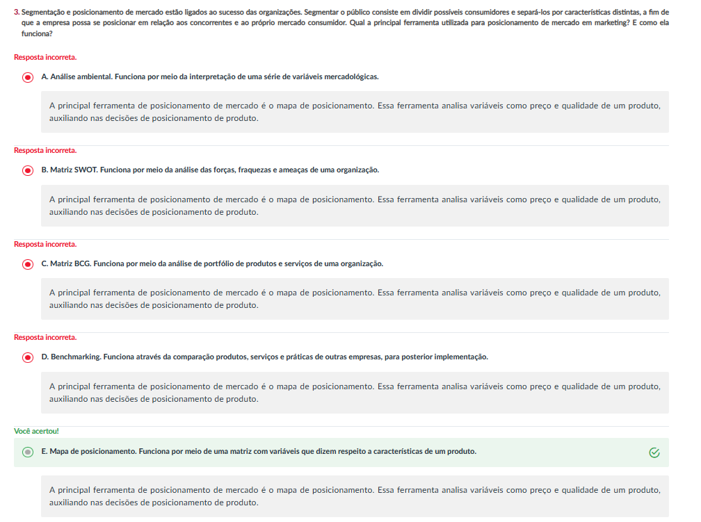 3. Segmentação e posicionamento de mercado estão ligados ao sucesso das organizações Segmentar público consiste em dividir possíveis consumidores e separá-los por características distintas, a fim de que a empresa possa se posicionar em relação aos concorrentes e ao próprio mercado consumidor. Qual a principal ferramenta utilizada para posicionamento de mercado em marketing? E como ela funciona? Resposta incorreta. A Funciona por meio da interpretação de uma série de variáveis A principal ferramenta de posicionamento de mercado é o mapa de posicionamento. Essa ferramenta analisa variáveis como preço e qualidade de um produto, auxiliando nas decisões de posicionamento de produto. Resposta B. Matriz SWOT. Funciona por meio da analise das forças, fraquezas e ameaças de uma organização. A principal ferramenta de posicionamento de mercado é mapa de posicionamento. Essa ferramenta analisa variáveis como preço e qualidade de um auxiliando nas decisões de posicionamento de produto. Resposta incorreta. C. Matriz Funciona por meio da análise de portfólio de produtos e serviços de uma organização. A principal ferramenta de posicionamento de mercado é mapa de posicionamento. Essa ferramenta analisa variáveis como preço e qualidade de um auxiliando nas decisões de posicionamento de produto. Resposta incorreta. D. Funciona através da comparação serviços e práticas de outras empresas, para posterior implementação. A principal ferramenta de posicionamento de mercado é mapa de posicionamento. Essa ferramenta analisa variáveis como preço e qualidade de um produto, auxiliando nas decisões de posicionamento de produto. Você acertou! E. Mapa de posicionamento. Funciona por meio de uma matriz com variáveis que dizem respeito a características de um produto. A principal ferramenta de posicionamento de mercado é mapa de posicionamento. Essa ferramenta analisa variáveis como preço e qualidade de um produto, auxiliando nas decisões de posicionamento de produto.