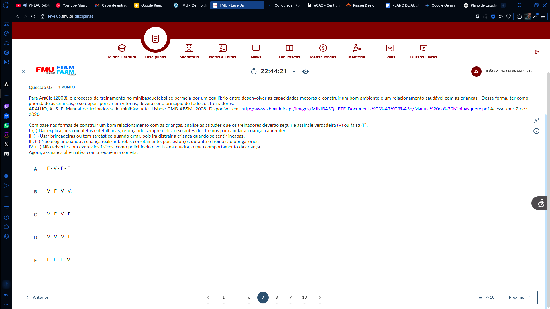 (1) LACRADA YouTube Music M Caixa de entrad Google Keep FMU Centro U FMU LevelUp Concursos Po eCAC Centro Passei Direto PLANO DE AUL Google Gemini Plano de Estudo Q levelup.fmu.br/disciplinas .. $ Minha Carreira Disciplinas Secretaria Notas e Faltas News Bibliotecas Mensalidades Mentoria Salas Cursos Livres FMU FIAM FAAM 22:44:21 JS JOÃO PEDRO FERNANDES D.. Questão 07 1 PONTO Para Araújo (2008), o processo de treinamento no minibasquetebol se permeia por um equilíbrio entre desenvolver as capacidades motoras e construir um bom ambiente e um relacionamento saudável com as crianças. Dessa forma, ter como prioridade as crianças, e só depois pensar em deverá ser o princípio de todos os A. S. P. Manual de treinadores de Lisboa: CMB ABSM, 2008. 7 dez 2020. Com base nas formas de construir um bom relacionamento com as crianças, analise as atitudes que os treinadores deverão seguir e assinale verdadeira (V) ou falsa (F) I. ( ) Dar explicações completas e detalhadas, reforçando sempre o discurso antes dos treinos para ajudar a criança a aprender. II. ( ) Usar brincadeiras ou tom sarcástico quando errar, pois irá distrair a criança quando se sentir incapaz. III. ( ) Não elogiar quando a criança realizar tarefas corretamente. pois esforços durante o treino são obrigatórios. IV. ( ) Não advertir com exercícios físicos, como polichinelo e voltas na quadra, o mau comportamento da criança. Agora, assinale a alternativa com a correta. A F B C V-F-V-F D F. E GX 7/10 Próximo >