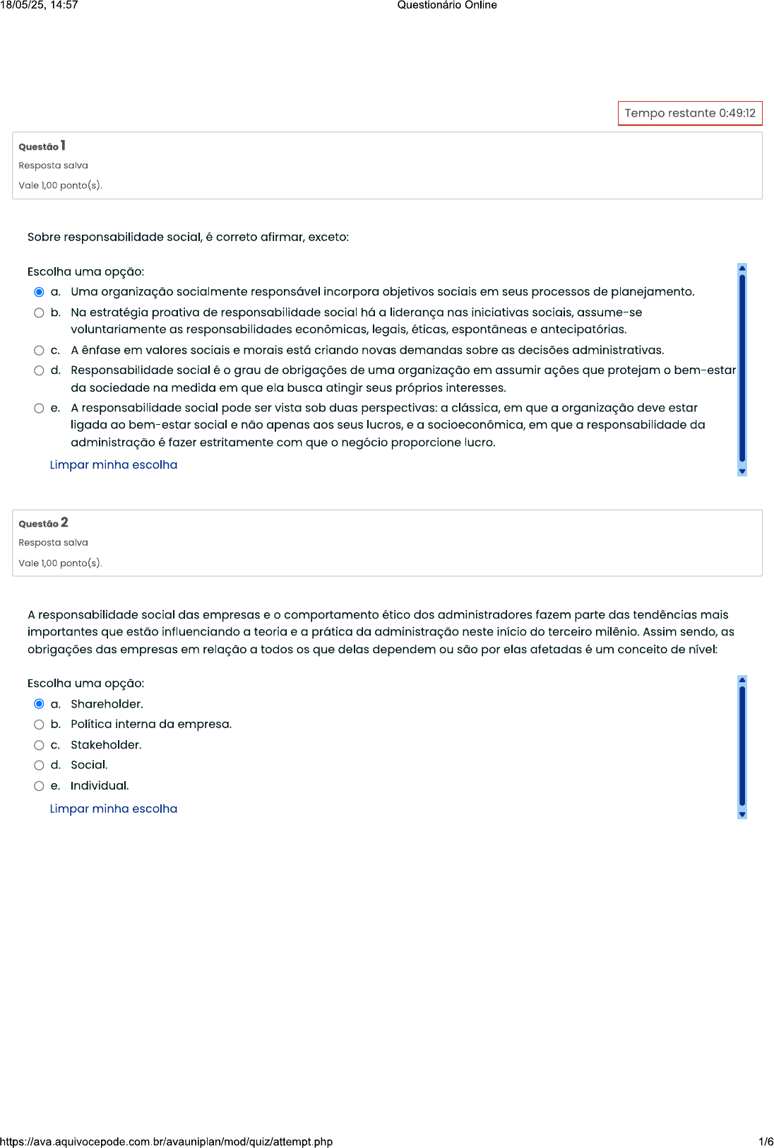 18/05/25, 14:57 Questionário Online Tempo restante 0:49:12 Questão 1 Resposta salva Vale 1,00 ponto(s). Sobre responsabilidade social, é correto afirmar, exceto: Escolha uma opção: a. Uma organização socialmente responsável incorpora objetivos sociais em seus processos de planejamento. b. Na estratégia proativa de responsabilidade social há a liderança nas iniciativas sociais, assume-se voluntariamente as responsabilidades econômicas, legais, éticas, espontâneas e antecipatórias. C. A ênfase em valores sociais e morais está criando novas demandas sobre as decisões administrativas. d. Responsabilidade social é o grau de obrigações de uma organização em assumir ações que protejam o bem-estar da sociedade na medida em que ela busca atingir seus próprios interesses. e. A responsabilidade social pode ser vista sob duas perspectivas: a clássica, em que a organização deve estar ligada ao bem-estar social e não apenas seus lucros, e a socioeconômica, em que a responsabilidade da administração é fazer estritamente com que o negócio proporcione lucro. Limpar minha escolha Questão 2 Resposta salva Vale 1,00 ponto(s). A responsabilidade social das empresas e o comportamento ético dos administradores fazem parte das tendências mais importantes que estão influenciando a teoria e a prática da administração neste início do terceiro milênio. Assim sendo, as obrigações das empresas em relação a todos os que delas dependem ou são por elas afetadas é um conceito de nível: Escolha uma opção: a. Shareholder. b. Política interna da empresa. C. Stakeholder. d. Social. e. Limpar minha escolha 1/618/05/25, 14:57 Questionário Online Questão 3 Resposta salva Vale 1,00 ponto(s). conceito clássico de desenvolvimento sustentável afirma que "É o desenvolvimento capaz de suprir as necessidades da geração atual, sem comprometer a capacidade de atender as necessidades das futuras gerações. É o desenvolvimento que não esgota os recursos para o futuro" (BRUNDTLAND, 1991). São componentes de desenvolvimento sustentável: Escolha uma opção: a. Compromisso socioeconômico, desenvolvimento ambiental e o controle dos direitos humanos. b. Sustentabilidade ambiental, sustentabilidade econômica e sustentabilidade sociopolítica. C. Política cultural, atividade comercial e proteção natural. d. Desenvolvimento econômico, controle sociopolítico e ambiental. e. Desenvolvimento político, desenvolvimento econômico e controle ambiental. Limpar minha escolha Questão 4 Resposta salva Vale 1,00 ponto(s). Desenvolvimento sustentável: Escolha uma opção: a. Pode ser alcançado somente através de políticas e diretrizes governamentais de estímulo à redução do crescimento populacional do país, tendo em vista que a dinâmica demográfica exerce forte impacto sobre o meio ambiente em geral e os recursos naturais em particular. b. Significa crescimento econômico com utilização dos recursos naturais, porém com respeito ao meio ambiente, à preservação das espécies e à dignidade humana, de modo a garantir a satisfação das necessidades das presentes e futuras gerações. C. Significa crescimento da economia, demonstrado pelo aumento anual do Produto Nacional Bruto (PNB) combinado com melhorias tecnológicas e ganhos sociais relevantes. d. E crescimento econômico são sinônimos, significando atividades de incentivo ao desenvolvimento do país, seguindo modelos de avanço tecnológico e científico. e. Envolve iniciativas que concebem o meio ambiente de modo articulado com as questões sociais, tais como: saúde, habitação e educação, e que estimulem uma visão acrítica da população acerca das questões ambientais. Limpar minha escolha 2/618/05/25, 14:57 Questionário Online Questão 5 Resposta salva Vale 1,00 ponto(s). Segundo o conceito vigente de responsabilidade social corporativa, uma empresa pública deve: Escolha uma opção: a. Incorporar o processo de gestão socialmente responsável como um instrumento que proporciona vantagens competitivas frente a seus concorrentes. b. Levar em consideração, prioritariamente, sua responsabilidade política, pois deve expressar os interesses do governo eleito democraticamente. C. Buscar a legitimação de suas ações por meio da implantação de instrumentos de responsabilização dos gestores pelos resultados alcançados. d. Cumprir sua responsabilidade social, exercendo com eficiência suas atividades essenciais. e. Incorporar em seu planejamento o máximo possível de atividades beneficentes para os setores mais carentes da sociedade. Limpar minha escolha Questão 6 Resposta salva Vale 1,00 ponto(s). A ideia de desenvolvimento sustentável tem sido cada vez mais discutida junto às questões que se referem ao crescimento econômico. De acordo com este conceito, considera-se que: Escolha uma opção: a. Os países subdesenvolvidos são os únicos que praticam esta ideia, pois, por sua baixa industrialização, preservam melhor seu meio ambiente do que os países ricos. b. meio ambiente é fundamental para a vida humana e, portanto, deve ser intocável. C. Deve-se buscar uma forma de progresso socioeconômico que não comprometa meio ambiente sem que, com isso, deixemos de utilizar os recursos nele disponíveis. d. São as riquezas acumuladas nos países ricos em prejuízo das antigas colônias durante a expansão colonial que devem, hoje, sustentar o crescimento econômico dos povos. e. Ocorre uma oposição entre desenvolvimento e proteção ao meio ambiente e, portanto, é inevitável que os riscos ambientais sustentem o crescimento econômico dos povos. Limpar minha escolha 3/618/05/25, 14:57 Questionário Online Questão 7 Resposta salva Vale 1,00 ponto(s). Leia texto para responder à questão: Os produtos ecológicos estão dominando as prateleiras do comércio. Mesmo com tantas opções, há resistência na hora da compra. Isso acontece porque o custo de tais itens é sempre mais elevado em comp