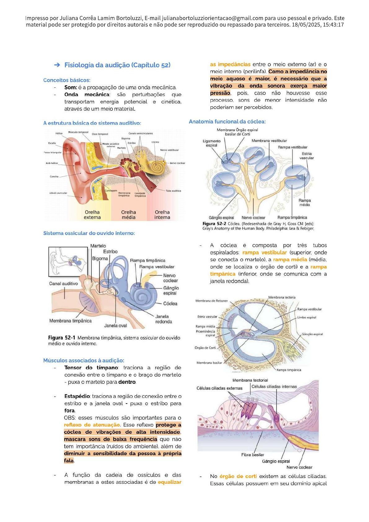 Impresso por Juliana Corrêa Lamim Bortoluzzi, E-mail julianabortoluzziorientacao@gmail.com para uso pessoal e privado. Este material pode ser protegido por direitos autorais e não pode ser reproduzido ou repassado para terceiros. 18/05/2025, 15:43:17 Fisiologia da audição (Capítulo 52) as impedâncias entre o meio externo (ar) e o meio interno (perilinfa). Como a impedância no Conceitos básicos: meio aquoso é maior, é necessário que a Som: é a propagação de uma onda vibração da onda sonora exerça maior Onda mecânica: são perturbações que pressão. pois, caso não houvesse esse transportam energia potencial e sons de menor intensidade não através de um meio material. poderiam ser percebidos. A estrutura básica do sistema auditivo: Anatomia funcional da cóclea: Membrana Órgão espiral Hélice Músculo temporal Osso temporal Canais semicirculares basilar de Corti Escafa Estribo Ligamento Membrana vestibular Meato acustico externo espiral Martelo Rampa vestibular Nerve vestibular triangular Estria vascular Anti-hélice Nervo coclear Concha Cartilagem Tuba auditiva auricular Membrana Cavidade Rampa média Orelha Orelha Orelha externa média interna espiral Nervo coclear Rampa timpânica Figura 52-2 Cóclea. (Redesenhada de Gray H, Goss CM [eds]: Gray's Anatomy of the Human Lea & Febiger, Sistema ossicular do ouvido interno: Martelo A cóclea é composta por três tubos Estribo espiralados: rampa vestibular (superior, onde Bigorna Rampa timpânica se conecta a rampa média Rampa vestibular onde se localiza o órgão de corti) e a rampa Nervo timpânica (inferior, onde se comunica com a coclear Canal auditivo janela redonda). Gânglio espiral Membrana Membrana de Reissner Cóclea Rampa vestibular Janela Estria vascular Limbo espiral Membrana timpânica redonda Janela oval Rampa média Proeminência espiral espiral Figura 52-1 Membrana timpânica, sistema ossicular do ouvido médio e ouvido interno. Orgão de Corti Músculos associados à audição: Membrana basilar Tensor do traciona a região de Rampa timpânica conexão entre timpano e braço do martelo puxa o martelo para dentro. Membrana tectorial Células ciliadas externas Células ciliadas internas Estapédio: traciona a região de conexão entre estribo e a janela oval puxa o estribo para fora. OBS: esses músculos são importantes para o reflexo de atenuação. Esse reflexo protege a cóclea de vibrações de alta mascara sons de baixa frequência que não tem importância do além de diminuir a sensibilidade da pessoa à própria Fibra basilar fala. Gânglio espiral Nervo coclear A função da cadeia de e das - No órgão de corti existem as células membranas a estes associadas é de equalizar Essas células possuem em seu domínio apicalImpresso por Juliana Corrêa Lamim Bortoluzzi, E-mail julianabortoluzziorientacao@gmail.com para uso pessoal e privado. Este material pode ser protegido por direitos autorais e não pode ser reproduzido ou repassado para terceiros. 18/05/2025, 15:43:17 Estas células são divididas em relacionados à maior atividade das células internas e As células ciliadas ciliadas externas são menos abundantes que as internas, são as células externas que Vias da audição: fazem sinapse com as fibras do nervo coclear. A excitação das células ciliadas envolve o movimento dos estereocilios para um lado ou para o outro (despolarização e Acredita-se que neurotransmissor envolvido nessa sinapse seja glutamato. movimento dos estereocilios é realizado pelo movimento da membrana As células ciliadas são estimuladas sempre que ocorre auditivo movimento da membrana basilar contra a primário membrana tectorial. Mesencéfalo Núcleo geniculado mediai Conforme já foi dito, a cóclea é formada por 3 tubos. líquido que preenche as rampas Colículo vestibular e timpânica é preenchido pela inferior perilinfa, um líquido com composição muito Mesencéfalo similar ao LCR. A rampa média é preenchida pela endolinfa, um líquido com composição muito diferente da perilinfa. A endolinfa é rica em potássio e pobre em sódio - a Núcleo do região apical das células ciliadas é banhada lemnisco pela endolinfa, enquanto corpo celular é Ponte lateral banhado pela perilinfa. Essa grande diferença de concentração tem como consequência uma grande diferença de potencial. que, por sua vez, torna as células ciliadas ainda mais tornando-as capazes de responder Ponte Núcleo ao som mais discreto. S Estria oli vares Cada porção da cóclea vibra mais para um dorsal superio Núcleos res determinado intervalo de frequência cocleares Ponto Sons de alta frequência vibram mais a Bulbo membrana basilar proximal, enquanto sons de N. VIII baixa frequência vibram mais a membrana Corpo trapezoide basilar distal, próximo ao helicotrema. Dessa maneira é possível determinar a frequência - córtex auditivo primário apresenta um mapa de um som de acordo com o local estimulado tonotopico - as frequências discriminadas em - principio de lugar. Para a distinção de diferentes regiões da cóclea são transmitidas a frequências sonoras percebidas pela mesma porções específicas do córtex auditivo primário. região da também são interpretados a Alta frequência de disparos gerados pelas células frequência Baixa basilares - de frequência. frequência Para determinação da intensidade 3 mecanismos são utilizados: 1. o aumento da intensidade promove maior frequência de vibração da membrana 2. aumento da intensidade promove a estimulação de maior número de células ciliadas - somação Primário espacial. 3. As células ciliadas externas não são De associação muito ativadas para sons de baixa intensidade. Sons de alta intensidade estariam - Para determinar a direção de onde o som vem, nosso sistema nervoso utiliza as informaçõesImpresso por Juliana Corrêa Lamim Bortoluzzi, E-mail julianabortoluzziorientacao@gmail.com para uso pessoal e privado. Este material pode ser protegido po