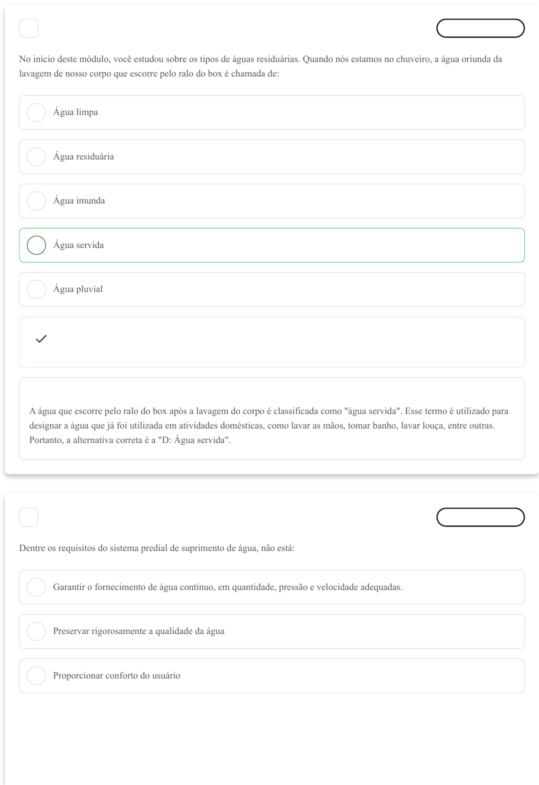 A B C D E A B C 1 Marcar para revisão No início deste módulo, você estudou sobre os tipos de águas residuárias. Quando nós estamos no chuveiro, a água oriunda da lavagem de nosso corpo que escorre pelo ralo do box é chamada de: Água limpa Água residuária Água imunda Água servida Água pluvial Resposta correta Parabéns, você selecionou a alternativa correta. Confira o gabarito comentado! Gabarito Comentado A água que escorre pelo ralo do box após a lavagem do corpo é classificada como "água servida". Esse termo é utilizado para designar a água que já foi utilizada em atividades domésticas, como lavar as mãos, tomar banho, lavar louça, entre outras. Portanto, a alternativa correta é a "D: Água servida". 2 Marcar para revisão Dentre os requisitos do sistema predial de suprimento de água, não está: Garantir o fornecimento de água contínuo, em quantidade, pressão e velocidade adequadas. Preservar rigorosamente a qualidade da água Proporcionar conforto do usuário 13/05/2025, 18:31 estacio.saladeavaliacoes.com.br/exercicio/6823b8d0b69e418414511be8/gabarito/ https://estacio.saladeavaliacoes.com.br/exercicio/6823b8d0b69e418414511be8/gabarito/ 1/4 D E A B C D E Proporcionar higiene do usuário Garantir apenas a pressão mínima para o abastecimento, mesmo se a família necessitar de um fornecimento maior. Resposta correta Parabéns, você selecionou a alternativa correta. Confira o gabarito comentado! Gabarito Comentado O sistema predial de suprimento de água deve garantir o fornecimento de água contínuo, em quantidade, pressão e velocidade adequadas, preservando rigorosamente a qualidade da água, proporcionando conforto e higiene do usuário. A alternativa E está incorreta porque não é um requisito do sistema predial de suprimento de água. 3 Marcar para revisão Durante o estudo deste módulo, vimos vários componentes da rede de coleta de águas servidas. Qual o nome que se dá à caixa destinada a permitir a inspeção, limpeza, desobstrução, junção, mudanças de declividade e/ou direção das tubulações? Coletor predial Subcoletor predial Caixa de gordura Caixa de inspeção Caixa separadora Resposta correta Parabéns, você selecionou a alternativa correta. Confira o gabarito comentado! Gabarito Comentado A caixa de inspeção é o componente da rede de coleta de águas servidas que permite a inspeção, limpeza, desobstrução, junção, mudanças de declividade e/ou direção das tubulações. Ela é essencial para a manutenção adequada do sistema, garantindo seu funcionamento eficiente e evitando problemas como entupimentos e vazamentos. 13/05/2025, 18:31 estacio.saladeavaliacoes.com.br/exercicio/6823b8d0b69e418414511be8/gabarito/ https://estacio.saladeavaliacoes.com.br/exercicio/6823b8d0b69e418414511be8/gabarito/ 2/4 A B C D E A B C 4 Marcar para revisão Ao material que geralmente é utilizado em tubos e conexões em instalações hidráulicas, bem como instalações elétricas, mecânicas e de aquecimento, com a utilização de um quadro de distribuição hidráulica dentro de um determinado ambiente, dá-se o nome de: PVC CPVC PPR Polietileno PEX Resposta incorreta Opa! A alternativa correta é a letra E. Confira o gabarito comentado! Gabarito Comentado O material que é comumente utilizado em tubos e conexões em instalações hidráulicas, elétricas, mecânicas e de aquecimento, com a utilização de um quadro de distribuição hidráulica dentro de um determinado ambiente, é conhecido como PEX. Este material é altamente resistente e flexível, sendo ideal para esses tipos de instalações. Portanto, a alternativa correta é a E: PEX. 5 Marcar para revisão Estudamos sobre os sistemas hidrossanitários racionais, importantes pois buscam o máximo de economia na utilização dos materiais e, consequentemente, a diminuição do desperdício na construção. Dentre os sistemas estudados, o nome que se dá à abertura vertical na alvenaria por onde passam as instalações essenciais em qualquer construção é: Piso box Shaft Drywall 13/05/2025, 18:31 estacio.saladeavaliacoes.com.br/exercicio/6823b8d0b69e418414511be8/gabarito/ https://estacio.saladeavaliacoes.com.br/exercicio/6823b8d0b69e418414511be8/gabarito/ 3/4 D E Manifold PPR Resposta correta Parabéns, você selecionou a alternativa correta. Confira o gabarito comentado! Gabarito Comentado O termo "Shaft" é utilizado para designar a abertura vertical na alvenaria por onde passam as instalações essenciais em qualquer construção. Essa estrutura é fundamental para acomodar as instalações de forma organizada e segura, permitindo também um fácil acesso para manutenções futuras. Portanto, a alternativa correta é a "B". 13/05/2025, 18:31 estacio.saladeavaliacoes.com.br/exercicio/6823b8d0b69e418414511be8/gabarito/ https://estacio.saladeavaliacoes.com.br/exercicio/6823b8d0b69e418414511be8/gabarito/ 4/4 A B C D E A B C 1 Marcar para revisão Estudamos sobre os sistemas hidrossanitários racionais, importantes pois buscam o máximo de economia na utilização dos materiais e, consequentemente, a diminuição do desperdício na construção. Dentre os sistemas estudados, o nome que se dá à abertura vertical na alvenaria por onde passam as instalações essenciais em qualquer construção é: Piso box Shaft Drywall Manifold PPR Resposta correta Parabéns, você selecionou a alternativa correta. Confira o gabarito comentado! Gabarito Comentado O termo "Shaft" é utilizado para designar a abertura vertical na alvenaria por onde passam as instalações essenciais em qualquer construção. Essa estrutura é fundamental para acomodar as instalações de forma organizada e segura, permitindo também um fácil acesso para manutenções futuras. Portanto, a alternativa correta é a "B". 2 Marcar para revisão Durante o estudo deste módulo, vimos vários componentes da rede de coleta de águas servidas. Qual o nome que se dá à caixa destinada a permitir a inspeção, limpeza, des