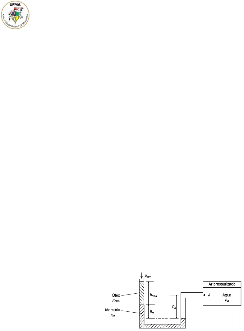 DETE0082 – Introdução aos Fenômenos de Transporte Capítulo 2 2ª Lista de exercícios para estudo Profa. Dra. Nahieh Toscano Miranda 1. Considere um tanque, com fundo horizontal, que contém água até a altura H, aberto para a atmosfera. a) Determine a pressão relativa no fundo do tanque; Resposta: 9810𝐻. b) Determine o peso da coluna de água que está sobre o fundo por unidade de área; Resposta: 9810𝑉 𝐴 . c) Compare os resultados dos itens (a) e (b), e interprete fisicamente. Resposta: Abrindo a resposta b: 9810𝑉 𝐴 = 9810𝐴𝐻 𝐴 = 9810𝐻. Ou seja: pressão manométrica (pressão relativa no fundo do tanque) é o peso do líquido em uma determinada área. 2. A Figura mostra um esquema de um manômetro de tubo em U, com um ramo aberto para a atmosfera, instalado em um tanque pressurizado que contém água. Determine a pressão relativa no ponto A. Resposta: 𝑝𝑟𝑒𝑙,𝐴 = 𝜌𝑚𝑔ℎ𝑚 + 𝜌ó𝑙𝑒𝑜𝑔ℎó𝑙𝑒𝑜 − 𝜌𝑎𝑔ℎ𝑎 3. Uma caixa d’água de 1,2 x 0,5 m e altura de 1 m pesa 540 kg. Calcule a pressão manométrica, que ela exerce sobre o solo: a) Vazia; Resposta: 8.829 N/m². b) Cheia. Resposta: 18.639 N/m². 4. Na figura, o manômetro de mercúrio indica uma leitura diferencial h = 12 cm quando a pressão no tubo B é de 500 mmHg. O tubo A contém água e o tubo B contém óleo (densidade relativa = 0,92). Se d = 6 cm e D = 20 cm, qual a pressão no tubo A? Resposta: 388 mmHg (51.729,1 Pa). 5. A caçamba ao lado está cheia de água. Calcule a força hidrostática sobre: a) O fundo da caçamba abcd; Resposta: 5,3x104 N. b) A parede direita bcfg; Resposta: 3,5x104 N. c) A parede inclinada adhe. Resposta: 4,1x104 N. 6. Um pino maciço de madeira (densidade = 680 kg/m³), de altura 6 cm, flutua sobre a água na posição vertical. Qual o comprimento do pino que fica submerso? Resposta: 4,1 cm. 7. Uma esfera oca de plástico de diâmetro externo 20 cm e espessura 1 cm flutua na água. 2/3 do seu volume fica submerso. a) Qual a densidade do plástico? Resposta: 2,5 g/cm³. b) Qual deveria ser a espessura dessa esfera para que metade de seu volume ficasse submerso? Resposta: 7,2 mm. 8. O que significa um fluido em movimento de corpo rígido? 9. O que o princípio de Pascal diz sobre pressão em um ponto? 10. Quais são as forças que atuam em um elemento de volume em repouso? 11. Qual é a diferença na avaliação da variação da pressão em um fluido incompressível e compressível? 12. Uma comporta plana, de espessura uniforme, suporta uma coluna de água conforme mostrado. Determine o peso mínimo da comporta necessário para mantê-la fechada. Dados: largura da comporta (w) = 2 m. Resposta: 68 kN. 13. A superfície inclinada mostrada, articulada ao longo de A, tem 5 m de largura. Determine: a) a força resultante, 𝐹𝑅, da água e do ar sobre a superfície inclinada; Resposta: 588 kN. b) momento de força em relação ao ponto A, exercido pela água sobre a comporta; Resposta: 1.308 kJ. c) a profundidade do ponto de aplicação da força resultante 𝐹𝑅. Resposta: 6,22 m. 14. Água escoa no interior dos tubos A e B. Óleo lubrificante está na parte superior do tubo em U invertido. Mercúrio está na parte inferior dos dois tubos em U. Determine a diferença de pressão, pA – pB, nas unidades kPa. Resposta: 25,33 kPa. 15. Um piloto de corridas de dragster coloca sua caneca de café sobre uma bandeja horizontal, enquanto ele acelera a 7 m/s². A caneca tem 10 cm de altura e 6 cm de diâmetro e contém café até uma altura de 7 cm quando em repouso. (a) Admitindo o café em aceleração de corpo rígido, determine se ele irá ou não transbordar da caneca. (b) Calcule a pressão manométrica na borda, ponto A, se a massa específica do café for 1.010 kg/m³. Resposta: (a) 2,14 cm (não derramará); (b) 906 Pa. 16. A comporta na Figura abaixo tem 1,5 m de largura, está articulada no ponto B e se apoia sobre uma parede lisa no ponto A. Calcule (a) a força na comporta decorrente da pressão da água do mar, (b) a força horizontal P exercida pela parede no ponto A e (c) as reações na articulação B. Resposta: (a) 162.875 N; (b) 124.418 N; (c) 130.300 N. 17. O manômetro B serve para medir a pressão no ponto A em um escoamento de água. Se a pressão em B for de 87 kPa, calcule a pressão em A em kPa. Considere que todos os fluidos estejam a 20 ºC. Dados: Resposta: 96,4 kPa. 18. A água a 10 °C é o fluido na tubulação da Figura abaixo, e o mercúrio é o fluido do manômetro. Se a deflexão Δh é 60 cm e ℓ é 180 cm, qual é a pressão manométrica no centro da tubulação? Dados: Água (10 °C): γ = 9.810 N/m³; Mercúrio: γ = 133.000 N/m³. Resposta: 62,1 kPa. 19. Qual é a pressão do ar no tanque se ℓ1 = 40 cm, ℓ2 = 100 cm, e ℓ3 = 80 cm? Dados: γágua = 9.810 N/m³; Mercúrio: γ = 133.000 N/m³. Resposta: 110 kPa. 20. O manômetro de tubo inclinado mostrado tem D = 96 mm e d = 8 mm. Determine o ângulo, θ, necessário para fornecer um aumento de 5:1 na deflexão do líquido, L, comparada com a deflexão total de um manômetro comum de tubo em U. Avalie a sensibilidade do manômetro de tubo inclinado. Resposta: 11,13º; s = 5/SG. 21. Um manômetro inclinado é utilizado para medir a diferença de pressão entre duas tubulações A e B, nas quais escoa água. A pressão no tubo A é de 0,8 psi (relativa) e a densidade do fluido manométrico é 2,6. Qual a pressão no tubo B? Dados: h1 = 76 mm, h3 = 76 mm, L = 203 mm, e θ = 30º. ρ1 = ρ3 = 1 g/cm³. Resposta: 1,18 psi. 22. Água flui para baixo ao longo de um tubo inclinado de 30° em relação à horizontal conforme mostrado. A diferença de pressão pA – pB é causada parcialmente pela gravidade e parcialmente pelo atrito. Deduza uma expressão algébrica para a diferença de pressão. Calcule a diferença de pressão se L = 1,5 m e h = 150 mm. Resposta: 11293,6 Pa (1,638 psi).