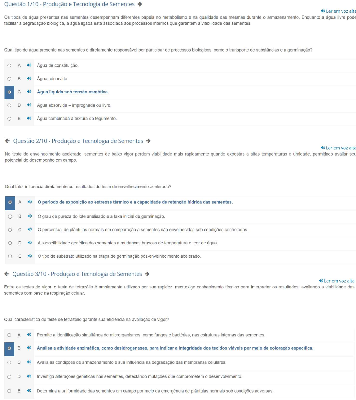 Questão 1/10 - Produção e Tecnologia de Sementes Ler em voz alta Os tipos de água presentes nas sementes desempenham diferentes papéis no metabolismo e na qualidade das mesmas durante armazenamento. Enquanto a água livre pode facilitar a degradação biológica, a água ligada está associada aos processos internos que garantem a viabilidade das sementes. Qual tipo de água presente nas sementes é diretamente responsável por participar de processos biológicos, como o transporte de substâncias e a germinação? A Água de constituição. Água adsorvida. Água líquida sob tensão osmótica. Água absorvida impregnada ou livre. Água combinada à textura do tegumento. Questão 2/10 Produção e Tecnologia de Sementes Ler em alta No teste de envelhecimento acelerado, sementes de baixo vigor perdem viabilidade mais rapidamente quando expostas a altas temperaturas e umidade, permitindo avaliar seu potencial de desempenho em campo. Qual fator influencia diretamente os resultados do teste de envelhecimento acelerado? O A período de exposição ao estresse térmico e a capacidade de retenção hídrica das sementes. B grau de pureza do lote analisado e a taxa inicial de germinação. percentual de plântulas normais em comparação a sementes não envelhecidas sob condições controladas. A suscetibilidade genética das sementes a mudanças bruscas de temperatura e teor de água. tipo de substrato utilizado na etapa de germinação pós-envelhecimento acelerado. Questão 3/10 - Produção e Tecnologia de Sementes Ler em alta Entre os testes de vigor, o teste de tetrazólio é amplamente utilizado por sua rapidez, mas exige conhecimento técnico para interpretar os resultados, avaliando a viabilidade das sementes com base na respiração Qual característica do teste de tetrazólio garante sua eficiência na avaliação de vigor? A Permite a identificação simultânea de microrganismos, como fungos e bactérias, nas estruturas internas das sementes. O B Analisa a atividade enzimática, como desidrogenases, para indicar a integridade dos tecidos viáveis por meio de coloração específica. Avalia as condições de armazenamento e sua influência na degradação das membranas celulares. Investiga alterações genéticas nas sementes, detectando mutações que comprometem o Determina a uniformidade das sementes em campo por meio da emergência de plântulas normais sob condições adversas.Questão 4/10 Produção e Tecnologia de Sementes Ler em voz alta Danos às sementes durante o beneficiamento e a secagem podem comprometer sua qualidade fisiológica e sanitária, afetando diretamente a viabilidade e o vigor das sementes. Alterações físicas, como fissuras e trincas, são agravadas por falhas no controle de temperatura, tempo de exposição e métodos inadequados. Qual é o principal fator que intensifica o risco de danos térmicos às sementes durante o processo de secagem artificial? A A presença de alto teor de água nas sementes no início do processo. uso de métodos de secagem natural em locais com alta umidade relativa. A alternância entre temperaturas crescentes e decrescentes no início da secagem. A utilização de sistemas de fluxo cruzado que aumentam o contato emprego de ventiladores sem controle de velocidade no fluxo de ar. Questão 5/10 Produção e Tecnologia de Sementes Ler em alta A legislação brasileira estipula que a rastreabilidade de sementes é garantida por meio do Renasem, assegurando a conformidade de seus processos produtivos. Qual é o papel do Renasem no Sistema Nacional de Sementes e Mudas (SNSM)? A Emitir certificados de origem para sementes exportadas. B Garantir a rastreabilidade e a conformidade das sementes produzidas ou Analisar o impacto ambiental das sementes em regiões específicas. Registrar exclusivamente sementes geneticamente modificadas. E Fiscalizar diretamente as sementes em todas as etapas de comercialização. Questão 6/10 Produção e Tecnologia de Sementes Ler em voz alta o controle dos fluxos de an e sementes nos sistemas de secagem é um elemento determinante para garantir a eficiência e uniformidade do processo, preservando a qualidade das sementes. Métodos como fluxos cruzados, concorrentes, contracorrentes e mistos apresentam vantagens e desvantagens que precisam ser avaliadas de acordo com a demanda e tipo de semente. Qual característica específica do sistema de fluxo contracorrente torna uma escolha eficaz para a secagem de sementes com maior teor de umidade inicial? A A redução no consumo de energia, pois o quente e as sementes se movem na mesma direção. B encontro entre an mais quente e as sementes já secas, evitando superaquecimento. contato das sementes mais úmidas com o an mais quente, maximizando a eficiência térmica. A movimentação perpendicular do ar, que aumenta a transferência de calor nas camadas externas. A combinação de fluxos cruzados e concorrentes, garantindo flexibilidade no controleQuestão 7/10 - Produção e Tecnologia de Sementes Ler em alt Os sistemas de secagem artificial requerem cuidados específicos para evitar danos térmicos e preservar a qualidade das sementes. A eficiência do processo depende de fatore como temperatura e fluxo de ar, além da escolha do sistema de secagem mais adequado ao volume e à sensibilidade das sementes. Qual é uma característica do método de secagem que o torna mais a danos térmicos nas sementes? O A A aplicação constante de calor em um único ponto, sem resfriamento intermediário. A exposição prolongada ao calor devido à movimentação das sementes em camadas espessas. A ausência de controle do fluxo de an nos canais de passagem, que aumenta a compactação das sementes. A necessidade de pré-limpeza para garantir que as sementes permaneçam estáticas durante a secagem. uso de altas temperaturas combinadas com pausas longas, causando choques térmicos. Questão 8/10 Produção e Tecnologia de Sementes Ler em alta A secagem de semente