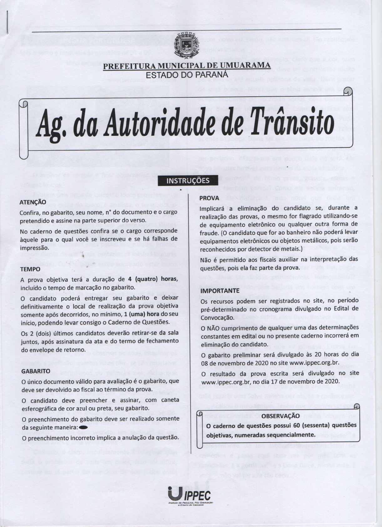 PREFEITURA MUNICIPAL DE UMUARAMA ESTADO DO PARANÁ Ag. da Autoridade de Trânsito INSTRUÇÕES PROVA ATENÇÃO Implicará a eliminação do candidato se, durante a Confira, no gabarito, seu nome, n° do documento e o cargo realização das provas, o mesmo for flagrado utilizando-se pretendido e assine na parte superior do verso. de equipamento eletrônico ou qualquer outra forma de No caderno de questões confira se o cargo corresponde fraude. (O candidato que for ao banheiro não poderá levar para o qual você se inscreveu e se há falhas de equipamentos eletrônicos ou objetos metálicos, pois serão impressão. reconhecidos por detector de metais.) Não é permitido aos fiscais auxiliar na interpretação das TEMPO questões, pois ela faz parte da prova. A prova objetiva terá a duração de 4 (quatro) horas, incluído o tempo de marcação no gabarito. IMPORTANTE o candidato poderá entregar seu gabarito e deixar Os recursos podem ser registrados no site, no período definitivamente o local de realização da prova objetiva pré-determinado no cronograma divulgado no Edital de somente após decorridos, no mínimo, 1 (uma) hora do seu Convocação. início, podendo levar consigo o Caderno de Questões. o NÃO cumprimento de qualquer uma das determinações Os 2 (dois) últimos candidatos deverão retirar-se da sala constantes em edital ou no presente caderno incorrerá em juntos, após assinatura da ata e do termo de fechamento eliminação do candidato. do envelope de retorno. o gabarito preliminar será divulgado às 20 horas do dia 08 de novembro de 2020 no site www.ippec.org.br. GABARITO o resultado da prova escrita será divulgado no site o único documento válido para avaliação é o gabarito, que www.ippec.org.br, no dia 17 de novembro de 2020. deve ser devolvido ao fiscal ao término da prova. o candidato deve preencher e assinar, com caneta esferográfica de azul ou preta, seu gabarito. o preenchimento do gabarito deve ser realizado somente OBSERVAÇÃO da seguinte maneira: o preenchimento incorreto implica a anulação da o caderno de questões possui 60 (sessenta) questões objetivas, numeradas sequencialmente. IPPEC de Pós Graduação Ensino deLÍNGUA PORTUGUESA loucos, como Senão, não estariam ali, tão cabisbaixos Leia o texto e responda às questões de 01 a 06. e Uma terapia incomum o por exemplo. Claro que a cor, num Mário Prata país racista como o nosso, deve ter contribuído muito www.uol.com.br, 13/05/2018 para levá-lo até aquela poltrona de vime. Deve gostar de uma branca. Notei que o tênis estava um pouco velho. Problema de ascensão social, com certeza. o olhar dele era triste, cansado. Comecei a ficar com pena dele. Depois notei que ele trazia uma mala. Podia ser o corpo da namorada esquartejada lá dentro. Talvez apenas a cabeça. Devia ser um assassino, ou suicida, no mínimo. Podia ter também uma arma lá dentro. Podia ser perigoso. Afastei-me um pouco dele no sofá. Ele dava olhadas furtivas para dentro da mala assassina. o melhor da terapia é ficar observando os meus E o de terno preto, gravata, meias e colegas loucos. sapatos também pretos? Como ele estava sofrendo, Existem dois tipos de loucos: o louco propriamente coitado. Ele disfarçava, mas notei que tinha um dito e o que cuida do louco: o analista, o terapeuta, o pequeno tique no olho esquerdo. Observo as mãos. psicólogo e o psiquiatra. Sim, somente um louco pode Roía as unhas. Insegurança total, medo de viver. Filho se dispor a ouvir a loucura de seis ou sete outros loucos drogado? Bem provável. Como era infeliz esse meu todos os dias, meses, anos. Se não era louco, ficou. personagem. Uma hora tirou o lenço e eu já estava Durante quarenta anos passei longe deles. Pronto, esperando as lágrimas quando ele assoou o nariz acabei diante de um louco, contando as minhas loucuras violentamente. Faltava um botão na camisa. Claro, acumuladas. Confesso que estou adorando estar louco abandonado pela esposa. Devia morar num flat, pagar semanal. caro, devia ter dívidas astronômicas. Homossexual? o melhor da terapia é chegar antes, alguns minutos Acho que Ninguém beijaria um homem com um e ficar observando os meus colegas loucos na sala de bigode daqueles. Tingido. espera. Onde faço a minha terapia é uma casa grande Mas a mais doida era a louca e baixinha. Que com oito loucos analistas. Portanto, a sala de espera bunda imensa. Como sofria, meu Deus. Bastava olhar no sempre tem três ou quatro ali, ansiosos, pensando na rosto dela. Não devia fazer amor há mais de trinta anos. loucura que vão dizer dali a pouco. Ninguém olha para Tirou um terço da bolsa e começou a rezar. Meu Deus, ninguém. o silêncio é uma loucura. o caso é mais grave do que eu pensava. Estava no E eu, escritor, adoro observar pessoas, imaginar os quinto cigarro em dez minutos. Tensa. Coitada. o que nomes, a profissão, quantos filhos têm, se são rotarianos deve ser dos filhos dela? Acho que os filhos não comem ou leoninos, corintianos ou palmeirenses. Acho que a macarronada dela há dezenas de domingos. Tinha todo escritor gosta desse brinquedo, no mínimo, cara também de quem mentia para o analista. Minha criativo. E a sala de espera de um "consultório médico", mãe rezaria uma Salve-Rainha por ela, se a conhecesse. como diz a atendente absolutamente normal, é um Acabou o meu tempo. Tenho que conversar com prato cheio para um louco escritor, como eu. Senão, o meu psicanalista. Conto para ele a minha 'viagem' na vejamos: Na última quarta-feira, estávamos: um muito vestido, um de uns sala de espera. Ele ri, ri muito o meu psicanalista e diz: "O é o nosso office-boy. o de terno é cinquenta anos e uma velha representante de um laboratório multinacional de Comecei, é claro, imediatamente a imaginar qual remédios e passa aqui uma vez por mês com as seria o problema de cada um deles. Não foi difícil, novidades. E a é a Dona Dirce, minha mãe. E porque eu já partia do princípio de que todos er