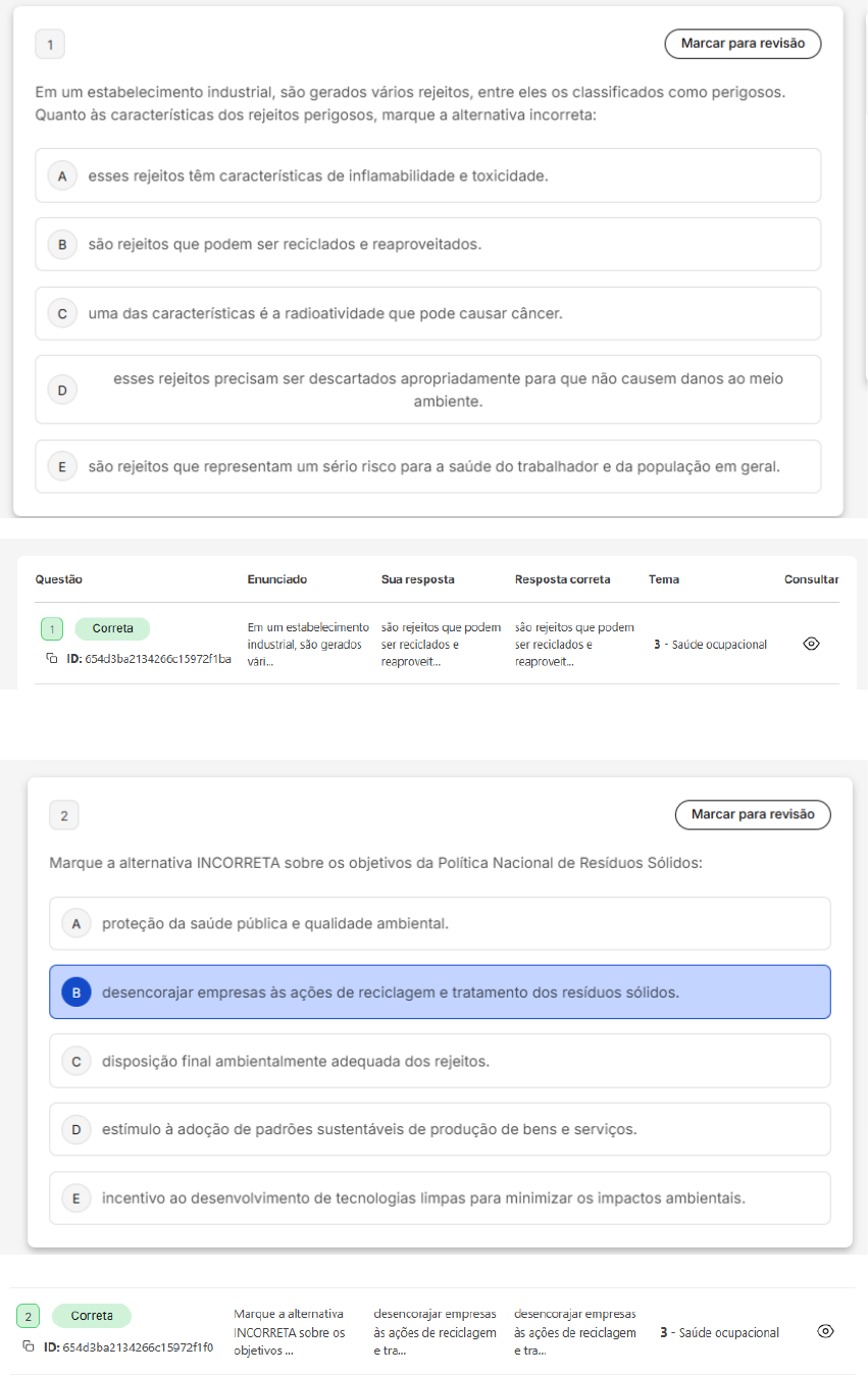 1 Marcar para revisão Em um estabelecimento industrial, são gerados vários rejeitos, entre eles os classificados como perigosos. Quanto às características dos rejeitos perigosos, marque a alternativa incorreta: A esses rejeitos têm características de inflamabilidade e B são rejeitos que podem ser reciclados e reaproveitados. C uma das características é a radioatividade que pode causar câncer. esses rejeitos precisam ser descartados apropriadamente para que não causem danos ao meio D ambiente. E são rejeitos que representam um sério risco para a saúde do trabalhador e da população em geral. Questão Enunciado Sua resposta Resposta correta Tema Consultar 1 Correta Em um estabelecimento são rejeitos que podem são rejeitos que podem industrial, são gerados ser reciclados e ser reciclados e 3 Saúde ocupacional ID: 654d3ba2134266c15972f1ba vári... 2 Marcar para revisão Marque a alternativa INCORRETA sobre os objetivos da Política Nacional de Resíduos Sólidos: A proteção da saúde pública e qualidade ambiental. B desencorajar empresas às ações de reciclagem e tratamento dos resíduos sólidos. C disposição final ambientalmente adequada dos rejeitos. D estímulo à adoção de padrões sustentáveis de produção de bens e serviços. E incentivo ao desenvolvimento de tecnologias limpas para minimizar os impactos ambientais. 2 Correta Marque a alternativa desencorajar empresas desencorajar empresas INCORRETA sobre os às ações de reciclagem às ações de reciclagem 3 Saúde ocupacional ID: 654d3ba2134266c15972f1f0 objetivos e tra... e tra...3 Marcar para revisão No ambiente de trabalho, todos são responsáveis pela saúde e segurança dos funcionários. empregador tem responsabilidades, assim como o empregado. Entre as responsabilidades do empregado no que diz respeito à sua segurança, marque a alternativa incorreta: A Submeter-se aos exames médicos oferecidos pela empresa. B Utilizar os equipamentos de proteção com a finalidade a que se destinam. C Cumprir as normas de segurança previstas pela empresa. D Utilizar os equipamentos de segurança somente quando sentir vontade. E Responsabilizar-se pela guarda e conservação de equipamentos de proteção individual. Utilizar os Utilizar os 3 Correta No ambiente de equipamentos de equipamentos de trabalho, todos são 3 Saúde ocupacional ID: 65b10bbeeccdbbbddeaa3b79 segurança somente segurança somente responsáveis pe... quan... quan... 4 Marcar para revisão Entre os exames médicos previstos no Programa de Controle Médico de Saúde Ocupacional (PCMSO), estão: A admissional e periódico. B audiometria e densitometria. C demissional e teste ergométrico. D raios-x e periódico. E de retorno ao trabalho e exame de urina. 4 Correta Entre os exames admissional e admissional e médicos previstos no 3 Saúde ocupacional ID: 654d3ba2134266c15972f1de periódico. Programa de C...5 Marcar para revisão (CESPE / CEBRASPE/2010 adaptada) A Organização Internacional do Trabalho (OIT) formulou a Recomendação n° 155 que trata da saúde e segurança dos trabalhadores. Sobre esta recomendação, marque a alternativa correta. A implementação de diretrizes internacionais pelos governos locais é Assim, as medidas de A segurança e higiene do trabalho poderão implicar carga financeira para os trabalhadores. Não há qualquer obrigatoriedade de proteger-se de consequências injustificadas o trabalhador que B julgar necessário interromper uma situação de trabalho por acreditar, por motivos razoáveis, que esta envolve perigo iminente e grave para sua vida ou sua saúde. Quando duas ou mais empresas desenvolverem simultaneamente atividades em um mesmo lugar de C trabalho deverão manter independentes as suas identidades jurídicas de responsabilidades, sem implicação de colaboração técnica Aos empregadores, não cabe prever as medidas para fazer frente a situações de urgência e a D acidentes, incluídos meios adequados para a administração de primeiros socorros. Os países membros, tais como o Brasil, foram responsáveis pela elaboração de uma política nacional E coerente em matéria de segurança e saúde dos trabalhadores e ambiente de trabalho. 5 Correta (CESPE / Os países membros, Os países membros, CEBRASPE/2010 tais como Brasil, tais como Brasil, 3 Saúde ocupacional ID: 654d3ba2134266c15972f208 adaptada) A Or... fora.. 6 Marcar para revisão ano de 1943 foi uma data muito importante para os trabalhadores. Sobre essa data, marque a alternativa correta: A Foi aprovada a Lei Eloy B Foi aprovada a Consolidação das Leis do Trabalho. C Foi aprovada a primeira Lei de Acidentes de Trabalho. D Foi aprovado a criação do Ministério da Economia. E Foi aprovado a criação do Plano Nacional para Erradicação do Trabalho Escravo.Correta ano de 1943 foi uma Foi aprovada a Foi aprovada a 2 Evolução histórica da data muito importante Consolidação das Leis Consolidação das Leis ID: 654d3bcd134266c15973172e saúde ocupacional para O... do Trabalho. do Trabalho. 7 Marcar para revisão Sobre a inserção do Brasil no processo de globalização na década de 1980, marque a alternativa correta: Brasil adotou, no contexto do Programa Nacional de Qualidade e Produtividade, as normas ISO série A 19000. Brasil adotou, no contexto do Programa Nacional de Qualidade e Produtividade, as normas ISI série B 90000. Brasil adotou, no contexto do Programa Nacional de Qualidade e Produtividade, as normas ISA série C 9500. Brasil adotou, no contexto do Programa Nacional de Qualidade e Produtividade, as normas ISO série D 9200. Brasil adotou, no contexto do Programa Nacional de Qualidade e Produtividade, as normas ISO série E 9000. 7 Incorreta Sobre inserção do Brasil adotou, no Brasil adotou, no 2 Evolução histórica da Brasil no processo de contexto do Programa contexto do Programa ID: 654d3bcd134266c15973173a saúde ocupacional Nacional Nacional 8 Marcar para revisão Segundo a classificação proposta por