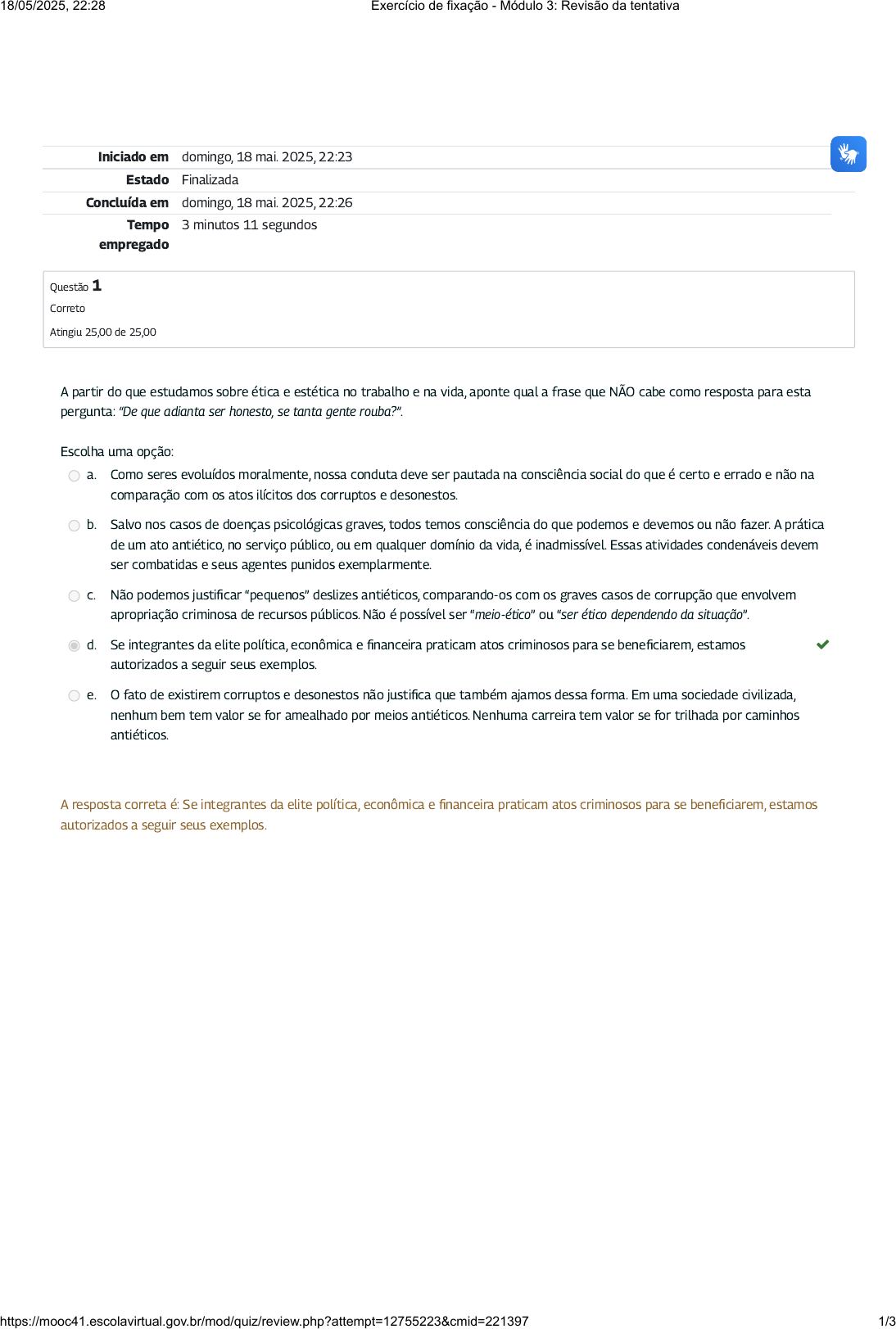 Iniciado em domingo, 18 mai. 2025, 22:23 Estado Finalizada Concluída em domingo, 18 mai. 2025, 22:26 Tempo empregado 3 minutos 11 segundos Questão 1 Correto Atingiu 25,00 de 25,00 A partir do que estudamos sobre ética e estética no trabalho e na vida, aponte qual a frase que NÃO cabe como resposta para esta pergunta: “De que adianta ser honesto, se tanta gente rouba?”. Escolha uma opção: a. Como seres evoluídos moralmente, nossa conduta deve ser pautada na consciência social do que é certo e errado e não na comparação com os atos ilícitos dos corruptos e desonestos. b. Salvo nos casos de doenças psicológicas graves, todos temos consciência do que podemos e devemos ou não fazer. A prática de um ato antiético, no serviço público, ou em qualquer domínio da vida, é inadmissível. Essas atividades condenáveis devem ser combatidas e seus agentes punidos exemplarmente. c. Não podemos justificar “pequenos” deslizes antiéticos, comparando-os com os graves casos de corrupção que envolvem apropriação criminosa de recursos públicos. Não é possível ser “meio-ético” ou “ser ético dependendo da situação”. d. Se integrantes da elite política, econômica e financeira praticam atos criminosos para se beneficiarem, estamos autorizados a seguir seus exemplos. e. O fato de existirem corruptos e desonestos não justifica que também ajamos dessa forma. Em uma sociedade civilizada, nenhum bem tem valor se for amealhado por meios antiéticos. Nenhuma carreira tem valor se for trilhada por caminhos antiéticos. A resposta correta é: Se integrantes da elite política, econômica e financeira praticam atos criminosos para se beneficiarem, estamos autorizados a seguir seus exemplos. 18/05/2025, 22:28 Exercício de fixação - Módulo 3: Revisão da tentativa https://mooc41.escolavirtual.gov.br/mod/quiz/review.php?attempt=12755223&cmid=221397 1/3 Questão 2 Correto Atingiu 25,00 de 25,00 Questão 3 Correto Atingiu 25,00 de 25,00 Assinale a afirmação que NÃO está de acordo com o que estudamos sobre ética e estética na vida e no trabalho: Escolha uma opção: a. A dimensão estética das atividades do servidor público diz respeito à conformidade (compliance) das ações do servidor em relação ao que está estabelecido socialmente, e definido formalmente na instituição em que trabalha, como correto, certo, adequado e pertinente. b. Um comportamento bonito, adequado, legal, honesto, afetuoso, bacana, correto, pertinente, probo, acolhedor, digno, conforme, justo, envolvente é ético e estético. c. Nenhum bem tem valor se for amealhado por meios antiéticos. Nenhuma carreira tem valor se for trilhada por caminhos antiéticos. Isso vale para todas as pessoas, mas o servidor público tem responsabilidade especial no zelo pela ética. Como representante do Estado, você, servidor, é olhado como modelo estético pela comunidade. d. A dimensão estética das atividades do servidor público estará atendida se esse servidor tiver uma apresentação pessoal cuidada e elegante, além de receber o cidadão em um ambiente de atendimento de bom gosto e confortável. e. Todo desvio ético tem comprometimento estético, pois fazer coisas erradas, ter procedimento reprovável ou conduta inadequada “é feio”, “pega mal”, “não é legal”, “é horrível”. Nossas ações devem “ornar”, devem estar afinadas e em harmonia com o que está estabelecido socialmente como ético. A resposta correta é: A dimensão estética das atividades do servidor público estará atendida se esse servidor tiver uma apresentação pessoal cuidada e elegante, além de receber o cidadão em um ambiente de atendimento de bom gosto e confortável. Sobre a responsabilidade do servidor em relação à imagem do serviço público, assinale a afirmativa INCORRETA: Escolha uma opção: a. Quando nos referimos à imagem do serviço público, estamos nos referindo a um conjunto de impressões formadas na consciência das pessoas a partir dos diversos relacionamentos estabelecidos historicamente entre essas pessoas e o serviço público. b. A imagem de uma instituição pode ficar comprometida por conta de um funcionário relapso e grosseiro, pois as pessoas avaliam a qualidade da prestação de um serviço pela experiência que tiveram com as pessoas que lhes prestaram o serviço. c. Um cidadão que tem uma experiência de mau atendimento no serviço público irá com essa expectativa toda vez que se dirigir a um órgão público. Não adianta o atendente lhe oferecer um bom atendimento, pois a opinião desse cidadão sobre o serviço público já está formada e não mudará. d. O servidor deve ter consciência da repercussão do bom atendimento oferecido ao cidadão na formação de uma boa imagem não só do órgão onde trabalha, mas do próprio serviço público. e. O cidadão que busca atendimento, independentemente de raça, credo, gênero ou classe social, é portador de direitos fundamentais que justificam a própria existência do Estado e do serviço público. Ao oferecer um bom atendimento, o servidor está cumprindo seu dever e contribuindo para o fortalecimento de uma boa imagem do serviço público. A resposta correta é: Um cidadão que tem uma experiência de mau atendimento no serviço público irá com essa expectativa toda vez que se dirigir a um órgão público. Não adianta o atendente lhe oferecer um bom atendimento, pois a opinião desse cidadão sobre o serviço público já está formada e não mudará. 18/05/2025, 22:28 Exercício de fixação - Módulo 3: Revisão da tentativa https://mooc41.escolavirtual.gov.br/mod/quiz/review.php?attempt=12755223&cmid=221397 2/3 Questão 4 Correto Atingiu 25,00 de 25,00 Assinale a afirmativa incorreta, com relação ao conceito de “evidências de serviço”: Escolha uma opção: a. Avaliamos a qualidade de um serviço pelas evidências físicas do ambiente ou das pessoas que prestam o atendimento. Sujeira ou falta