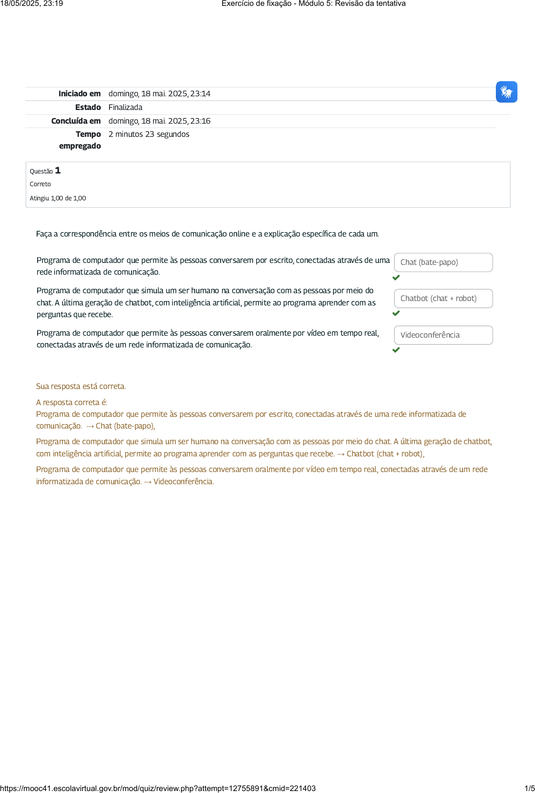 Iniciado em domingo, 18 mai. 2025, 23:14 Estado Finalizada Concluída em domingo, 18 mai. 2025, 23:16 Tempo empregado 2 minutos 23 segundos Questão 1 Correto Atingiu 1,00 de 1,00 Faça a correspondência entre os meios de comunicação online e a explicação específica de cada um. Programa de computador que permite às pessoas conversarem por escrito, conectadas através de uma rede informatizada de comunicação. Programa de computador que simula um ser humano na conversação com as pessoas por meio do chat. A última geração de chatbot, com inteligência artificial, permite ao programa aprender com as perguntas que recebe. Programa de computador que permite às pessoas conversarem oralmente por vídeo em tempo real, conectadas através de um rede informatizada de comunicação. Chat (bate-papo) Chatbot (chat + robot) Videoconferência Sua resposta está correta. A resposta correta é: Programa de computador que permite às pessoas conversarem por escrito, conectadas através de uma rede informatizada de comunicação. → Chat (bate-papo), Programa de computador que simula um ser humano na conversação com as pessoas por meio do chat. A última geração de chatbot, com inteligência artificial, permite ao programa aprender com as perguntas que recebe. → Chatbot (chat + robot), Programa de computador que permite às pessoas conversarem oralmente por vídeo em tempo real, conectadas através de um rede informatizada de comunicação. → Videoconferência. 18/05/2025, 23:19 Exercício de fixação - Módulo 5: Revisão da tentativa https://mooc41.escolavirtual.gov.br/mod/quiz/review.php?attempt=12755891&cmid=221403 1/5 Questão 2 Correto Atingiu 1,00 de 1,00 Assinale a alternativa incorreta em relação ao que estudamos sobre o atendimento por videoconferência. a. Com o vídeo, podemos acompanhar a linguagem não verbal de nosso interlocutor, como trejeitos de impaciência, gestos de concordância, semblante de dúvida, expressões corporais que contribuem para a interação. b. No atendimento online, o corpo concreto perde o seu status na interação, reduzido a uma imagem que mostra um rosto ou meio corpo no máximo. Esse fragmento que aparece na tela se torna relevante, pois é onde os olhos do interlocutor ficarão fixados durante o tempo do atendimento. c. Na videoconferência, temos que cuidar do recorte de imagem que está na tela, pois a parte visível ganha relevância estética, como a blusa, camisa, cabelo, barba, bigode, maquiagem, adereços, etc. d. No atendimento remoto, devemos evitar a utilização do vídeo, dando preferência à fotografia no aplicativo, pois assim não precisaremos nos preocupar com nossa apresentação e postura, além de ficarmos livres para acessar as redes sociais durante o atendimento, sem demonstrar descaso com o assunto e com o interlocutor. e. No atendimento online, a mudança de local de interação do atendente com o cidadão traz reflexos nas condições em que se dá essa interação. Em home office, o servidor não tem mais uma estrutura simbólica representada pelo prédio e instalações do TRT, que reforça sua autoridade institucional. No atendimento online, os interlocutores se nivelam nas telas dos dispositivos eletrônicos utilizados. Sua resposta está correta. A resposta correta é: No atendimento remoto, devemos evitar a utilização do vídeo, dando preferência à fotografia no aplicativo, pois assim não precisaremos nos preocupar com nossa apresentação e postura, além de ficarmos livres para acessar as redes sociais durante o atendimento, sem demonstrar descaso com o assunto e com o interlocutor. 18/05/2025, 23:19 Exercício de fixação - Módulo 5: Revisão da tentativa https://mooc41.escolavirtual.gov.br/mod/quiz/review.php?attempt=12755891&cmid=221403 2/5 Questão 3 Correto Atingiu 1,00 de 1,00 Faça a correspondência entre a primeira e a segunda coluna da tabela abaixo, sobre os cuidados para o bom atendimento em home office por videoconferência. Há intervenientes no processo de comunicação com o cidadão que não estão sob controle imediato do servidor que faz o atendimento. É importante uma boa interação com o pessoal do suporte técnico e com os responsáveis pelo conteúdo do site do TRT. O deslocamento para casa das atividades do trabalho trouxe novos desafios. Um incidente doméstico só iria preocupar o servidor quando chegasse em casa no final do dia. Em home office, é difícil não se contaminar com os eventos que estão ocorrendo no cômodo ao lado. A forma de se apresentar, de se comportar e a postura diante de câmera são importantes para um bom atendimento. Muitas vezes não nos damos conta de que as pessoas com quem estamos interagindo não veem somente nossa imagem na tela, mas também o que está acontecendo a nossa volta captado pelo vídeo. Mesmo que você, circunstancialmente, durante o atendimento, seja acometido de devaneios, procure não demonstrar desatenção ou desinteresse e descaso com o assunto e com o interlocutor. Visão sistêmica do atendimento. Acordos domésticos. Elegância singela e discreta. Cuidado com as pessoas que circulam no ambiente de home office. Atenção e olhar dirigidos ao cidadão que você está atendendo. Sua resposta está correta. A resposta correta é: Há intervenientes no processo de comunicação com o cidadão que não estão sob controle imediato do servidor que faz o atendimento. É importante uma boa interação com o pessoal do suporte técnico e com os responsáveis pelo conteúdo do site do TRT. → Visão sistêmica do atendimento., O deslocamento para casa das atividades do trabalho trouxe novos desafios. Um incidente doméstico só iria preocupar o servidor quando chegasse em casa no final do dia. Em home office, é difícil não se contaminar com os eventos que estão ocorrendo no cômodo ao lado. → Acordos domésticos., A forma de se apresentar, de se comportar e a postura diante de câmera são importantes para um bom atendi