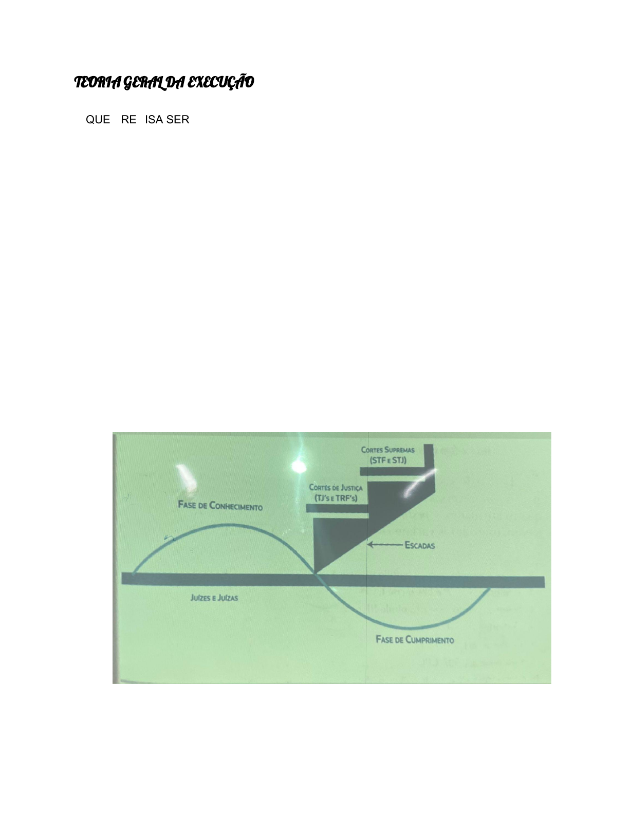 TEORIA GERAL DA EXECUÇÃO O QUE PRECISA SER PARA HAVER EXECUÇÃO? ➔ TÍTULO EXECUTIVO - DOCUMENTO PARTICULAR ASSINADO PELO DEVEDOR E PELAS TESTEMUNHAS (CPC) JURISDIÇÃO - RESPONSABILIDADE DO ESTADO DE SOLUCIONAR OS CONFLITOS ➔ IDENTIFICA E IMPÕE O DIREITO QUE VAI SE APLICAR NO CASO CONCRETO ➔ PRECISO MAIS DO QUE A IDENTIFICAÇÃO DO DIREITO, MAS DA EFETIVIDADE DA OBRIGAÇÃO. ➔ VÊ-SE A NECESSIDADE DE PROTEÇÃO, QUE É CONQUISTADA COM A REALIZAÇÃO MATERIAL DAQUELE DIREITO (EFETIVIDADE) - É CONQUISTADA, POR SUA VEZ, POR MEIO DE ATOS EXECUTIVOS DO JUÍZ CONCEITO ➔ ATIVIDADE COGNITIVA - FASE DO PROCESSO EM QUE SE REVELA A NORMA JURÍDICA ➔ ATIVIDADE EXECUTIVA - FASE DO PROCESSO EM QUE SE SATISFAZ UMA PRESTAÇÃO DEVIDA POR MEIO DE ATOS MATERIAIS/ EXECUTIVOS, OU SEJA, PARTE-SE DE UM PRESSUPOSTO, QUAL SEJA, EXISTÊNCIA DE UM DIREITO ➔ ORGANOGRAMA DO PROCESSO E EXECUÇÃO ➔ O PROCESSO INICIA NO JUÍZO DE BASE, TEM A CHANCE DE RECORRER E VOLTA PARA O JUÍZO DE BASE PARA O CUMPRIMENTO DE SENTENÇA/ EXECUÇÃO ◆ PODE INICIAR DOS JUÍZOS SUPERIORES/ TJ E TRF - EX: MANDADO DE SEGURANÇA - NESSES CASOS, A EXECUÇÃO VAI INICIAR EM 2° GRAU DIVISÃO ESTRUTURAL DO CPC ➔ LIVRO I - DO PROCESSO DE CONHECIMENTO E CUMPRIMENTO DE SENTENCA (TRATA DE EXECUÇÃO DE TÍTULOS JUDICIAIS) ➔ LIVRO II - DO PROCESSO DE EXECUÇÃO (TRATA DA EXECUÇÃO DE TÍTULOS EXTRAJUDICIAIS) - NESTE É VISTO OS MEIOS DE EXECUÇÃO, COMO PENHORA, ANTICRESE, PRISÃO ◆ ESTE LIVRO DIALOGA E COMPLEMENTA O LIVRO UM, DE FORMA QUE É FEITA UMA PONTE PELO ART. 513 - O CUMPRIMENTO DA SENTENÇA SERÁ FEITO SEGUNDO AS REGRAS DESTE TÍTULO, OBSERVANDO-SE, NO QUE COUBER E CONFORME A NATUREZA DA OBRIGAÇÃO, O DISPOSTO NO LIVRO II DA PARTE ESPECIAL DESTE CÓDIGO. ◆ A CONEXÃO DO LIVRO II PARA UM I TEM TAMBÉM EXISTE, CRIANDO UM CICLO, POR MEIO DO ART. 771 - ESTE LIVRO REGULA O PROCEDIMENTO DA EXECUÇÃO FUNDADA EM TÍTULO EXTRAJUDICIAL, E SUAS DISPOSIÇÕES APLICAM-SE, TAMBÉM, NO QUE COUBER, AOS PROCEDIMENTOS ESPECIAIS DE EXECUÇÃO, AOS ATOS EXECUTIVOS REALIZADOS NO PROCEDIMENTO DE CUMPRIMENTO DE SENTENÇA, BEM COMO AOS EFEITOS DE ATOS OU FATOS PROCESSUAIS A QUE A LEI ATRIBUIR FORÇA EXECUTIVA. ➔ LIVRO III - DOS PROCESSOS NO TRIBUNAL E DOS MEIOS DE IMPUGNAÇÃO DAS DECISÕES JUDICIAIS ➔ EM REGRA, TEM-SE DUAS FASES NA EXECUÇÃO JUDICIAL - CONHECIMENTO E EXECUÇÃO HIPÓTESES EM QUE HÁ MEDIDAS EXECUTIVAS ANTES DA FASE DA EXECUÇÃO ➔ TUTELA PROVISÓRIA (ART. 297) LEGISLADOR DIVIDIU O CUMPRIMENTO DE SENTENÇA EM 6 PROCEDIMENTOS ➔ PAGAMENTO DE QUANTIA FUNDADA EM TÍTULO EXECUTIVO PROVISÓRIO - TÍTULO EXECUTIVO PROVISÓRIO É ADVINDO TUTELA PROVISÓRIA E RECURSO SEM EFEITO SUSPENSIVO (OCORRE EM CASOS DE VERBA PARA ALIMENTAÇÃO) ◆ TÍTULO EXECUTIVO PROVISÓRIO = SEM TRÂNSITO EM JULGADO ◆ RISCO DA EXECUÇÃO PROVISÓRIA - DEVER DE RESSARCIR, CASO A DECISÃO SEJA REVERTIDA ➔ PAGAMENTO DE QUANTIA FUNDADA EM TÍTULO EXECUTIVO DEFINITIVO (ART. 523) = ADVINDO COM TRÂNSITO EM JULGADO ◆ NA EXECUÇÃO DEFINITIVA A REVERSÃO SÓ OCORRE COM AÇÃO RESCISÓRIA ➔ PAGAMENTO DE OBRIGAÇÃO DE ALIMENTOS (ESPECIAL) - PAGAMENTO DE QUANTIA ESPECÍFICA, POIS ENVOLVE A SOBREVIVÊNCIA DA PARTE (ART. 528) ➔ PAGAMENTO DE QUANTIA CONTRA A FAZENDA PÚBLICA (ART. 534 E 535) ◆ SE RECEBE POR RPV OU PRECATÓRIO DE ACORDO COM O TETO ESTABELECIDO PELA CONSTITUIÇÃO E LEI AUTONOMIA DO PROCESSO EXECUTÓRIO ➔ TÍTULOS EXECUTIVOS EXTRAJUDICIAIS - AQUI SE INICIARÁ UM PROCESSO AUTÔNOMO SOMENTE PARA A EXECUÇÃO ➔ TÍTULOS EXECUTIVOS JUDICIAIS - AQUI SE INICIA APENAS UMA NOVA FASE (P/ EXECUÇÃO) EM UM ÚNICO PROCESSO, PARA O CUMPRIMENTO DE SENTENÇA ◆ EXCEÇÕES - ART. 515, INCISOS VI, VII, VIII E IX: ● SENTENÇA PENAL CONDENATÓRIA (VI) ● POR MEIO DE SENTENÇA ARBITRAL (VII) - O RESSARCIMENTO DOS VALORES REALIZADOS POR JUÍZO SERÁ FEITO EM VIA DE JUÍZO CÍVEL, MESMO A FORMAÇÃO DO TÍTULO TER SIDO FORA DO JUÍZO CÍVEL ● SENTENÇA ESTRANGEIRA HOMOLOGADA PELO STJ (VIII) ● DECISÃO INTERLOCUTÓRIA ESTRANGEIRA APÓS A CONCESSÃO DO EXEQUTUR À CARTA ROGATÓRIA PELO STJ (IX) ● NO CASO DESSAS EXCEÇÕES O DEVEDOR SERÁ CITADO E NÃO INTIMADO, CONFORME OCORRE NA FASE DE EXECUÇÃO (§ 1º) PRINCÍPIOS DA EXECUÇÃO ➔ DA INÉRCIA DA JURISDIÇÃO - AFIRMA A NECESSIDADE DE PROVOCAÇÃO INICIAL PARA SE INICIE A EXECUÇÃO ◆ PROCESSO AUTÔNOMO - SEMPRE HAVERÁ PROVOCAÇÃO DA PARTE PARA EXECUÇÃO (PETIÇÃO INICIAL) ◆ CUMPRIMENTO DE SENTENÇA (FASE) ● NAS OBRIGAÇÕES DE FAZER OU NÃO FAZER = A EXECUÇÃO PODE SE INICIAR COM REQUERIMENTO DAS PARTE OU OFÍCIO DO JUIZ (536) ● NAS OBRIGAÇÕES DE PAGAMENTO = A EXECUÇÃO SÓ SE INICIA COM REQUERIMENTO DAS PARTES (ART. 513, § 1º) ◆ TEM PRESCRIÇÃO (PRAZO) PARA A PROVOCAÇÃO/ REQUERIMENTO? SIM, CONFORME AS REGRAS DOS ARTS. 206 E 206-A DO CC - PRESCRIÇÃO INTERCORRENTE ● PRESCRIÇÃO INTERCORRENTE = AQUELA EM QUE JÁ HÁ PROCESSO EM CURSO ● PRAZO PRESCRICIONAL É VARIÁVEL ○ ALIMENTO = 2 ANOS ○ CONTRA FAZENDA PÚBLICA = 5 ANOS ○ 206-A AFIRMA QUE O PRAZO PARA EXECUÇÃO É DE O MESMO DA AÇÃO ➔ PRINCÍPIO DA RESPONSABILIDADE PATRIMONIAL ◆ SINAL DE HUMANIZAÇÃO DO PROCESSO, EM QUE AQUILO QUE IRÁ RESPONDER PELO O PROCESSO SERÃO APENAS OS BENS (EX: NÃO SE PAGA COM CORPO - CADEIA) ◆ O QUE RESPONDE É O PATRIMÔNIO DO DONO OU DE 3° RESPONSÁVEL (EX: FIADOR) ◆ EXISTÊNCIA DE BENS IMPENHORÁVEIS (A EXCEÇÃO À REGRA) ● MAIORIA DAS IMPENHORABILIDADES É RELATIVA - É POSSÍVEL PENHORA - EX: IMÓVEIS ◆ A PRISÃO CIVIL RELATIVIZA A RESPONSABILIDADE PATRIMONIAL? NÃO, POIS NÃO HÁ CORRESPONDÊNCIA COM O VALOR DA DÍVIDA E O TEMPO DE PRISÃO ● PRISÃO CIVIL É UMA PRESSÃO PSICOLÓGICA ➔ PRINCÍPIO DO CONTRADITÓRIO - DIREITO DAS PARTES DE SEREM OUVIDAS E INFLUENCIADAS ◆ CONTRADITÓRIO NA EXECUÇÃO, DIFERENTE DA COGNIÇÃO, DEPENDE DE PROVOCAÇÃO DO EXECUTADO (EVENTUAL) ◆ TIPOS DE DEFESA DA EXECUÇÃO ● IMPUGNAÇÃO - EXECU
