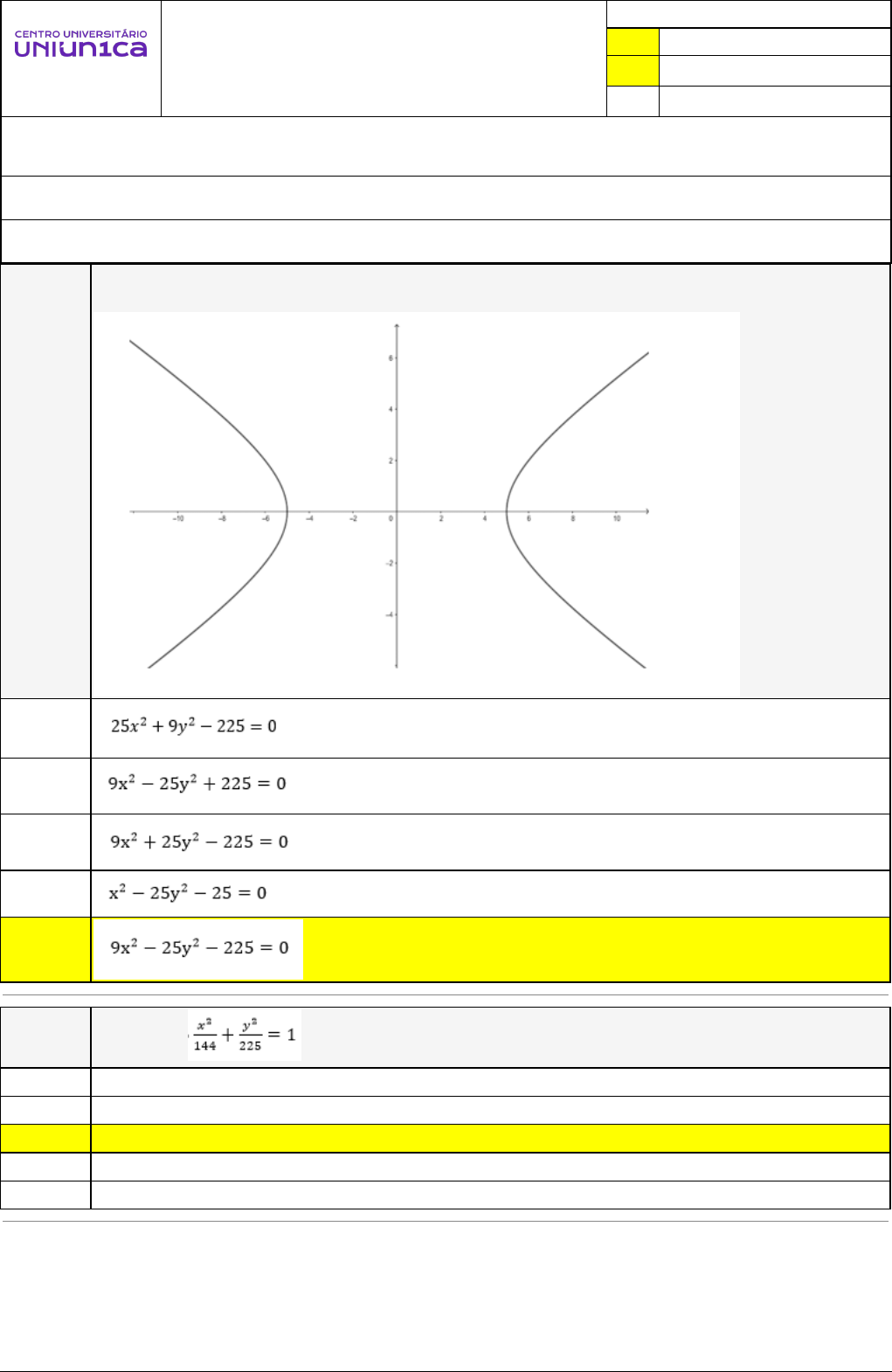 Pincel Atômico - 13/04/2025 10:55:21 1/5 VITOR AGUIAR DA SILVA Exercício Caminho do Conhecimento - Etapa 24 (16335) Atividade finalizada em 26/02/2025 14:41:05 (3422892 / 1) LEGENDA Resposta correta na questão # Resposta correta - Questão Anulada X Resposta selecionada pelo Aluno Disciplina: GEOMETRIA: FUNDAMENTOS E MÉTODOS DE ENSINO E PRÁTICAS PEDAGÓGICAS [1415798] - Avaliação com 8 questões, com o peso total de 1,67 pontos [capítulos - 6] Turma: Segunda Graduação: Segunda Graduação 6 meses - Licenciatura em Matemática - Grupo: FPD-NOV/2024 - SGegu0A281124 [151747] Aluno(a): 91704348 - VITOR AGUIAR DA SILVA - Respondeu 7 questões corretas, obtendo um total de 1,46 pontos como nota [355451_50603] Questão 001 Uma hipérbole como a apresentada na figura abaixo, tem como equação geral a seguinte expressão algébrica: X [355452_51224] Questão 002 A equação representa uma: elipse com centro em ( 12; 5 ) circunferência de raio igual 9 X elipse com focos em ( 0; 9 ) e ( 0; -9 ) parábola hipérbole Pincel Atômico - 13/04/2025 10:55:21 2/5 [355451_50601] Questão 003 Considere uma elipse com a seguinte e equação reduzida: E gráfico apresentado a seguir: As afirmações abaixo serão relativas à cônica, julgue-as em verdadeiras ou falsas e logo após assinale a alternativa correta. I - A elipse apresentada tem centro fora da origem e as suas coordenadas são C( 1; 1 ). II – A elipse apresentada tem eixo menor horizontal e mede 2 unidades de comprimento. III – As coordenadas dos focos da elipse são: ( 0; 2√(3)) e ( 2√3; 0 ). IV – O eixo maior da elipse é vertical e mede 8 unidades de comprimento. V – A elipse apresentada tem distância focal igual a 4√3 unidades de comprimento. Podemos afirmar que: todas as afirmativas estão corretas. somente e III estão corretas. todas as afirmativas estão incorretas. somente I e II estão corretas. X somente I, IV e V estão corretas. [355451_50605] Questão 004 A condição de alinhamento a respeito de três pontos, nos informa que se o determinante que envolve as coordenadas dos pontos for igual a zero, podemos garantir que os pontos apresentados são colineares. Podemos então concluir que se os pontos não estiverem alinhados, obrigatoriamente eles serão vértices de um triângulo qualquer do plano cartesiano. Analisando os pontos A( 3k+2; -1 ), B( 2; 3 ) e C ( -1; 4 ), encontre a condição para que eles sejam vértices de um triângulo ABC. k = -1 k ≠ 3 X k ≠ 4 k ≠ 2 k ≠ 0 Pincel Atômico - 13/04/2025 10:55:21 3/5 [355451_50599] Questão 005 O estudo da geometria analítica possibilita a análise de estruturas geométricas através de equações e normas algébricas, não excluindo totalmente a visualização de tais estruturas geométricas pela sua forma. Com base nessas informações e observando a figura abaixo, julgue as afirmativas a seguir em verdadeiras ou falsas. I – A circunferência apresentada tem centro no ponto C (2; 1). II – A equação geral da circunferência é dada por x2 + y2 + 2x +y – 3 =0. III – A distância do centro da circunferência apresentada até a origem do sistema de coordenadas cartesianas é igual a √5. IV – Ao traçarmos uma reta que passa pelo centro da circunferência e pelo ponto A ( -1; 3), a sua equação geral será dada por 2x +3y -7 = 0. Em relação às afirmativas apresentadas acima, podemos dizer que: somente as afirmativas I, III e IV estão corretas. todas são incorretas. somente I e IV estão incorretas. X todas estão corretas. somente IV está correta. Pincel Atômico - 13/04/2025 10:55:21 4/5 [355453_51215] Questão 006 Sendo dada uma reta r do plano de coordenadas cartesianas, podemos escrevê-la da forma geral ( usando por exemplo a condição de alinhamento de três pontos com o determinante de ordem 3 ), porém, podemos apresentar uma reta na forma reduzida, que seria, de uma forma bem rápida, obtida ao isolarmos a variável y na forma geral Assim então, podemos verificar que o coeficiente de x e nessa forma reduzida será denominado de coeficiente angular e estará relacionado com a inclinação da reta que ele representa ( o coeficiente angular também será cahamado de declividade ) Observando as retas r e s apresentadas no plano cartesiano a seguir, determine então os valores dos coeficientes angulares de cada uma delas X [355453_51227] Questão 007 X Pincel Atômico - 13/04/2025 10:55:21 5/5 [355451_50598] Questão 008 X (-1;2) (0;3) (2;-1) (3;0) (0;0)