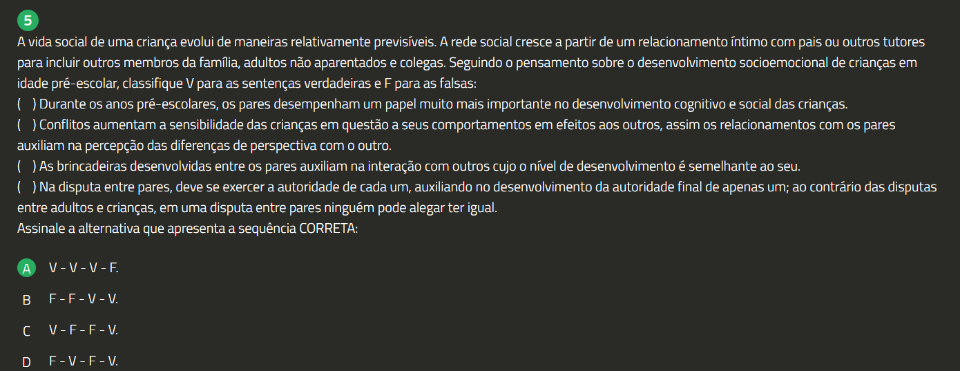 5 A vida social de uma criança evolui de maneiras relativamente previsíveis. A rede social cresce a partir de um relacionamento íntimo com pais ou outros tutores para incluir outros membros da família, adultos não aparentados e colegas. Seguindo pensamento sobre desenvolvimento socioemocional de crianças em idade pré-escolar, classifique V para as sentenças verdadeiras e F para as falsas: ( ) Durante os anos pré-escolares, os pares desempenham um papel muito mais importante no desenvolvimento cognitivo e social das crianças. ( ) Conflitos aumentam a sensibilidade das crianças em questão a seus comportamentos em efeitos aos outros, assim os relacionamentos com os pares auxiliam na percepção das diferenças de perspectiva com outro. ( ) As brincadeiras desenvolvidas entre os pares auxiliam na interação com outros cujo nível de desenvolvimento é semelhante ao seu. ( ) Na disputa entre pares, deve se exercer a autoridade de cada um, auxiliando no desenvolvimento da autoridade final de apenas um; ao contrário das disputas entre adultos e crianças, em uma disputa entre pares ninguém pode alegar ter igual. Assinale a alternativa que apresenta a CORRETA: A V - V - V - F. B F - F - V - V. V F - F - V. D - F - V.