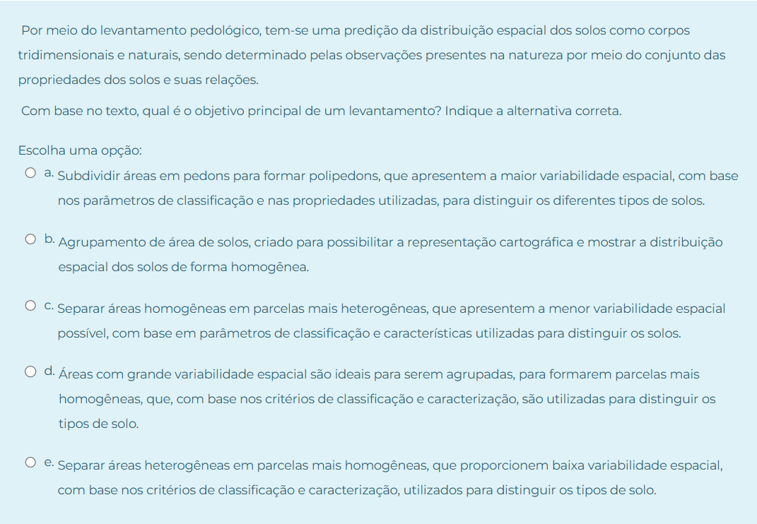 Por meio do levantamento pedológico, tem-se uma predição da distribuição espacial dos solos como corpos tridimensionais e naturais, sendo determinado pelas observações presentes na natureza por meio do conjunto das propriedades dos solos e suas Com base no texto, qual é objetivo principal de um levantamento? Indique a alternativa correta. Escolha uma opção: a. Subdividir áreas em pedons para formar polipedons, que apresentem a maior variabilidade espacial, com base nos parâmetros de classificação e nas propriedades utilizadas, para distinguir os diferentes tipos de b. Agrupamento de área de solos, criado para possibilitar a representação cartográfica e mostrar a distribuição espacial dos solos de forma homogênea. C. Separar áreas homogêneas em parcelas mais heterogêneas, que apresentem a menor variabilidade espacial com base em parâmetros de classificação e características utilizadas para distinguir os solos. d. Áreas com grande variabilidade espacial são ideais para serem agrupadas, para formarem parcelas mais homogêneas, que, com base nos critérios de classificação e caracterização, são utilizadas para distinguir os tipos de solo. e. Separar áreas heterogêneas em parcelas mais homogêneas, que proporcionem baixa variabilidade espacial, com base nos critérios de classificação e caracterização, utilizados para distinguir os tipos de solo.