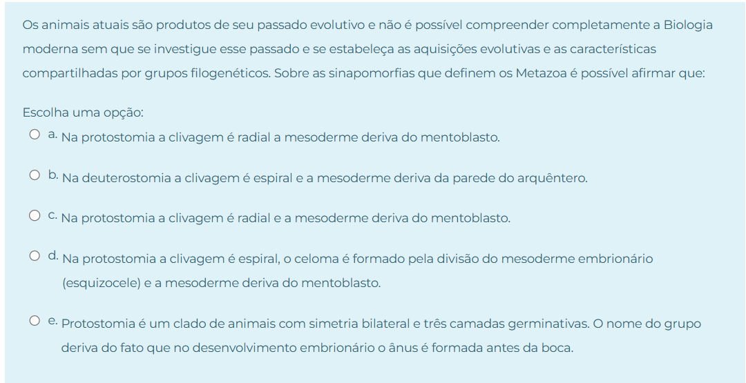 Os animais atuais são produtos de seu passado evolutivo e não é possível compreender completamente a Biologia moderna sem que se investigue esse passado e se estabeleça as aquisições evolutivas e as características compartilhadas por grupos filogenéticos. Sobre as sinapomorfias que definem os Metazoa é possível afirmar que: Escolha uma opção: a. Na protostomia a clivagem é radial a mesoderme deriva do mentoblasto. b. Na deuterostomia a clivagem é espiral e a mesoderme deriva da parede do arquêntero. C. Na protostomia a clivagem é radial e a mesoderme deriva do mentoblasto. d. Na protostomia a clivagem é espiral, celoma é formado pela divisão do mesoderme embrionário (esquizocele) e a mesoderme deriva do mentoblasto. e. Protostomia é um clado de animais com simetria bilateral e três camadas germinativas. nome do grupo deriva do fato que no desenvolvimento embrionário ânus é formada antes da boca
