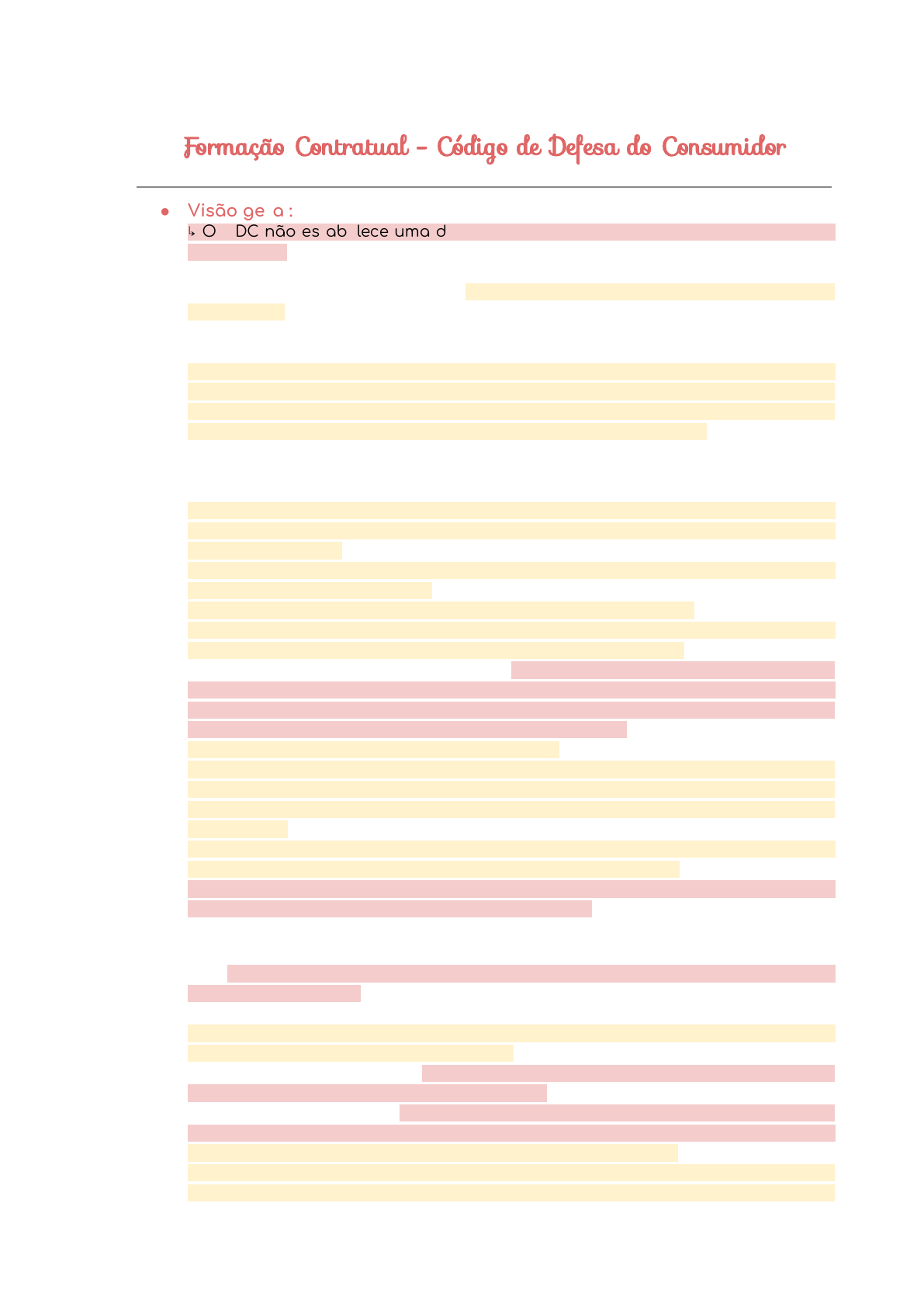 Formação Contratual - Código de Defesa do Consumidor ● Visão geral: ↳ O CDC não estabelece uma divisão específica sobre a formação do contrato de consumo como o Código Civil. ↳ Dessa forma, é possível aplicar o Código Civil em diálogo de fontes. ↳ Assim como no Código Civil, a boa-fé é imperativa em TODAS as fases contratuais. ↳ O CDC apresenta diversos artigos importantes sobre a oferta dentro da fase pré-contratual. ⇘ Art. 30. Toda informação ou publicidade, suficientemente precisa, veiculada por qualquer forma ou meio de comunicação com relação a produtos e serviços oferecidos ou apresentados, obriga o fornecedor que a fizer veicular ou dela se utilizar e integra o contrato que vier a ser celebrado. ↳ O descumprimento da oferta pode ensejar tutela específica, que se aperfeiçoa por meio das astreintes (multa). ↳ Entretanto, o CDC nos apresenta outras possibilidades antes disso: ⇘ Art. 35. Se o fornecedor de produtos ou serviços recusar cumprimento à oferta, apresentação ou publicidade, o consumidor poderá, alternativamente e à sua livre escolha: I - exigir o cumprimento forçado da obrigação, nos termos da oferta, apresentação ou publicidade; II - aceitar outro produto ou prestação de serviço equivalente; III - rescindir o contrato, com direito à restituição de quantia eventualmente antecipada, monetariamente atualizada, e a perdas e danos. ↳ Princípio da Informação (Art.6, III): permite que o consumidor, dentro da dinâmica contratual, perceba de forma imediata QUEM é o seu fornecedor de produtos e serviços E os termos do contrato que está prestes a assinar, sob pena da aplicação do Princípio da Aparência (Art. 34). ⇘ Art. 6º São direitos básicos do consumidor: III - a informação adequada e clara sobre os diferentes produtos e serviços, com especificação correta de quantidade, características, composição, qualidade, tributos incidentes e preço, bem como sobre os riscos que apresentem; ⇘ Art. 34. O fornecedor do produto ou serviço é solidariamente responsável pelos atos de seus prepostos ou representantes autônomos. ↳ O princípio da informação está presente em toda formação da oferta no direito consumerista e em todo o tipo de produto! ● Publicidade enganosa ou abusiva: ↳ A publicidade deve ser veiculada de uma maneira que o consumidor a identifique como tal, ou seja, que o consumidor veja e saiba que é uma propaganda. ⇘ Art. 36. A publicidade deve ser veiculada de tal forma que o consumidor, fácil e imediatamente, a identifique como tal. ↳ A propaganda enganosa é aquela que incide ao ERRO em razão de falsas informações ou omissão de qualquer forma. ↳ A propaganda abusiva é a discriminatória, que incita medo ou superstição, que se aproveita da inexperiência de crianças ou prejudique ao meio ambiente. ⇘ Art. 37. É proibida toda publicidade enganosa ou abusiva. § 1° É enganosa qualquer modalidade de informação ou comunicação de caráter publicitário, inteira ou parcialmente falsa, ou, por qualquer outro modo, mesmo por omissão, capaz de induzir em erro o consumidor a respeito da natureza, características, qualidade, quantidade, propriedades, origem, preço e quaisquer outros dados sobre produtos e serviços. § 2° É abusiva, dentre outras a publicidade discriminatória de qualquer natureza, a que incite à violência, explore o medo ou a superstição, se aproveite da deficiência de julgamento e experiência da criança, desrespeita valores ambientais, ou que seja capaz de induzir o consumidor a se comportar de forma prejudicial ou perigosa à sua saúde ou segurança. ↳ Patrocinar publicidade enganosa ou abusiva é crime! ● Dinâmica pré-contratual no CDC: ↳ Portanto, nas relações pré-contratuais de consumo prevalecem os direitos à informação correta e completa e a interpretação contratual mais favorável ao consumidor, imperativos consequentes da boa-fé e da função social. ⇘ Art. 46. Os contratos que regulam as relações de consumo não obrigarão os consumidores, se não lhes for dada a oportunidade de tomar conhecimento prévio de seu conteúdo, ou se os respectivos instrumentos forem redigidos de modo a dificultar a compreensão de seu sentido e alcance. ⇘ Art. 48. As declarações de vontade constantes de escritos particulares, recibos e pré-contratos relativos às relações de consumo vinculam o fornecedor, ensejando inclusive execução específica, nos termos do art. 84 e parágrafos. ↳ Os artigos acima são decorrência do dever da boa-fé contratual na perspectiva da hipossuficiência do consumidor. ↳ Um exemplo disso é o prazo de reflexão. ⇘ Art. 49. O consumidor pode desistir do contrato, no prazo de 7 dias a contar de sua assinatura ou do ato de recebimento do produto ou serviço, sempre que a contratação de fornecimento de produtos e serviços ocorrer fora do estabelecimento comercial, especialmente por telefone ou a domicílio. Parágrafo único. Se o consumidor exercitar o direito de arrependimento previsto neste artigo, os valores eventualmente pagos, a qualquer título, durante o prazo de reflexão, serão devolvidos, de imediato, monetariamente atualizados. ⇘ Art. 52. No fornecimento de produtos ou serviços que envolva outorga de crédito ou concessão de financiamento ao consumidor, o fornecedor deverá, entre outros requisitos, informá-lo prévia e adequadamente sobre: I - preço do produto ou serviço em moeda corrente nacional; II - montante dos juros de mora e da taxa efetiva anual de juros; III - acréscimos legalmente previstos; IV - número e periodicidade das prestações; V - soma total a pagar, com e sem financiamento. ● Formação contratual pela via digital: ↳ Podem ser aplicadas tanto as regras do Código Civil quanto as as regras do CDC, sem trazer prejuízos à parte vulnerável (diálogo das fontes). ↳ O contrato digital é formato entre presentes ou entre ausentes? ↳