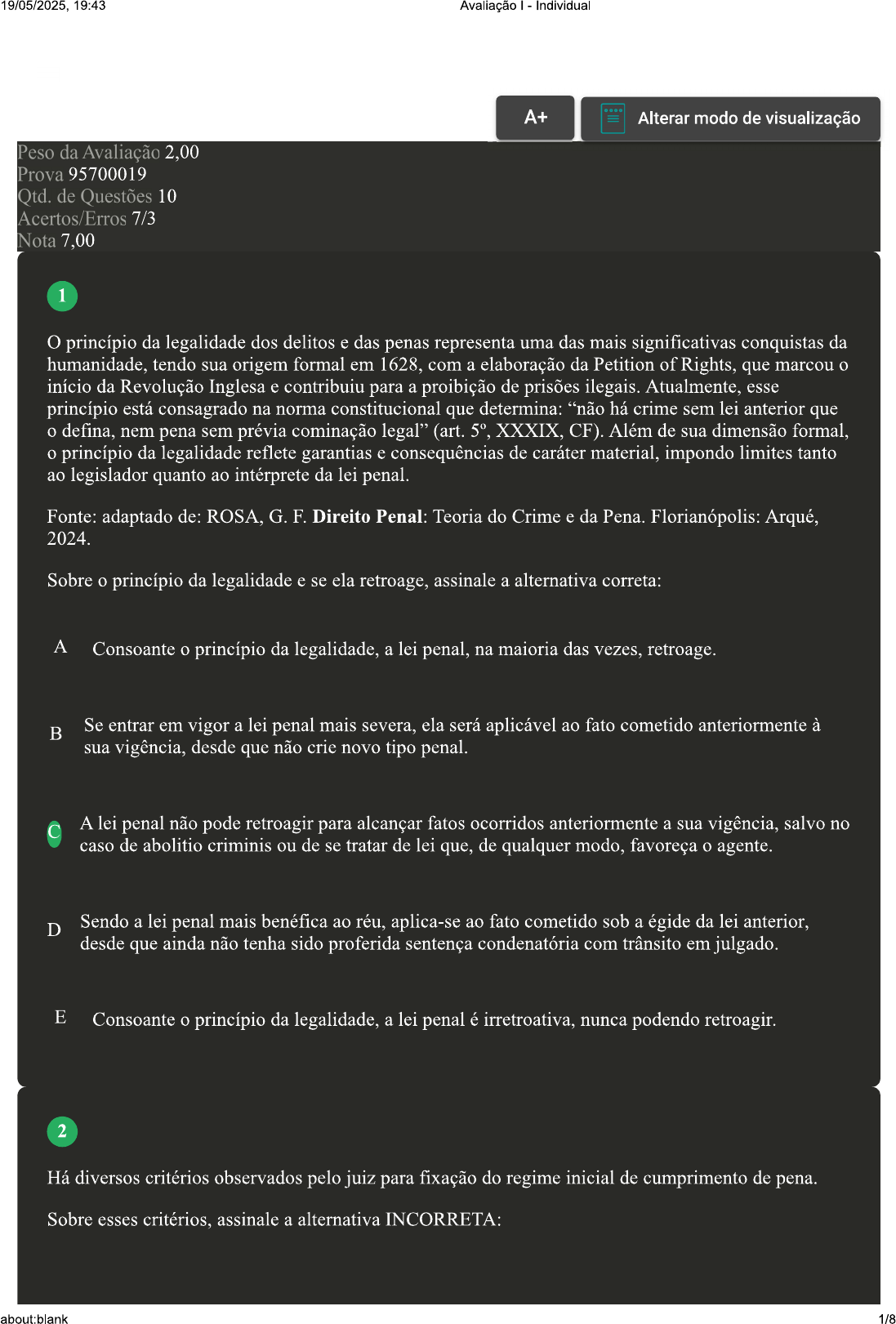 19/05/2025, 19:43 Avaliação Individual A+ Alterar modo de visualização Peso da Avaliação 2,00 Prova 95700019 Qtd. de Questões 10 Acertos/Erros 7/3 Nota 7,00 1 O princípio da legalidade dos delitos e das penas representa uma das mais significativas conquistas da humanidade, tendo sua origem formal em 1628, com a elaboração da Petition of Rights, que marcou início da Revolução Inglesa e contribuiu para a proibição de prisões ilegais. Atualmente, esse princípio está consagrado na norma constitucional que determina: "não há crime sem lei anterior que defina, nem pena sem prévia cominação legal" (art. XXXIX, CF) Além de sua dimensão formal, princípio da legalidade reflete garantias e consequências de caráter material, impondo limites tanto ao legislador quanto ao intérprete da lei penal Fonte: adaptado de: ROSA, G. F. Direito Penal: Teoria do Crime e da Pena. Florianópolis: Arqué, 2024. Sobre princípio da legalidade e se ela retroage, assinale a alternativa correta: A Consoante princípio da legalidade, a lei penal, na maioria das vezes, retroage. B Se entrar em vigor a lei penal mais severa, ela será aplicável ao fato cometido anteriormente à sua vigência, desde que não crie novo tipo penal. A lei penal não pode retroagir para alcançar fatos ocorridos anteriormente a sua vigência, salvo no caso de abolitio criminis ou de se tratar de lei que, de qualquer modo, favoreça agente. D Sendo a lei penal mais benéfica ao réu, aplica-se ao fato cometido sob a égide da lei anterior, desde que ainda não tenha sido proferida sentença condenatória com trânsito em julgado. E Consoante princípio da legalidade, a lei penal é irretroativa, nunca podendo retroagir. 2 Há diversos critérios observados pelo juiz para fixação do regime inicial de cumprimento de pena. Sobre esses critérios, assinale a alternativa INCORRETA: about:blank 1/819/05/2025, 19:43 Avaliação Individual A A personalidade do agente. B A conduta social do agente. C A culpabilidade do agente. D A não culpabilidade do agente. 3 Com relação aos elementos subjetivos do tipo, sabe-se que compõem conjunto dos caracteres subjetivos (ou anímicos) do tipo legal de delito. O dolo é elemento geral da ação final que compõe tipo subjetivo. Fonte: adaptado de: ROSA, G. F. Direito Penal: Teoria do Crime e da Pena. Florianópolis: Arqué, 2024. Sobre os elementos subjetivos do tipo penal, analise as afirmativas a seguir: I. O Código Penal brasileiro encampou a concepção monista de dolo. II. O dolo é elemento subjetivo geral do injusto, composto de consciência e vontade de realizar os elementos objetivos do tipo. III. Os ordenamentos jurídico-penais pátrios prevalecem na opção pela concepção dualista de dolo, que exige conhecimento (saber) e vontade (querer), definindo-o como a vontade livre e consciente de produzir resultado. IV. O dolo é a consciência e a vontade de realização dos elementos objetivos do tipo de injusto doloso. Por isso é composto de dois elementos: primeiro, de ordem intelectiva, é a consciência; segundo, de ordem volitiva, é a vontade. É correto que se afirma em: A I, II e III, apenas. B III e IV, apenas. II, III e IV, apenas. about:blank 2/819/05/2025, 19:43 Avaliação Individual D IV, apenas. E II e III, apenas. 4 No dizer de Welzel, ele é como orifício da agulha" pelo qual têm que passar todos os valores da ação. Logo, nenhuma reforma do Direito Penal pode ser aceitável se não se dirige à proteção de algum bem jurídico, por mais que esteja orientada aos valores da ação. Um tipo penal elaborado ante a ausência de um bem jurídico resulta em um Direito Penal materialmente injusto e ético-socialmente intolerável, carecendo de sentido na ordem jurídica. É dizer: não cabe acionar instrumento estatal de controle social se a conduta (ativa ou omissiva) que se pretende proibir não possui qualquer laivo de lesividade. Proibir por proibir, carece de sentido e de legitimação, dá ensejo a um Direito Penal sectário e leviano, pervertendo-se seus reais sentidos. Fonte: WELZEL, H. novo sistema jurídico-penal: uma introdução à doutrina da ação finalista. Tradução de Luiz Regis Prado. 3. ed. São Paulo: Revista dos Tribunais, 2011. Com relação ao bem jurídico-penal e suas características, analise as afirmativas a seguir: I. O conceito ideal de bem jurídico deve compreender sua dimensão constitucional. II. O bem jurídico-penal fundamenta a ilicitude material, ao mesmo tempo em que legitima a intervenção penal legalizada. III. O objeto de tutela penal deve ser submetido a uma leitura personalista, vinculada ao desenvolvimento pessoal do indivíduo. IV. O conceito de bem jurídico-penal como os valores e interesses relevantes e significativos para a vida humana tanto individual (bens individuais) quanto coletiva (bens transindividuais). É correto que se afirma em: A I, II, III e IV. B II e IV, apenas. C I, apenas. D III e IV, apenas. about:blank 3/819/05/2025, 19:43 Avaliação Individual E I, II e III, apenas. 5 O Direito Penal é, por excelência, um Direito tipológico, de modo que, tipo legal vem a ser modelo, imagem ou esquema conceitual da ação ou da omissão proibida, dolosa ou culposa. O tipo, como tipo de injusto, compreende todos os elementos e/ou circunstâncias que fundamentam injusto penal específico de uma figura delitiva. Por isso dizer que tipo serve de base à ilicitude particular de uma ação ou omissão típica (conduta típica), podendo-se conceituar tipo de injusto como a ação ou omissão típica e ilícita. Fonte: L. R. Curso de Direito Penal brasileiro: parte geral. 21. ed. Londrina: Thoth, 2023. Com relação aos elementos do tipo penal, analise as afirmativas a seguir: I. Os elementos subjetivos do tipo compõem-se do conjunto dos caracteres materiais do tipo legal de delito. II. Os elementos subjetivos do tipo referem-se ao conjunto dos caracteres anímicos do tipo legal de delito. III. Os elemento