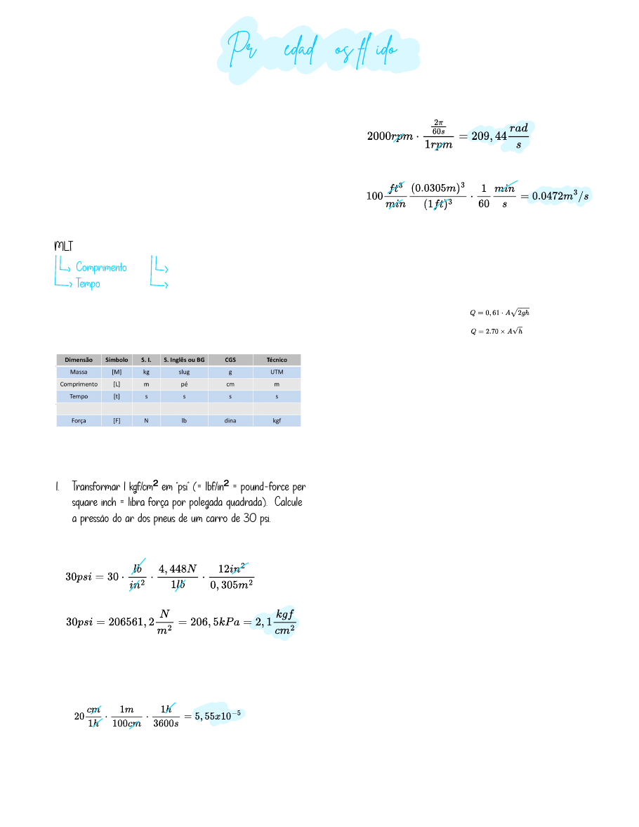 Propriedade dos fluidos O que é Mecânica dos Fluídos? Mecânica dos fluidos é a parte da mecânica aplicada que se dedica à análise do comportamento dos líquidos e gases tanto em equilíbrio quanto em movimento. Mecânica dos fluidos é a combinação de teoria e experiência. Dimensão e Unidades Todas as dimensões não primárias podem ser formadas por alguma combinação das sete dimensões primárias. Conversão de Unidades 1. Transformar 1 kgf/cm² em “psi” (= lbf/in² = pound-force per square inch = libra força por polegada quadrada). Calcule a pressão do ar dos pneus de um carro de 30 psi. MLT Comprimento Tempo MLT Força Tempo 2. Converter para o S.I a) 20cm/h b) 2000rpm c) 100 ft/min Fluido: Fluido é uma substância que não tem forma própria, assume o formato do recipiente. Homogeneidade dimensional: Todas as equações teóricas são dimensionalmente homogêneas. • Eq. homogênea geral • Eq. homogênea restrita A = área do orifício g = aceleração da gravidade h = altura da superfície livre do líquido Definições • Fluidos: deformação continua; escoam para qualquer tensão de cisalhamento a que sejam submetidos. • Sólidos: Quando submetidos a ação de uma tensão de cisalhamento, sofrem uma deformação reversível até que o seu limite de elasticidade seja alcançado. A partir deste limite, o sólido não mais retorna ao formato anterior. • Hipótese do contínuo: Despreza espaçamento e atividade intermolecular do fluido. Considerando-o como meio contínuo que pode ser dividido infinitas vezes em partículas fluidas entre as quais se supõe não haver vazios. Propriedades dos fluidos • Extensivas: dependem da massa do corpo. Ex.: peso, energia, etc. • Intensivas: não dependem da massa do corpo. Ex.: viscosidade, densidade, pv, etc. -T - - -- - - -- -1 3. Densidade ou densidade relativa 4. Módulo de elasticidade volumétrico 5. Coeficiente de compressibilidade Viscosidade Dinâmica Propriedade responsável pela resistência a deformação (medida de resposta a uma força aplicada tangencialmente) • Fluido ideal ou perfeito: fluido não-viscoso e fluido incompressível • Fluido Newtoniano: não varia com a força aplicada Lei da viscosidade de Newton Viscosidade e classificação dos fluidos • Fluido ideal ou perfeito: fluido não-viscoso e fluido incompressível • Fluido Newtoniano: não varia com a força aplicada • Plástico de Bingham - Ex: maionese, pasta de dente, suspensões de argila. • Nao dilatantes / pseudoplásticos - a viscosidade dinâmica aparente diminui com o aumento da taxa de cisalhamento - ex: tinta látex no pincel —nao pinga pq a taxa de cisalhamento é baixa e a viscosidade é alta. No entanto desliza suavemente na parede pa a taxa de cisalhamento aumenta e a viscosidade diminui. • Dilatantes - ex: suspensões de amido ou água com areia. Areia (movediça).- esforço necessário para retirar um objeto da areia aumenta com o aumento da velocidade, Viscosidade cinemática • Para líquidos diminui com a temperatura • Para gases aumenta com a temperatura 1. Massa Específica 2. Peso Específico Aplicação viscosidade Espessura? 3 ft/s P 30 Dados: A= 2pes2=0,186 m2 P= 30lb - 400,34 N U= 1 poise - 0,1 kg/ms V= 3ft/s - 0,91 m/s ↑ Coesão e Adesão • Coesão: Atração recíproca de moléculas de um mesmo fluido, permitindo que as partículas de fluido possam resistir a pequenos esforços. Ex: formação de gotas de água. • Adesão: É a propriedade que tem os líquidos de se unirem a outros corpos quando a atração exercida pelas moléculas de sólidos são maiores que a atração entre as moléculas do próprio fluido. Condição de não-deslizamento É a resistência ao deslizamento de fluidos ao longo de superfícies sólidas. Quando um fluido escoa ao longo de uma superfície sólida, junto a esta superfície existe uma camada fluida aderente que não se movimenta, camada esta que causa efeito de freio sobre as demais camadas. Pressão de vapor • Pressão de vapor: é a pressão à qual há um equilíbrio entre as moléculas que saem e que reentram. • Ebulição: ponto no qual a pressão de vapor é igual a pressão atmosférica. Cavitação Quando P