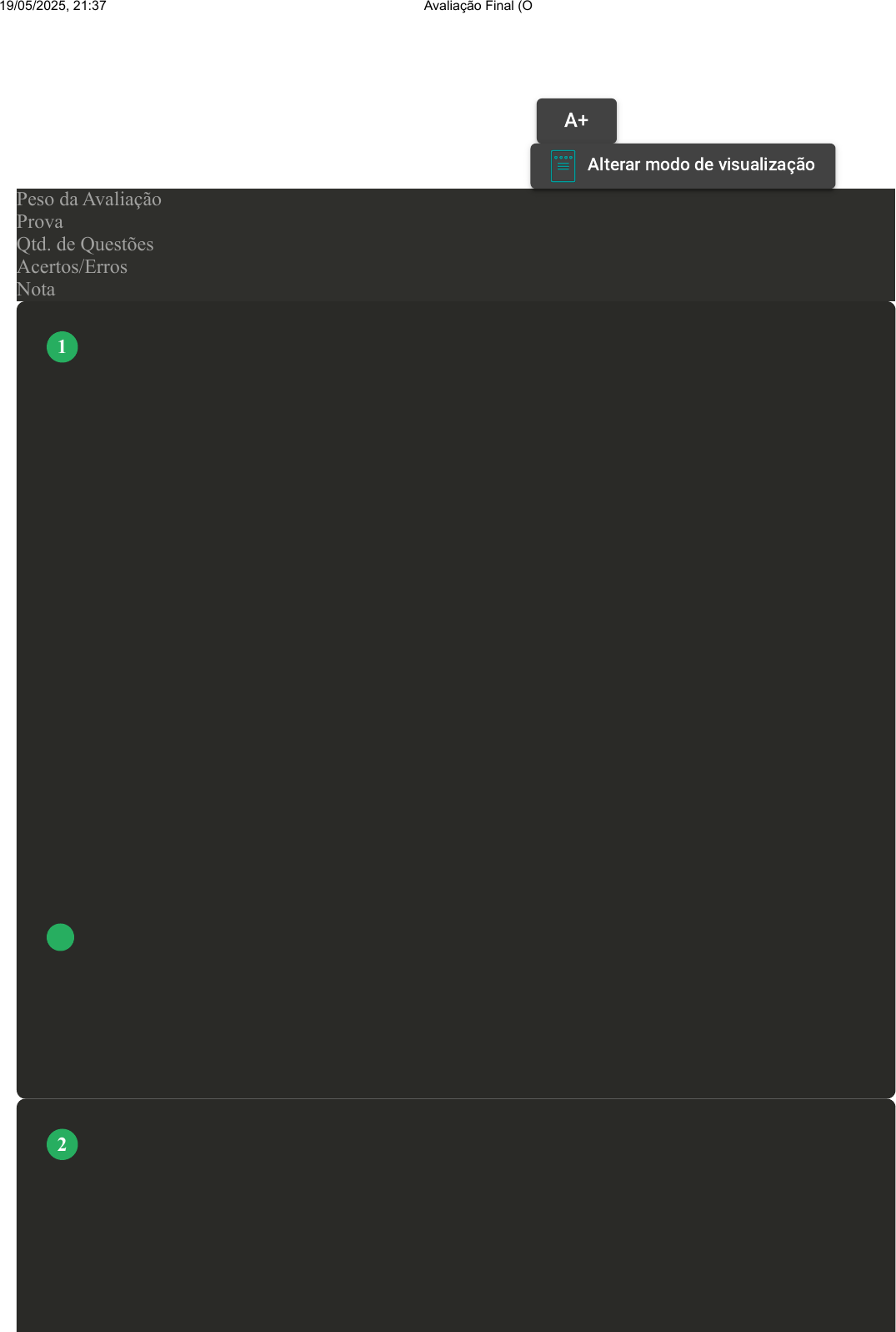 Prova Impressa GABARITO | Avaliação Final (Objetiva) - Individual (Cod.:1023552) Peso da Avaliação 3,00 Prova 99052857 Qtd. de Questões 10 Acertos/Erros 9/1 Nota 9,00 Estamos preocupados com os princípios operacionais fundamentais dos relés eletromecânicos de pequeno porte que podemos usar no controle de motores ou circuitos robóticos. Tais relés são usados em circuitos gerais de controle elétrico e comutação eletrônica, montados diretamente em placas de circuito impresso (PCIs) ou conectados em suportes e nos quais as correntes de carga são normalmente frações de 1 ampère até mais de 20 ampères. O circuito com relé é comum em aplicações eletrônicas. Como o nome indica, os relés eletromecânicos são dispositivos eletromagnéticos que convertem um fluxo magnético gerado pela aplicação de um sinal de controle elétrico de baixa tensão, tanto CA quanto CC nos terminais de relé, em uma força mecânica puxando que opera os contatos elétricos dentro do relé. Com base nesse contexto, classifique V para as sentenças verdadeiras e F para as falsas: ( ) A forma mais comum de relé eletromecânico consiste em uma bobina de Helmholtz chamada de "circuito primário" enrolada em torno de um núcleo de ferro permeável. ( ) Este núcleo de ferro tem uma porção fixa chamada cabeçote, e uma parte móvel pressionada por uma mola chamada armadura, que completa o circuito de campo magnético fechando a abertura de ar entre a bobina elétrica fixa e a armadura móvel. ( ) A armadura é contínua e fixa, não permitindo que ela se mova livremente dentro do campo magnético gerado fechando os contatos elétricos que estão ligados a ela. ( ) Conectado entre o cabeçote e a armadura está normalmente uma mola de retorno para trazer os contatos de volta a sua posição inicial de repouso quando a bobina do relé está na condição "desenergizada", ou seja, desligada, "OFF. Assinale a alternativa que apresenta a sequência CORRETA: A V - V - F - F. B F - V - F - V. C F - F - V - V. D V - F - V - F. A eletricidade estática é um fenômeno muito comum e abundante em nosso dia a dia. A interação entre cargas positivas e negativas explica uma grande parte dos fenômenos físicos e químicos que regem o mundo como conhecemos. O campo elétrico das cargas positivas é radial, isto é, propaga-se na direção da reta que liga um ponto do espaço à carga que o origina. Além disso, seu sentido é para fora, ou seja, o campo elétrico das cargas positivas emerge delas. Com base nesse contexto, analise as sentenças seguintes: I- O campo elétrico explica a forma como as cargas elétricas interagem entre si. VOLTAR A+ Alterar modo de visualização 1 2 19/05/2025, 21:37 Avaliação Final (Objetiva) - Individual about:blank 1/5 II- Não podemos determinar o formato do campo elétrico gerado por uma carga ou por uma distribuição de cargas usando as linhas de campo elétrico. Devemos calcular analiticamente o seu valor. III- Conhecendo o comportamento de um campo elétrico em termos de distâncias, forças e cargas envolvidas, podemos compreender vários fenômenos, tais como descargas atmosféricas, até o funcionamento de uma impressora a laser. Assinale a alternativa CORRETA: A As sentenças II e III estão corretas. B As sentenças I e II estão corretas. C Somente a sentença I está correta. D As sentenças I e III estão corretas. [Laboratório virtual – Autoindução] Foi possível observar, por meio deste laboratório virtual, como o magnetismo proveniente da Terra influencia na orientação da bússola e ainda é útil nos dias atuais. Além disso, foi constatado que o campo magnético gerado por um circuito pode afetar a direção do ponteiro da agulha imantada. Ao posicionar a bússola sobre o condutor e ligarmos o interruptor fechado, podemos determinar a direção do campo magnético utilizando a Regra da Mão Direita. Sobre o exposto e os resultados obtidos no experimento, assinale a alternativa CORRETA: A Foi gerado um campo elétrico numa direção perpendicular à da corrente. B Foi gerado um campo magnético numa direção paralela à da corrente. C Foi gerado um campo magnético numa direção perpendicular à da corrente. D Foi gerado um campo elétrico numa direção paralela à da corrente. No caso das cargas elétricas, a força magnética passa a existir quando uma partícula eletricamente carregada movimenta-se em uma região onde atua um campo magnético. Com base nesse contexto, analise as sentenças a seguir: I- Para determinar a força magnética F em um fio de comprimento e forma arbitrárias, devemos integrar acima de dF sobre todo o fio. II- Se a seção de fio for constante e B for uniforme, os diferenciais da equação se tornam quantidades absolutas, nos dando: F =I.l ×B. III- Esta é a força em um fio reto percorrido por uma corrente e imerso em um campo magnético uniforme. 3 4 19/05/2025, 21:37 Avaliação Final (Objetiva) - Individual about:blank 2/5 Assinale a alternativa CORRETA: A As sentenças I, II e III estão corretas. B Somente a sentença I está correta. C Somente a sentença II está correta. D Somente a sentença III está correta. Nos processos de automação em geral, há um uso disseminado de relés de interfaceamento de diversos tipos e características. Diversas vezes, o profissional responsável pela especificação destes sistemas defronta-se com situações em que ele deve optar por relés eletromecânicos ou relés de estado sólido e nem sempre são claros os limites que devem nortear esta decisão. Com base nesse contexto, classifique V para as sentenças verdadeiras e F para as falsas: ( ) O termo relé se refere a um dispositivo que fornece uma conexão elétrica entre dois ou mais pontos em resposta à aplicação de um sinal de controle. ( ) O tipo de relé elétrico mais comum e amplamente utilizado é o relé eletromecânico. ( ) O controle mais fundamental de qualquer equipamento é o controlador PID. ( ) O