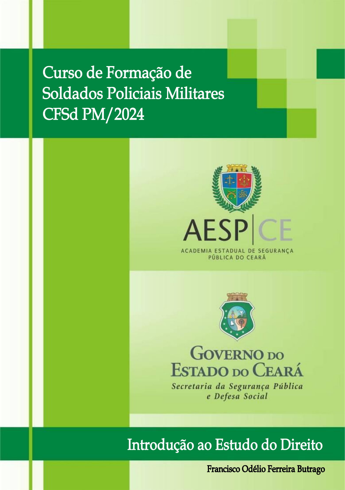 Academia Estadual de Segurança Pública do Ceará – AESP|CE INTRODUÇÃO AO ESTUDO DO DIREITO 1 GOVERNO DO ESTADO DO CEARÁ ELMANO de FREITAS da Costa GOVERNADOR DO ESTADO DO CEARÁ SECRETARIA DA SEGURANÇA PÚBLICA E DEFESA SOCIAL - SSPDS SAMUEL ELÂNIO de Oliveira Júnior - DPF SECRETÁRIO DA SSPDS ACADEMIA ESTADUAL DE SEGURANÇA PÚBLICA DO CEARÁ – AESP|CE LEONARDO D`Almeida Couto BARRETO - DPC DIRETOR-GERAL DA AESP|CE Francisca ASMENHA Cruz Furtado Torquato – Cel PM DIRETORA DE PLANEJAMENTO E GESTÃO INTERNA DA AESP|CE EVANDRO Queiroz de Assunção – Cel PM COORDENADOR DE ENSINO E INSTRUÇÃO DA AESP|CE TÚLIO Ítalo da Silva Oliveira – Perito Criminal COORDENADOR ACADÊMICO PEDAGÓGICO DA AESP|CE Francisca ADEIRLA Freitas da Silva – Maj PM SECRETÁRIA ACADÊMICA DA AESP|CE MÔNICA Pontes Rodrigues ORIENTADORA DA CÉLULA DE ENSINO A DISTÂNCIA DA AESP|CE CURSO DE FORMAÇÃO DE SOLDADOS POLICIAIS MILITARES - CFSD PM/2024 DISCIPLINA Introdução ao Estudo do Direito CONTEUDISTA Francisco Odélio Ferreira Butrago FORMATAÇÃO JOELSON Pimentel da Silva – 1º SGT PM • 2024 • Academia Estadual de Segurança Pública do Ceará – AESP|CE INTRODUÇÃO AO ESTUDO DO DIREITO 2 SUMÁRIO INTRODUÇÃO AO ESTUDO DO DIREITO .......................................................................................................................................... 3 1. CONSIDERAÇÕES INICIAIS ........................................................................................................................................................... 3 2. A SOCIEDADE ESTATAL ................................................................................................................................................................ 3 2.1 Formação do Estado e Divisão Dos Poderes ........................................................................................................................ 3 2.2 Supremacia da Constituição ................................................................................................................................................. 4 2.3 Norma Jurídica e Ordenamento Jurídico .............................................................................................................................. 4 2.5 Relações Jurídicas ................................................................................................................................................................. 5 3. DISCIPLINAS JURÍDICAS .............................................................................................................................................................. 5 3.1 Disciplinas Jurídicas Fundamentais ...................................................................................................................................... 6 3.2 Disciplinas Jurídicas Auxiliares ............................................................................................................................................. 6 4. SOCIABILIDADE HUMANA E OS INSTRUMENTOS DE CONTROLE SOCIAL ................................................................................... 6 4.1 O Mundo Natural e o Mundo Cultural ................................................................................................................................. 7 4.2 Direito e Moral ..................................................................................................................................................................... 7 4.3 Direito e Justiça .................................................................................................................................................................... 7 4.4 Direito e Equidade ................................................................................................................................................................ 7 4.5 Teoria Tridimensional do Direito .......................................................................................................................................... 7 5. SIGNIFICAÇÕES DO DIREITO ....................................................................................................................................................... 8 5.1 Direito Natural x Direito Positivo.......................................................................................................................................... 8 5.2 Direito Objetivo x Direito Subjetivo ..................................................................................................................................... 9 5.3 Direito Substantivo x Direito Adjetivo .................................................................................................................................. 9 6. TEORIAS DO DIREITO .................................................................................................................................................................. 9 6.2 Positivo Normativo de Hans Kelsen ................................................................................................................................... 10 7. FONTES DO DIREITO ................................................................................................................................................................. 10 9. RAMOS DO DIREITO .................................................................................................................................................................. 11 9.1. Direito Público ................................................................................................................................................................... 11 9.2 Direito Privado ................................................................................................................................................................... 12 9.3. Direito Misto ......................................................................