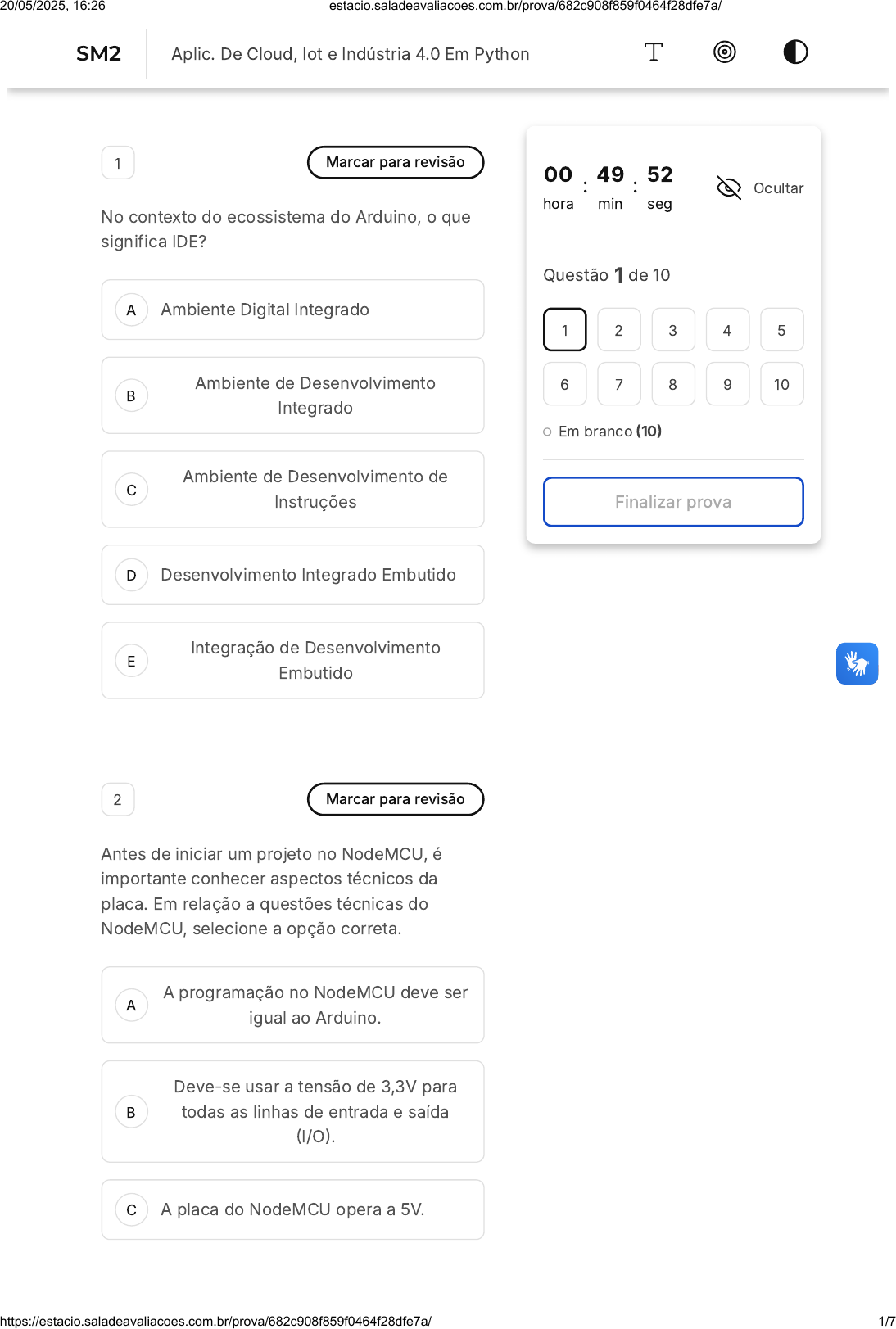 A B C D E A B C 1 Marcar para revisão No contexto do ecossistema do Arduino, o que significa IDE? Ambiente Digital Integrado Ambiente de Desenvolvimento Integrado Ambiente de Desenvolvimento de Instruções Desenvolvimento Integrado Embutido Integração de Desenvolvimento Embutido 2 Marcar para revisão Antes de iniciar um projeto no NodeMCU, é importante conhecer aspectos técnicos da placa. Em relação a questões técnicas do NodeMCU, selecione a opção correta. A programação no NodeMCU deve ser igual ao Arduino. Deve-se usar a tensão de 3,3V para todas as linhas de entrada e saída (I/O). A placa do NodeMCU opera a 5V. 00 hora : 49 min : 52 seg Ocultar Questão 1 de 10 Em branco (10) Finalizar prova 1 2 3 4 5 6 7 8 9 10 SM2 Aplic. De Cloud, Iot e Indústria 4.0 Em Python 20/05/2025, 16:26 estacio.saladeavaliacoes.com.br/prova/682c908f859f0464f28dfe7a/ https://estacio.saladeavaliacoes.com.br/prova/682c908f859f0464f28dfe7a/ 1/7 D E Os pinos de controle do NodeMCU são usados para aplicativos de Internet das Coisas. O NodeMCU possui diversos pinos para uso geral, chamados de GPIO, entre eles está o pino GND. 3 Marcar para revisão UFSBA - 2016 ‒ Universidade Federal do Sul da Bahia‒ CEV - Coordenação de Concursos e Exames Vestibulares ‒Engenheiro eletricista ‒ Adaptado Arduino é uma plataforma de eletrônica aberta para a criação de protótipos baseada em software e hardware livres, flexíveis e fáceis de usar. O Arduino pode adquirir informação do ambiente por meio de seus pinos de entrada, para isso uma completa gama de sensores pode ser usada. Por outro lado, o Arduino pode atuar no ambiente controlando luzes, motores ou outros atuadores. Os campos de atuação para o controle de sistemas são imensos, podendo ter aplicações na área de impressão 3D, robótica, engenharia de transportes, engenharia agronômica, musical, moda e tantas outras. O microcontrolador da placa Arduino é programado mediante a linguagem de programação Arduino, baseada em Wiring, e o ambiente de desenvolvimento (IDE) está baseado em Processing, uma linguagem de programação de código aberto. Em relação à programação do Arduino, a coluna da esquerda apresenta as três partes principais em que um programa pode ser dividido e a da direita, 20/05/2025, 16:26 estacio.saladeavaliacoes.com.br/prova/682c908f859f0464f28dfe7a/ https://estacio.saladeavaliacoes.com.br/prova/682c908f859f0464f28dfe7a/ 2/7 A B C D E A B C exemplo de cada uma das partes. Numere a coluna da direita de acordo com a da esquerda. 1- Estrutura ( ) pinMode 2- Variáveis ( ) while 3- Funções ( ) HIGH | LOW Assinale a sequência correta. 3, 1, 2 2, 3, 1 3, 2, 1 2, 1, 3 1, 2, 3 4 Marcar para revisão Em relação ao Arduino, selecione a opção errada sobre o seu ecossistema. As placas Arduino são capazes de ler sinais de entrada analógica ou digital de diferentes sensores. Arduino IDE usa uma versão simplificada de C++, tornando mais fácil aprender a programar. O Arduino fornece um fator de forma padrão que divide as funções do microcontrolador em um pacote mais acessível. 20/05/2025, 16:26 estacio.saladeavaliacoes.com.br/prova/682c908f859f0464f28dfe7a/ https://estacio.saladeavaliacoes.com.br/prova/682c908f859f0464f28dfe7a/ 3/7 D E A B C D E A B O Arduino é uma plataforma de código proprietário e usada apenas para aplicações de Internet das Coisas. É possível interagir com o Arduino com um programa em Python. 5 Marcar para revisão Qual o princípio da Indústria 4.0 em que máquinas não dependem da interferência humana para funcionar e são capazes de tomar decisões automatizadas com base em dados de desempenho? Virtualização. Modularização. Descentralização. Interoperabilidade. Automatização. 6 Marcar para revisão Que tipo de tecnologia de computação se refere a serviços e aplicativos que normalmente são executados em uma rede distribuída por meio de recursos virtualizados? Computação distribuída. Computação paralela. 20/05/2025, 16:26 estacio.saladeavaliacoes.com.br/prova/682c908f859f0464f28dfe7a/ https://estacio.saladeavaliacoes.com.br/prova/682c908f859f0464f28dfe7a/ 4/7 C D E A B C D E Computação suave. Computação em massa. Computação em nuvem. 7 Marcar para revisão O que define o grau em que dois ou mais sistemas podem trocar informações significativas de maneira útil na Indústria 4.0? Modularidade Capacidade Sustentabilidade Interoperabilidade Monitoração 8 Marcar para revisão Sobre a plataforma IBM Cloud, veja as proposições a seguir: I) Os seguintes grupos de serviços estão disponíveis através do Console: Compute, Blockchain, Databases, Containers e Developer Tools. II) Grandes empresas podem barganhar termos melhores junto à plataforma. III) Oferece o grupo de serviços chamado de Tecnologias Quânticas 20/05/2025, 16:26 estacio.saladeavaliacoes.com.br/prova/682c908f859f0464f28dfe7a/ https://estacio.saladeavaliacoes.com.br/prova/682c908f859f0464f28dfe7a/ 5/7 A B C D E A B C D E A opção que contém todas as assertivas corretas é: I II I e II. I e III. II e III. 9 Marcar para revisão (Ano: 2020 Banca: INSTITUTO AOCP Órgão: MJSP Provas: INSTITUTO AOCP - 2020 - MJSP - Cientista de Dados - Big Data) Um dos desafios do Big Data é o volume de dados. Sabendo que um profissional de tecnologia da informação necessita utilizar um Big Data, assinale a alternativa que apresenta um tipo de banco de dados que é utilizado em soluções baseadas em Big Data. Banco de dados NoSQL. Banco de dados Extensível. Banco de dados Relacional. Banco de dados Multivalorados. Banco de dados Redimensional. 20/05/2025, 16:26 estacio.saladeavaliacoes.com.br/prova/682c908f859f0464f28dfe7a/ https://estacio.saladeavaliacoes.com.br/prova/682c908f859f0464f28dfe7a/ 6/7 A B C D E 10 Marcar para revisão Em relação à indústria 4.0, marque a alternativa correta. É a porta de entrada das empresas no mundo digital. É igual à sua predecessora, a revolução 3.0. Converg