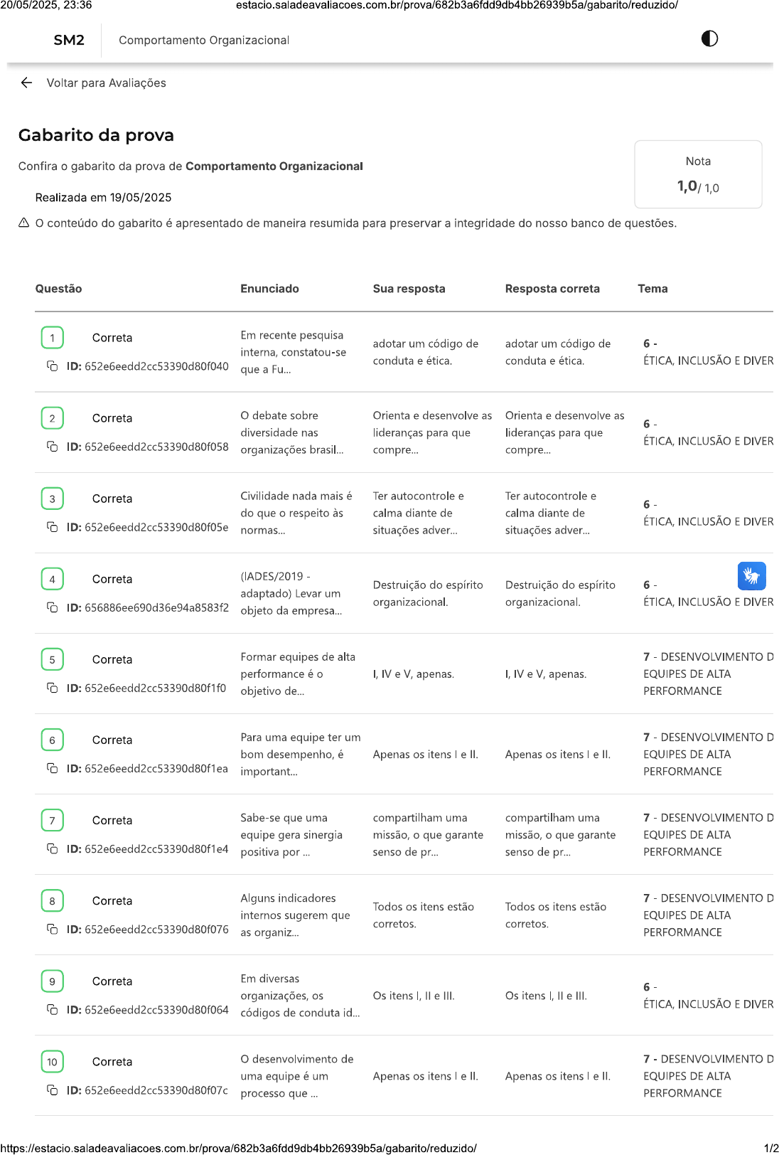 20/05/2025, 23:36 SM2 Comportamento Organizacional Voltar para Avaliações Gabarito da prova Confira o gabarito da prova de Comportamento Organizacional Nota Realizada em 19/05/2025 conteúdo do gabarito é apresentado de maneira resumida para preservar a integridade do nosso banco de questões. Questão Enunciado Sua resposta Resposta correta Tema 1 Correta Em recente pesquisa adotar um código de adotar um código de 6 interna, constatou-se conduta e ética. conduta e ética. ID: 652e6eedd2cc53390d80f040 ÉTICA, INCLUSÃO E DIVER que a Fu... 2 Correta debate sobre Orienta e desenvolve as Orienta e desenvolve as 6 diversidade nas lideranças para que lideranças para que ÉTICA, INCLUSÃO E DIVER ID: 652e6eedd2cc53390d80f058 organizações brasil... compre... compre... 3 Correta Civilidade nada mais é Ter autocontrole e Ter autocontrole e 6 do que respeito às calma diante de calma diante de ÉTICA, INCLUSÃO E DIVER ID: normas... situações adver... situações adver... 4 Correta (IADES/2019 Destruição do espírito Destruição do espírito 6 adaptado) Levar um ID: 656886ee690d36e94a8583f2 organizacional. organizacional. ÉTICA, INCLUSÃO E DIVER objeto da empresa... 5 Correta Formar equipes de alta 7 DESENVOLVIMENTO D performance é I, IV e V, apenas. I, IV e V, apenas. EQUIPES DE ALTA ID: 652e6eedd2cc53390d80f1f0 objetivo de... PERFORMANCE 6 Correta Para uma equipe ter um 7 DESENVOLVIMENTO D bom desempenho, é Apenas os itens e II. Apenas os itens e II. EQUIPES DE ALTA ID: 652e6eedd2cc53390d80f1ea important... PERFORMANCE 7 Correta Sabe-se que uma compartilham uma compartilham uma 7 DESENVOLVIMENTO D equipe gera sinergia missão, o que garante missão, o que garante EQUIPES DE ALTA ID: 652e6eedd2cc53390d80f1e4 positiva por senso de pr... senso de pr... PERFORMANCE 8 Correta Alguns indicadores 7 DESENVOLVIMENTO D Todos os itens estão Todos os itens estão internos sugerem que EQUIPES DE ALTA corretos. corretos. ID: 652e6eedd2cc53390d80f076 as organiz... PERFORMANCE 9 Correta Em diversas 6 organizações, os Os itens I, e III. Os itens I, e III. ÉTICA, INCLUSÃO E DIVER ID: 652e6eedd2cc53390d80f064 códigos de conduta id... 10 Correta O desenvolvimento de 7 DESENVOLVIMENTO D uma equipe é um Apenas os itens e II. Apenas os itens e II. EQUIPES DE ALTA ID: 652e6eedd2cc53390d80f07c processo que PERFORMANCE 1/220/05/2025, 23:36 i Encontrou algum problema? Você pode copiar o ID da questão e abrir um requerimento. Na tela inicial do Campus Virtual (SIA), acesse "Atendimento > Requerimento > Novo > Currículo/Aula/horário > Analisar ambiente de 2/2