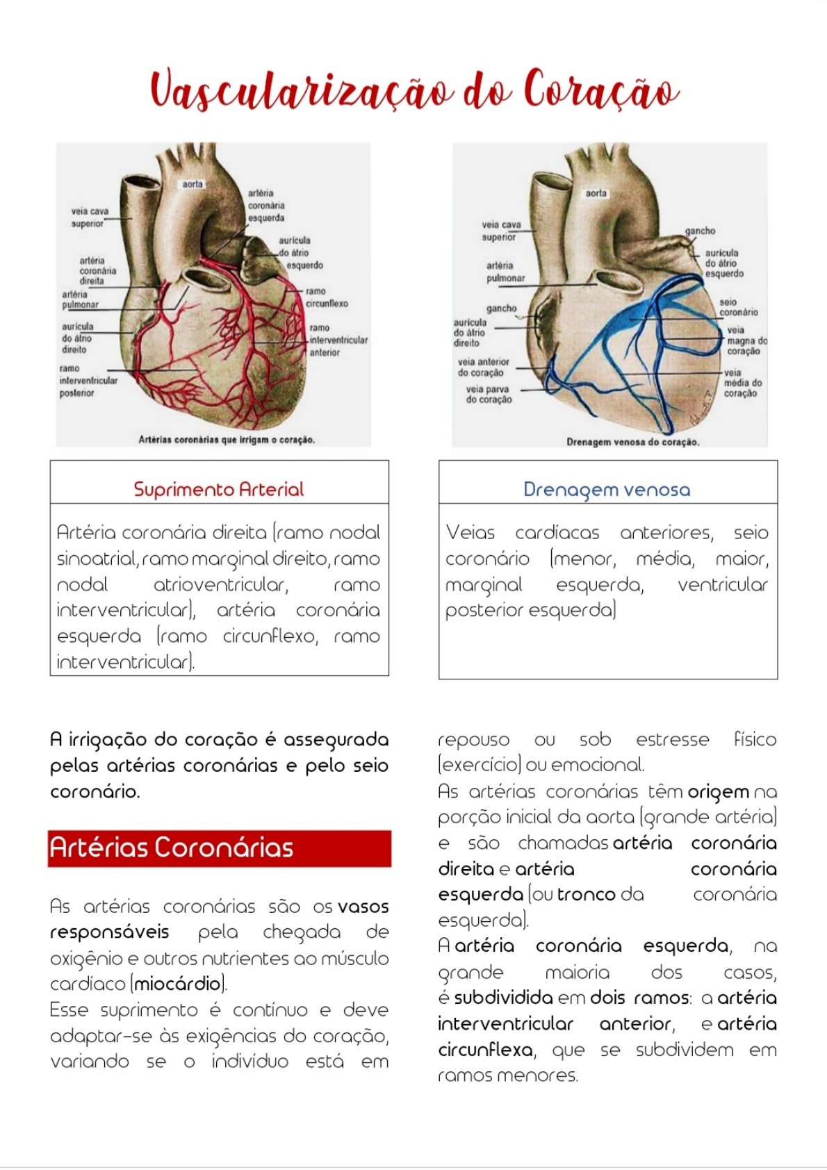 Vascularização do Coração aorta artéria aorta coronária veia cava esquerda superior veia cava gancho aurícula superior do átrio aurícula artéria esquerdo artéria do átrio coronária direita pulmonar esquerdo ramo pulmonar circunflexo seio gancho coronário ramo do átrio veia do átrio interventricular direito magna do direito anterior coração veia anterior ramo do coração veia interventricular média do posterior veia parva coração do coração Artérias coronárias que irrigam 0 coração. Drenagem venosa do coração. Suprimento Arterial Drenagem venosa Artéria coronária direita (ramo nodal Veias cardíacas anteriores, seio sinoatrial, ramo marginal direito, ramo coronário (menor, média, maior, nodal atrioventricular, ramo marginal esquerda, ventricular artéria coronária posterior esquerda) esquerda (ramo circunflexo, ramo interventricular]. A irrigação do coração é assegurada repouso sob estresse físico pelas artérias coronárias e pelo seio (exercício) emocional. coronário. As artérias coronárias têm origem na porção inicial da aorta (grande artéria) Artérias Coronárias e são chamadas artéria coronária direita e artéria coronária esquerda (ou tronco da coronária As artérias coronárias são vasos esquerda]. responsáveis pela chegada de A artéria coronária esquerda, na oxigênio e outros nutrientes ao músculo cardíaco grande maioria dos casos, é subdividida em dois ramos: a artéria Esse suprimento é contínuo e deve interventricular anterior, e artéria adaptar-se às exigências do coração, variando se indivíduo está em circunflexa, que se subdividem em ramos menores.A artéria coronária direita também se magnitude que ramos da coronária subdivide em ramos, porém de menor esquerda. Artérias Coronárias e Veias Cardíacas Face Esternocostal Ramo para o nó sinoatrial (SA) (ramo da veia cava superior) Artéria coronária esquerda Ramo da artéria coronária esquerda Ramo atrial anterior direito Veia cardíaca maior da artéria coronária direita Veias cardíacas anteriores Ramo interventricular anterior (descendente anterior esquerda) da artéria coronária esquerda Veia cardíaca menor Ramo marginal direito da artéria coronária direita Artéria coronária direita A artéria marginal direita surge da ACD Distribuição das Artérias e se move ao longo da borda direita e Coronárias inferior do coração em direção ao ápice. Em geral, a área do coração pela qual A Artéria Coronária Direita continua na uma artéria passa será a área que ela superfície posterior do coração, ainda perfunde. correndo ao longo do sulco coronário. A artéria interventricular A artéria coronária direita (ACD) passa à posteriorsurge então da ACD e seque direita do tronco pulmonar e corre ao sulco interventricular posterior em longo do sulco coronário antes de se direção ao ápice do coração. ramificar.A artéria coronária esquerda (ACE) posterior a anastomose com ramo passa entre o lado esquerdo do tronco interventricular posterior. pulmonar e a aurícula esquerda. 0 ramo circunflexoseque sulco A ACE se divide no ramo coronário para a borda esquerda e interventricular anteriore no ramo para a superfície posterior do coração. circunflexo. 0 ramo interventricular anterior seque Isso dá origem ao ramo marginal sulco interventricular esquerdo, que seque a borda anterior em direção ao ápice do esquerda do coração. coração, onde continua na superfície Artéria Coronária Esquerda Vista Arteriográfica Ramo anterior (artéria descendente anterior esquerda) Ramo lateral do ramo circunflexo Ramo cincunflexo Ramos perfurantes para septo Artéria coronária esquerda principal Arteriografia Ramo diagonal da anterior Interventricular anterior Ramo atrioventricular da cincunflexa Ramos póstero-laterais do ramo circunflexo Vista oblíqua anterior direitaArtéria Coronária Esquerda Vista Arteriográfica Artéria coronária esquerda principal Ramo cincunflexo Ramo interventricular anterior (artéria descendente anterior esquerda) Arteriografia Ramos diagonais da interventricular anterior Ramo atrioventricular da cincunflexa Ramo lateral do ramo circunflexo Ramos perfurantes para septo interventricular Ramos póstero-laterais do ramo circunflexo Vista anterior esquerda Veias cardíacas Dentro do átrio direito, a abertura do seio coronário está localizada entre sanque viaja do subendocárdio para orifício atrioventricular direito e as veias da superfície, que são orifício da veia cava inferior. pequenos tributários que percorrem o miocárdio. Existem cinco tributárias que drenam Estes, por sua vez, drenam para veias para seio coronário: maiores que se esvaziam no seio A veia cardíaca maior / Magna é a principal tributária. seio coronário é a principal veia do coração, localizada na superfície Ela se origina no ápice do coração e posterior do sulco coronário, que seque sulco interventricular anterior corre entre átrio esquerdo e até sulco coronário e ao redor do ventrículo esquerdo. lado esquerdo do coração paraunir-se 0 seio coronário é drenado para ao seio coronário. átrio direito.A veia cardíaca menor / As 2 veias cardíacas finais também Parva também está localizada estão na superfície posterior do na superfície anterior do coração: coração. no lado posterior esquerdo está Isso passa pelo lado direito do coração a veia marginal esquerda. para se juntar ao seio coronário. no centro está a veia posterior do ventrículo esquerdo, que Outra veia que drena o lado corre ao longo do sulco interventricular posterior para se direito do coração é a veia cardíaca média / veia juntar ao seio coronário. interventricular posterior. Está localizada na superfície posterior do coração. Artérias Coronárias e Veias Cardíacas Face Esternocostal Ramo para o nó sinoatrial (SA) (ramo da veia cava superior) Artéria coronária esquerda Ramo cincunflexo da artéria coronária esquerda 