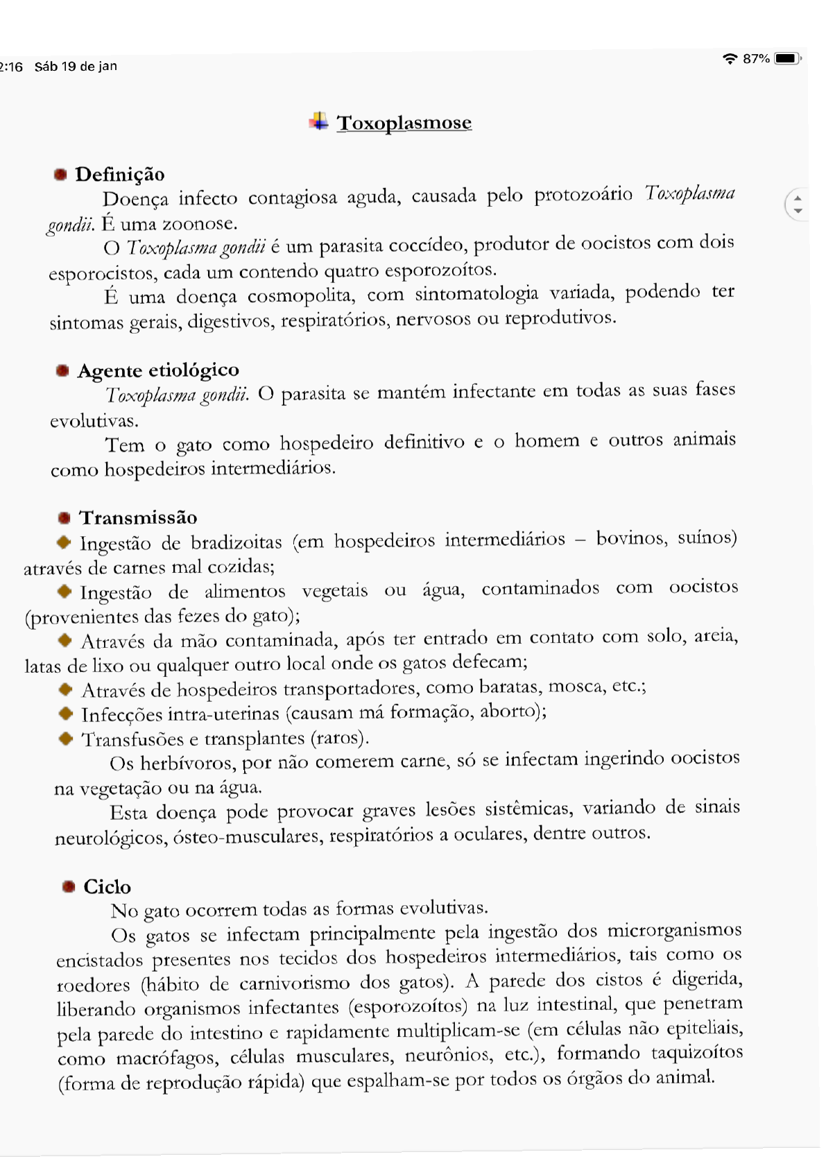 87% 2:16 Sáb 19 de jan Toxoplasmose Definição Doença infecto contagiosa aguda, causada pelo protozoário Toxoplasma gondii. É uma zoonose. O Toxoplasma gondii é um parasita coccídeo, produtor de oocistos com dois esporocistos, cada um contendo quatro esporozoítos. É uma doença cosmopolita, com sintomatologia variada, podendo ter sintomas gerais, digestivos, respiratórios, nervosos ou reprodutivos. Agente etiológico Toxoplasma gondii. O parasita se mantém infectante em todas as suas fases evolutivas. Tem O gato como hospedeiro definitivo e O homem e outros animais como hospedeiros intermediários. Transmissão Ingestão de bradizoitas (em hospedeiros intermediários bovinos, suínos) através de carnes mal cozidas; Ingestão de alimentos vegetais ou água, contaminados com oocistos (provenientes das fezes do gato); Através da mão contaminada, após ter entrado em contato com solo, areia, latas de lixo ou qualquer outro local onde OS gatos defecam; Através de hospedeiros transportadores, como baratas, mosca, etc.; Infecções intra-uterinas (causam má formação, aborto); Transfusões e transplantes (raros). Os herbívoros, por não comerem carne, só se infectam ingerindo oocistos na vegetação ou na água. Esta doença pode provocar graves lesões sistêmicas, variando de sinais neurológicos, ósteo-musculares, respiratórios a oculares, dentre outros. Ciclo No gato ocorrem todas as formas evolutivas. Os gatos se infectam principalmente pela ingestão dos microrganismos encistados presentes nos tecidos dos hospedeiros intermediários, tais como OS roedores (hábito de carnivorismo dos gatos). A parede dos cistos é digerida, liberando organismos infectantes (esporozoítos) na luz intestinal, que penetram pela parede do intestino e rapidamente multiplicam-se (em células não epiteliais, como macrófagos, células musculares, neurônios, etc.), formando taquizoítos (forma de reprodução rápida) que espalham-se por todos OS órgãos do animal.22:16 Sáb 19 de jan 86% Simultaneamente O parasito reproduz-se (sexualmente, com a formação de merozoitos que originam macrogametas) nas células da parede intestinal, denominando-se ciclo entero-epitelial, culminando na formação de oocistos, que são excretados com as fezes. Na medida que se produz a resposta imune no gato, a eliminação de oocistos é detida e OS taquizoítos reproduzem-se cada vez mais lentamente, modulando-se em bradizoítos (forma de reprodução lenta) que se organizam em cistos teciduais, localizados nos mais diversos tecidos do corpo dos animais. Os gatos que não se expuseram previamente começam a eliminar oocistos entre três e dez dias após a ingestão de bradizoítos e continuam a eliminação por até dez a quatorze dias, produzindo vários milhões de oocistos. Epidemiologia Os felídeos são ponto-chave da epidemiologia da toxoplasmose, sendo únicos hospedeiros da forma sexuada do parasita e, por eliminarem oocistos nas fezes, são a única fonte de infecção dos animais herbívoros. Nestes animais como suínos, caprinos, ovinos, roedores e outros mais, ocorre apenas ciclo extra-intestinal, com proliferação de taquizoítos nos órgãos e, com a resposta imune, desenvolvem-se cistos teciduais (com bradizoítos). Estes permanecem viáveis e são infectantes para gatos e para OS outros hospedeiros intermediários como homem e cão. Nestes últimos, a infecção geralmente pode acontecer pela ingestão de oocistos, presentes no solo ou alimentos de origem vegetal, ou de carne com cistos tissulares. Patogenia A patogenia está diretamente ligada à divisão taquizoíta intracelular, pois causa morte celular, gerando necrose no baço, fígado e pulmões do animal hospedeiro e nos linfonodos mesentéricos pode causar linfoadenomegalia com focos de necrose. Se distribui por todo organismo, via linfática e hemática, na forma livre ou no interior dos macrófagos, podendo inclusive chegar ao SNC. Em três semanas originam bradizoítos, que se encistam principalmente no tecido nervoso e muscular, ficando hospedeiro como portador inaparente. Baixas de resistência por estresse, gestação, uso de corticóides, doenças intercorrentes e outras causas podem permitir reaparecimento da doença. Fetos abortados e natimortos revelam a transmissão congênita, transplacentária da toxoplasmose. Estes neonatos apresentam as mesmas lesões dos adultos. A transmissão congênita do T. gondii pode ocorrer quando a infecção aguda coincide com a prenhez, com conseqüências mais sérias aos fetos no primeiro terço ou metade da gestação, embora quanto mais adiantada a gestação, maior é a probabilidade da infecção fetal, porém com menos riscos de fetopatias graves. Primeiramente Toxoplasma gondii multiplica-se na placenta e então difunde-se para OS tecidos fetais. 722:16 Sáb 19 de jan 86% Sintomas Gatos raramente apresentam a doença clínica. Quando fazem, apresentam sintomas como dispnéia, hipertermia, apatia, anorexia, conjuntivite e rinite purulenta. A necropsia mostrará principalmente lesões necróticas focais (puntiformes) nos pulmões. Coelhos é a espécie mais afetada, com instalação rápida, sem sintomatologia aparente, havendo alta mortalidade. Morrem tanto coelhos adultos quanto jovens. O diagnóstico é dado pela necropsia, onde se observa esplenomegalia, com pontos branco-amarelados de aspecto necrótico. A impressão de fragmentos esplênicos fixados em metanol e corados pelo Giemsa, revelam OS taquizoitas. Cães doença febril, anorexia, tristeza, dispnéia e pneumonia, rinorréia e conjuntivite catarral, linfoadenomegalia e diarréia (quadro muito parecido com sinomose). Alguns animais mudam OS hábitos, ficam agressivos ou apáticos, podem apresentar sialorréia, convulsões, paresia e paralisias (diagnóstico diferencial com a raiva). Suínos é relativamente rara, sendo mais comum em leitões. Sinais pneumônicos, encefalíticos e aborto. Ovinos e caprinos é uma importante 