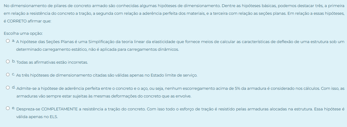 No dimensionamento de pilares de concreto armado são conhecidas algumas hipóteses de dimensionamento. Dentre as hipóteses básicas, podemos destacar três, a primeira em relação a resistência do concreto a tração, a segunda com relação a aderência perfeita dos materiais, e a terceira com relação as seções planas. Em relação a essas hipóteses, é CORRETO afirmar que: Escolha uma opção: a. A hipótese das Seções Planas é uma Simplificação da teoria linear da elasticidade que fornece meios de calcular as características de deflexão de uma estrutura sob um determinado carregamento estático, não é aplicada para carregamentos dinâmicos. b. Todas as afirmativas estão incorretas. C. As três hipóteses de dimensionamento citadas são válidas apenas no Estado limite de serviço. d. Admite-se a hipótese de aderência perfeita entre O concreto e O aço, ou seja, nenhum escorregamento acima de 5% da armadura é considerado nos cálculos. Com isso, as armaduras vão sempre estar sujeitas às mesmas deformações do concreto que as envolve. e. Despreza-se COMPLETAMENTE a resistência a tração do concreto. Com isso todo O esforço de tração é resistido pelas armaduras alocadas na estrutura. Essa hipótese é válida apenas no ELS.